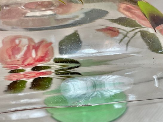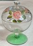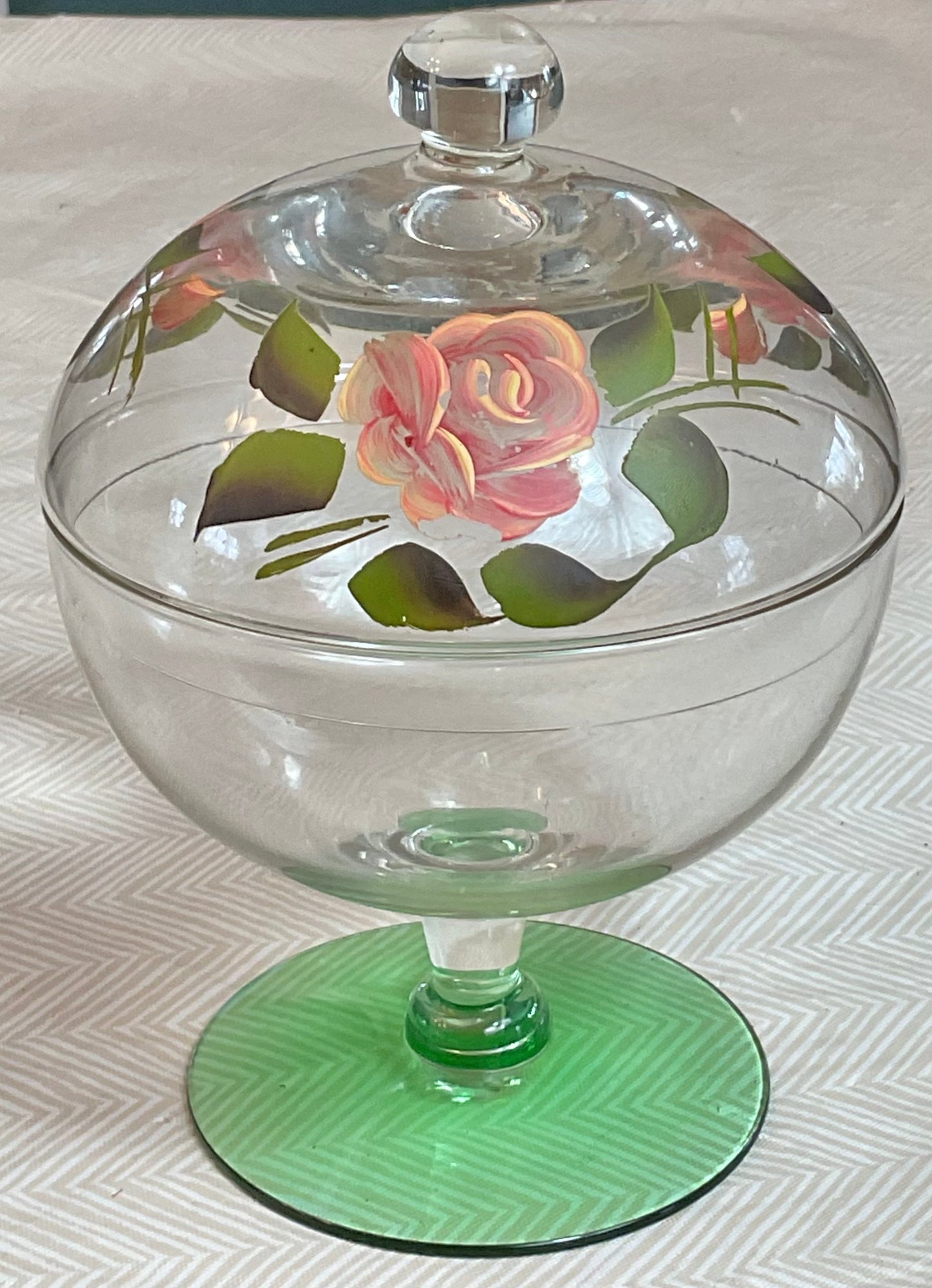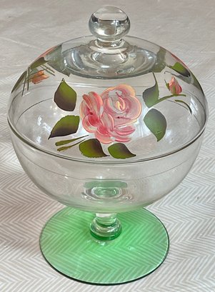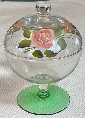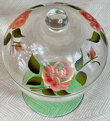 Hand Painted Rose Glass Covered Candy Dish - small lid rim chip - 7” tall - 5 1/8” wide - good used condition