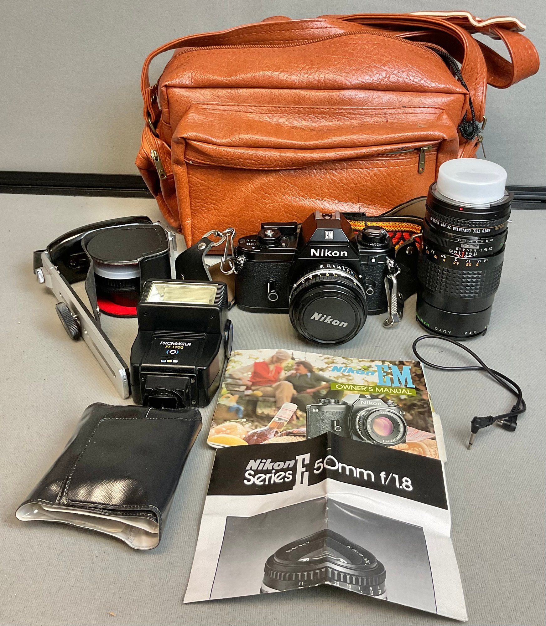 Nikon EM Camera & Accessories - bag, manual, filters, lenses, flash, handle - 35mm - untested - good used condition