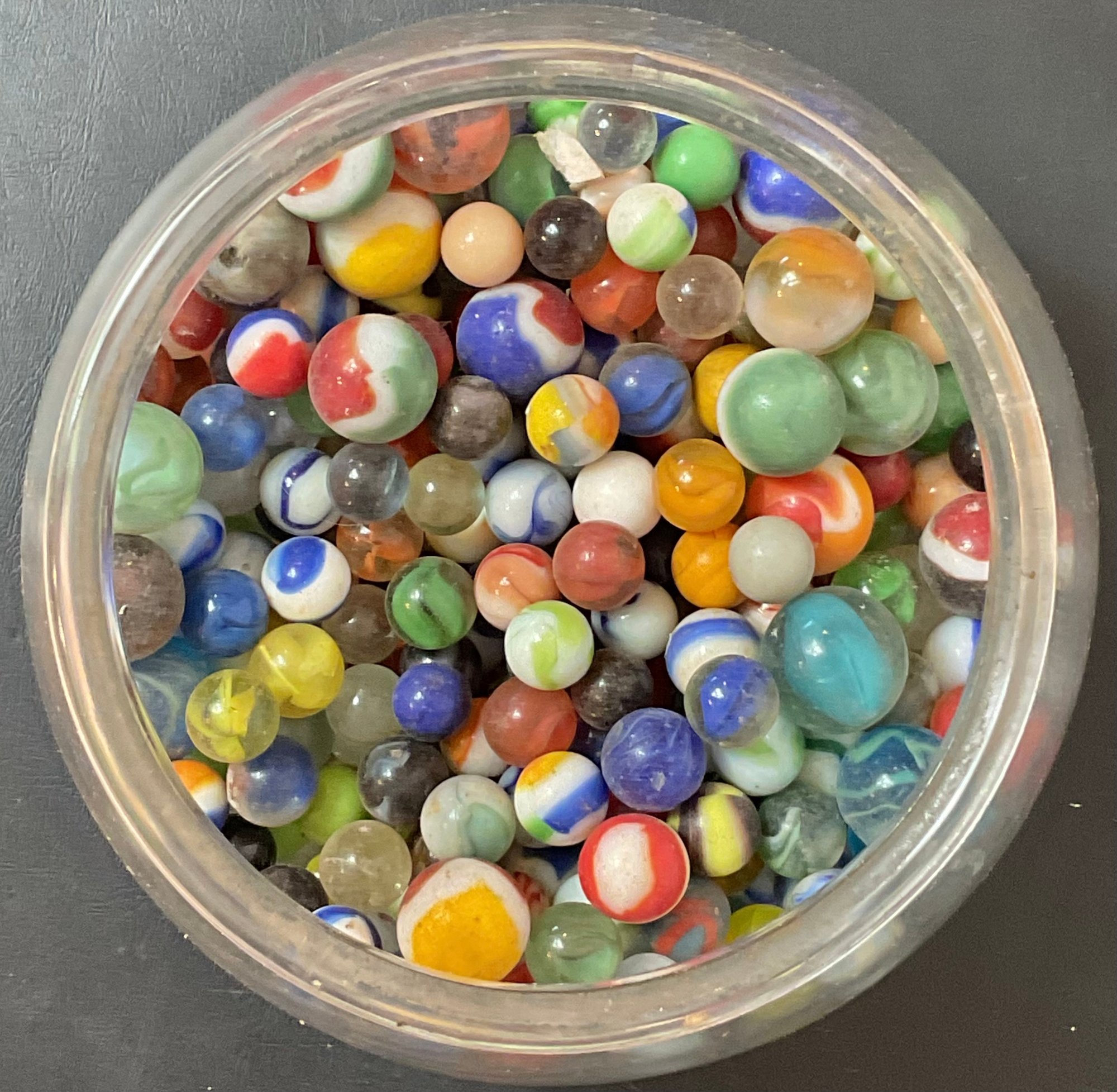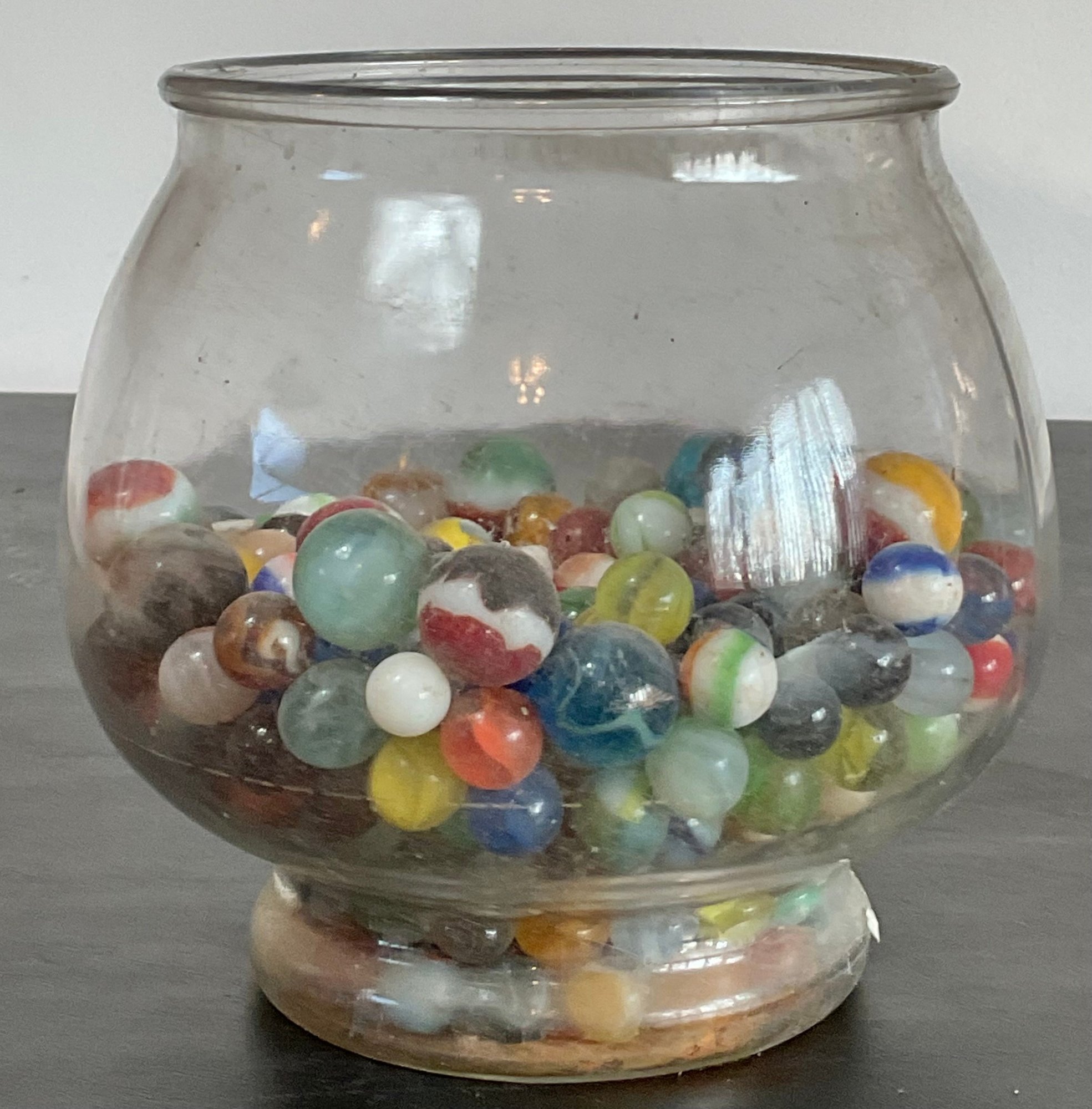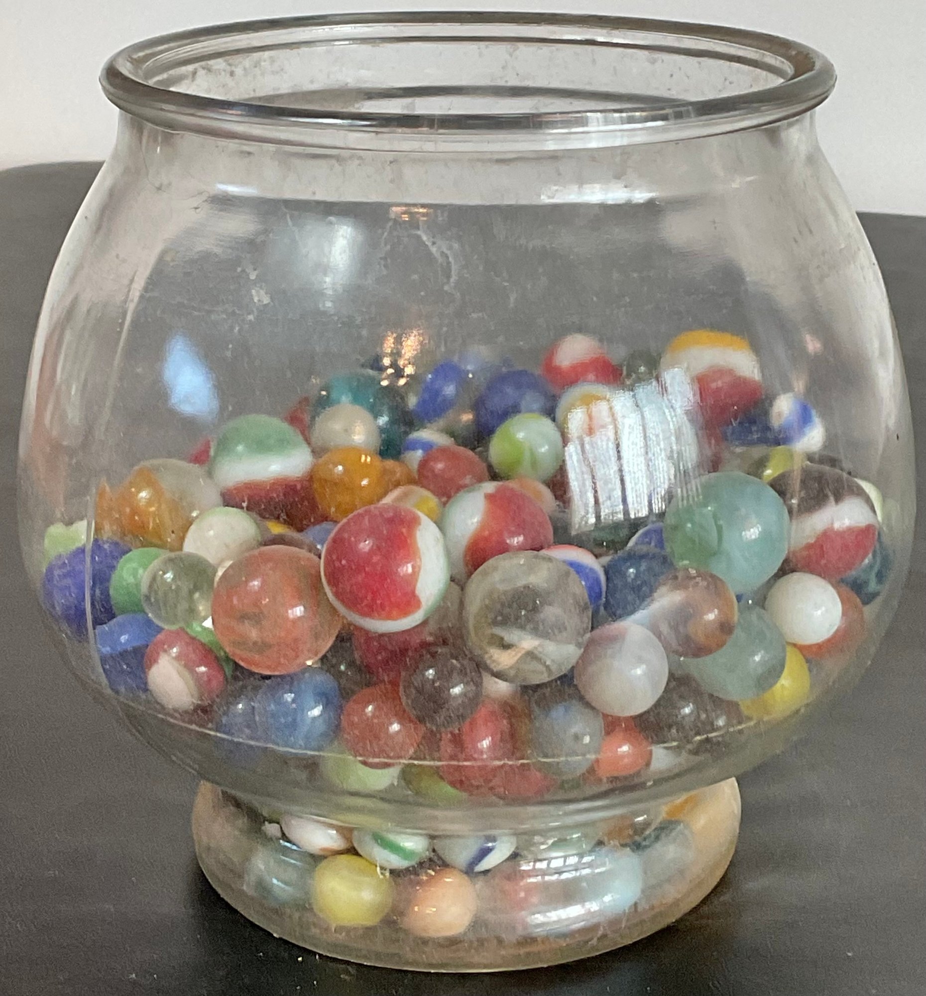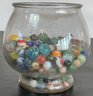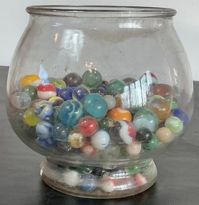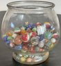 Large Bowl Vintage Marbles - unsearched, marbles still covered in dust - bowl 6.75” tall x 7” wide - good used condition