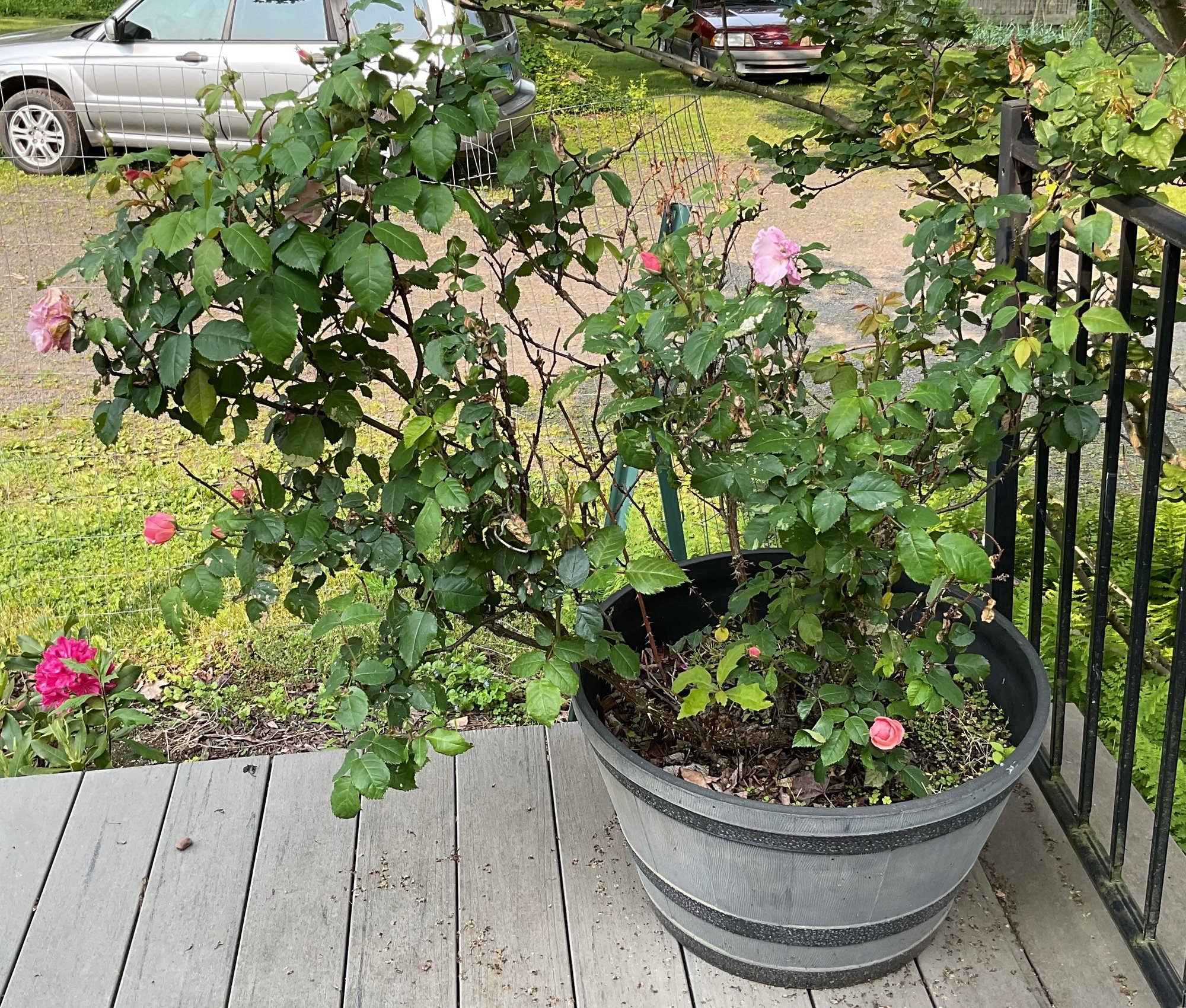 Large Potted Rose Bush - 45” tall - pot 13” tall x 22.25” wide - good used condition