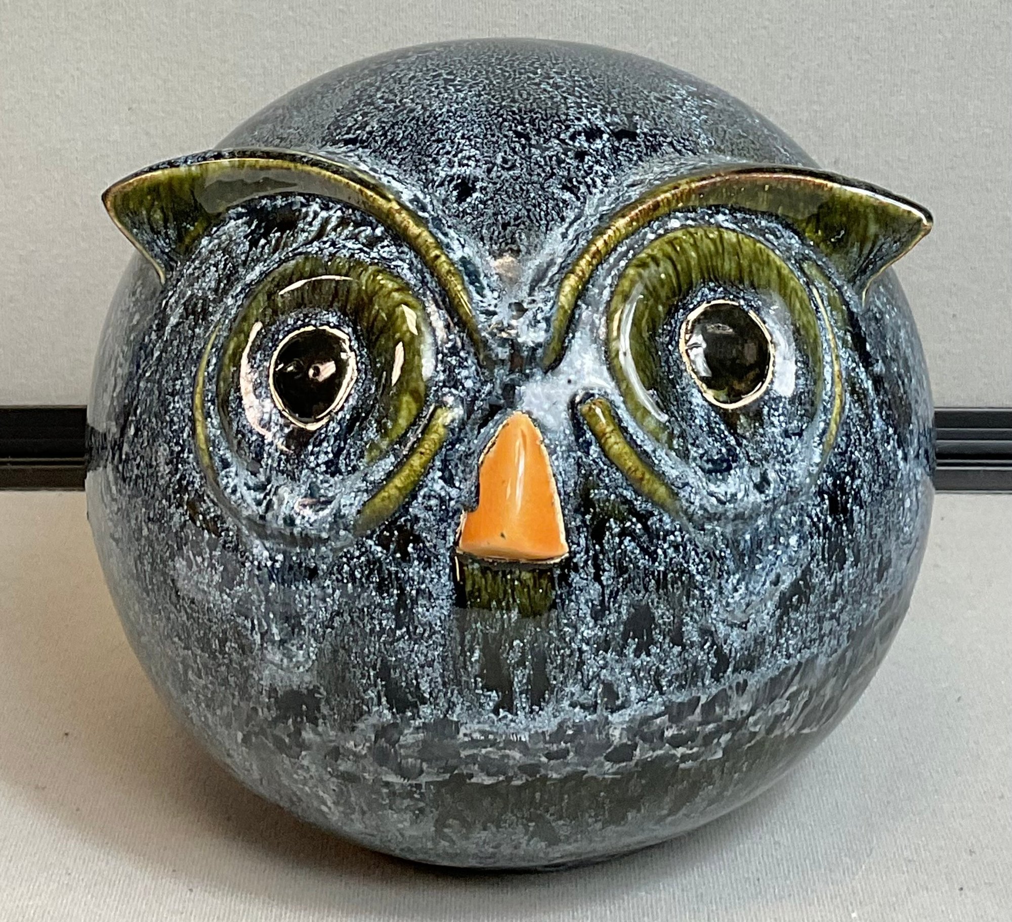 Large Round Glazed Pottery Owl - no chips - 8” tall x 8” wide - good used condition