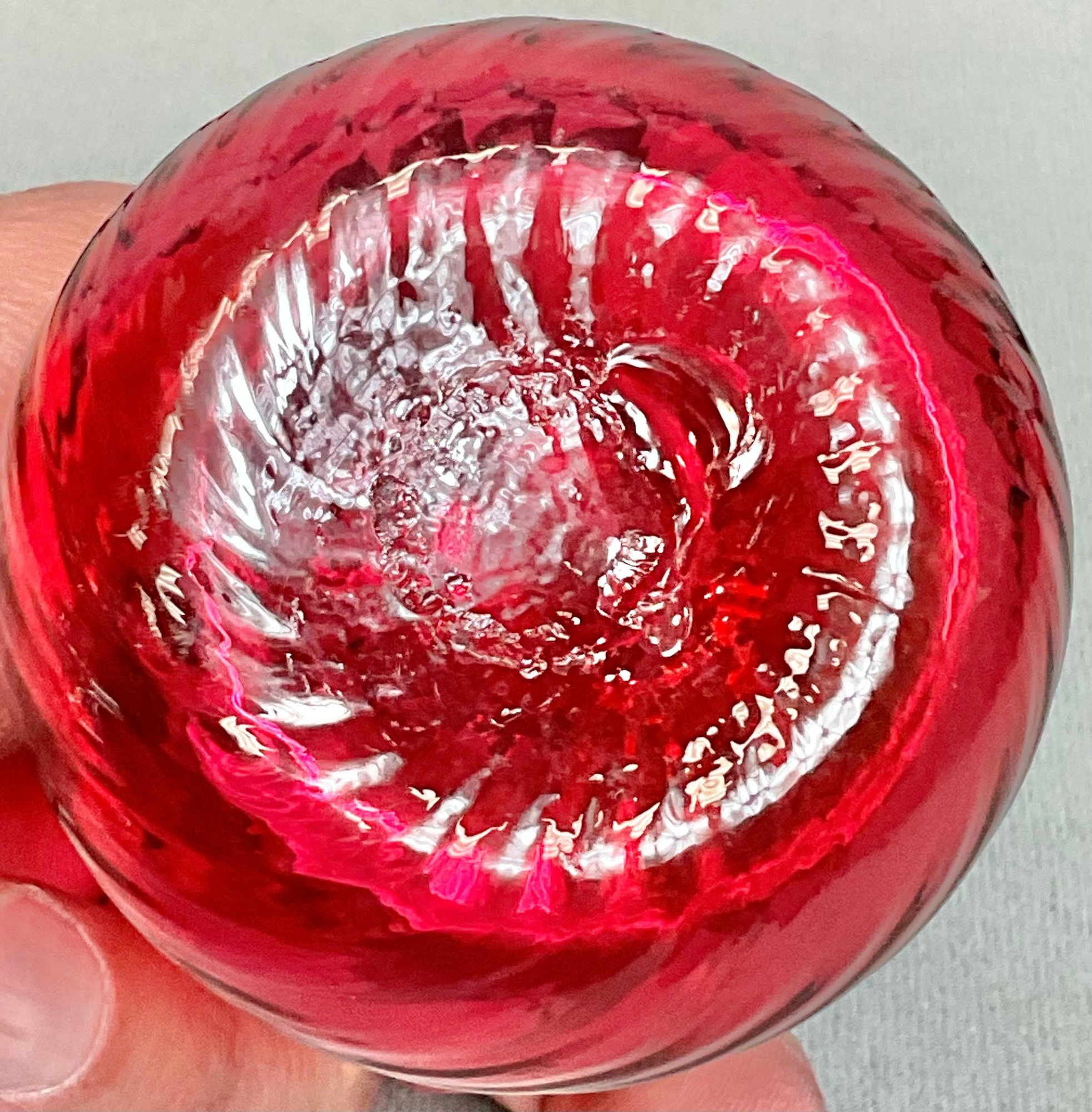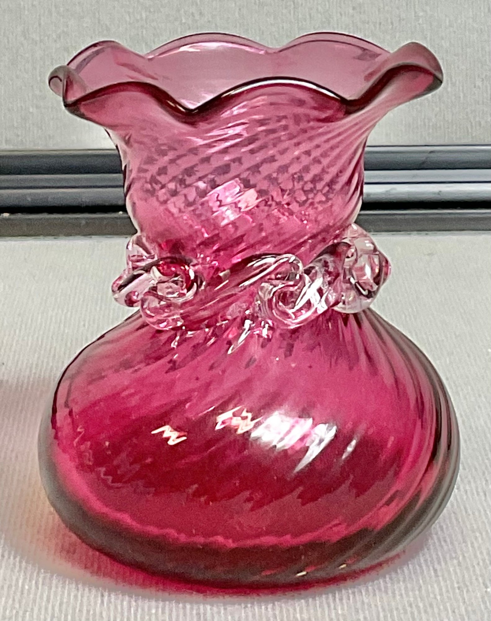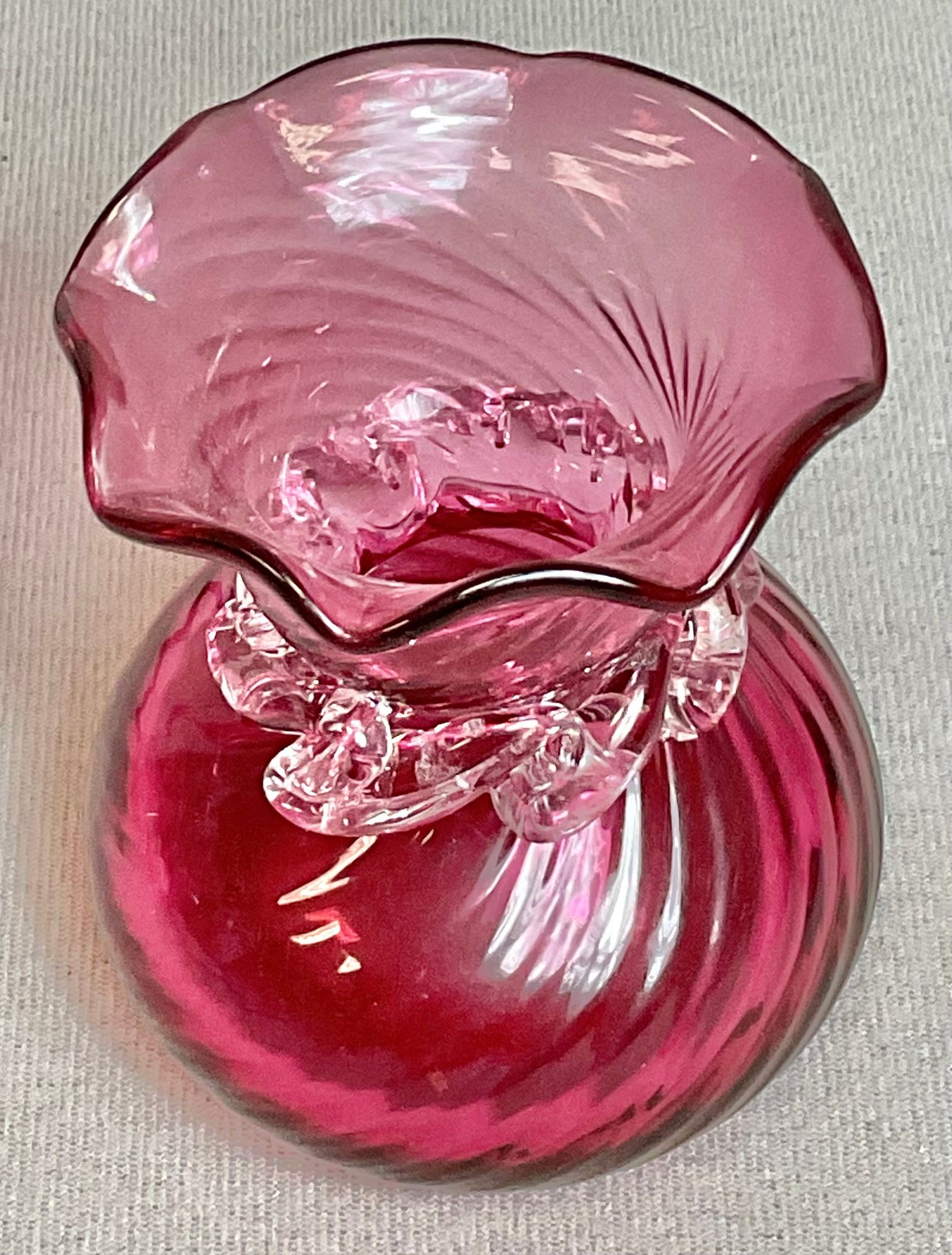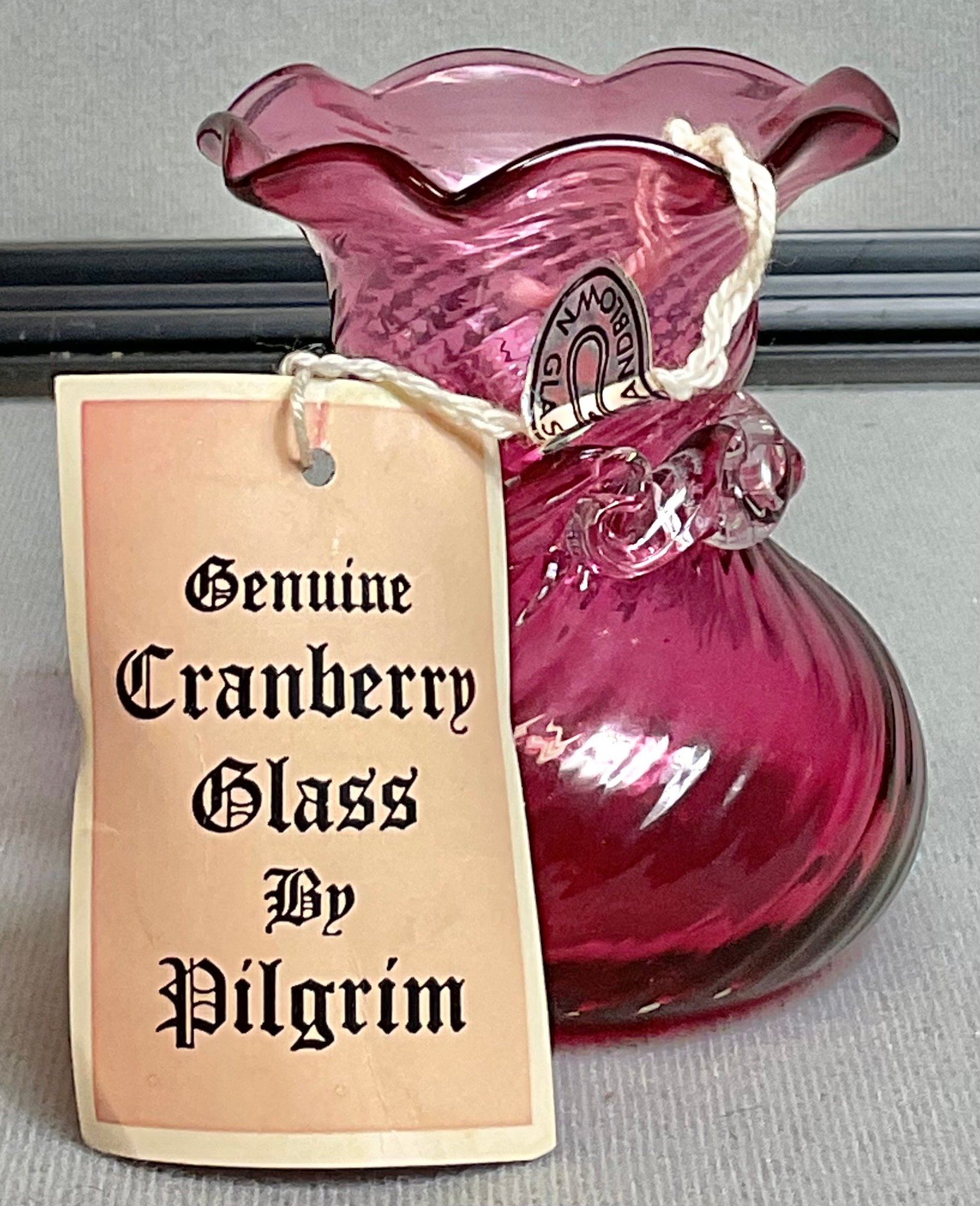 Pilgrim Cranberry Glass Hand Blown Swirl Vase - 3.25” - original label - good used condition