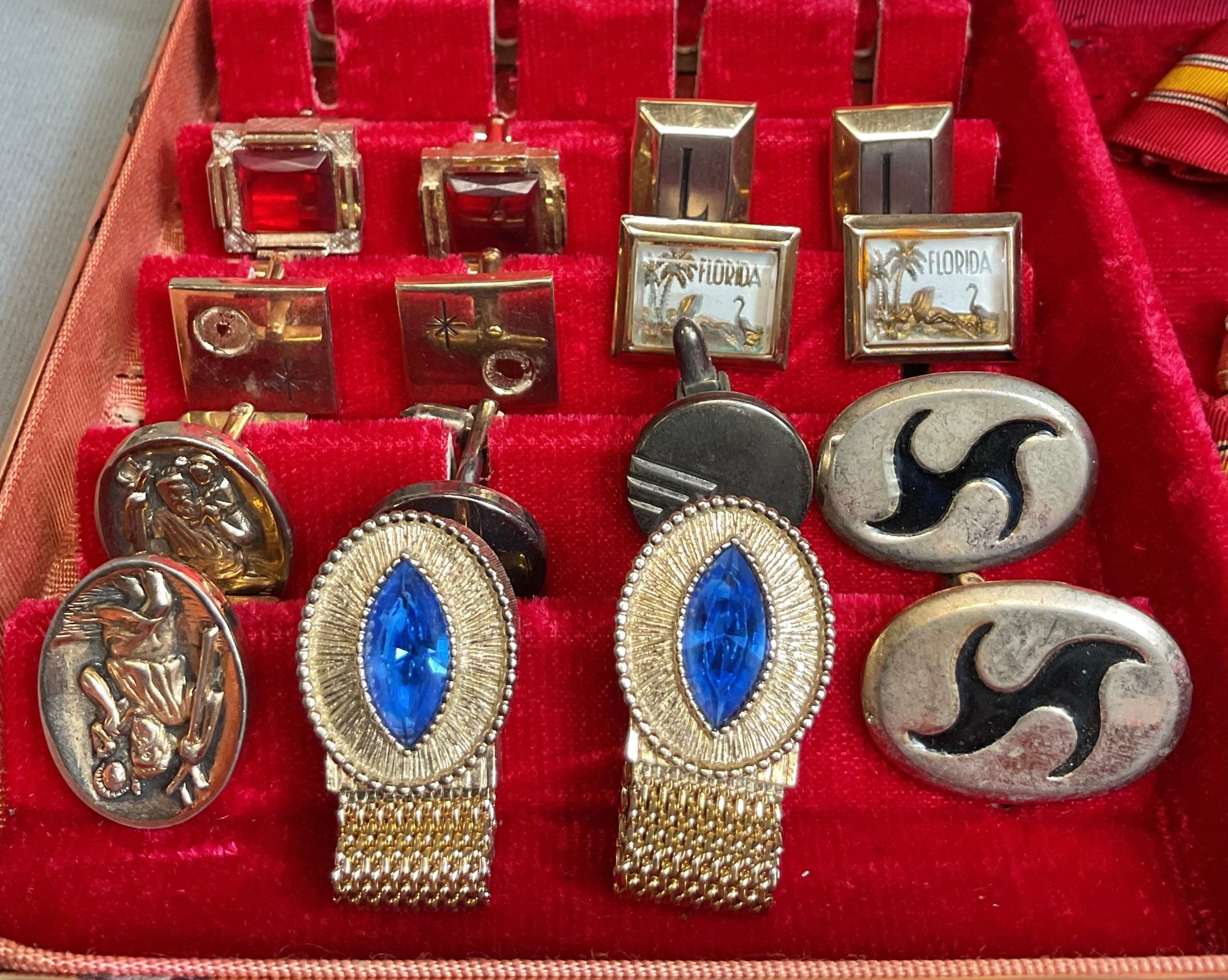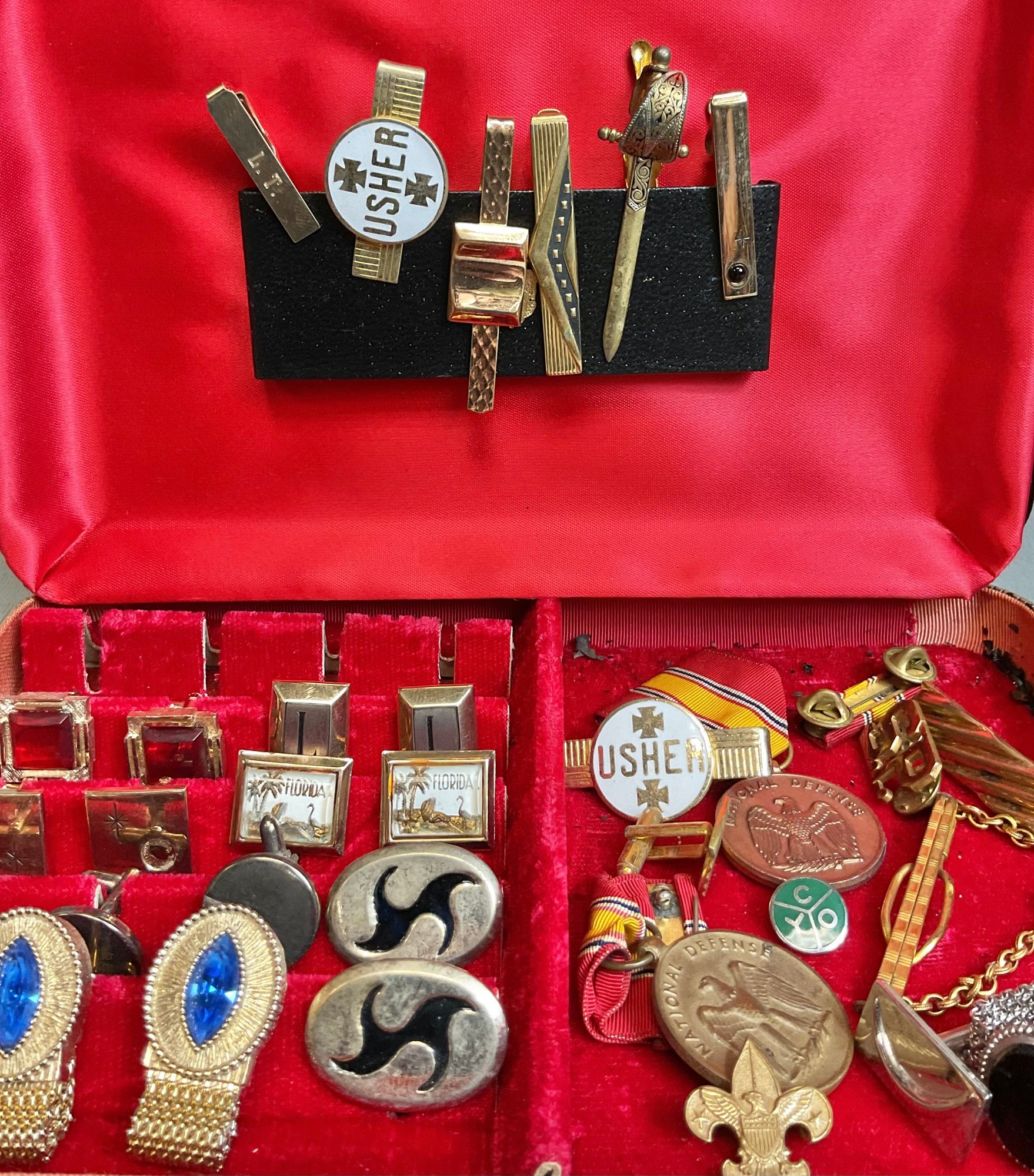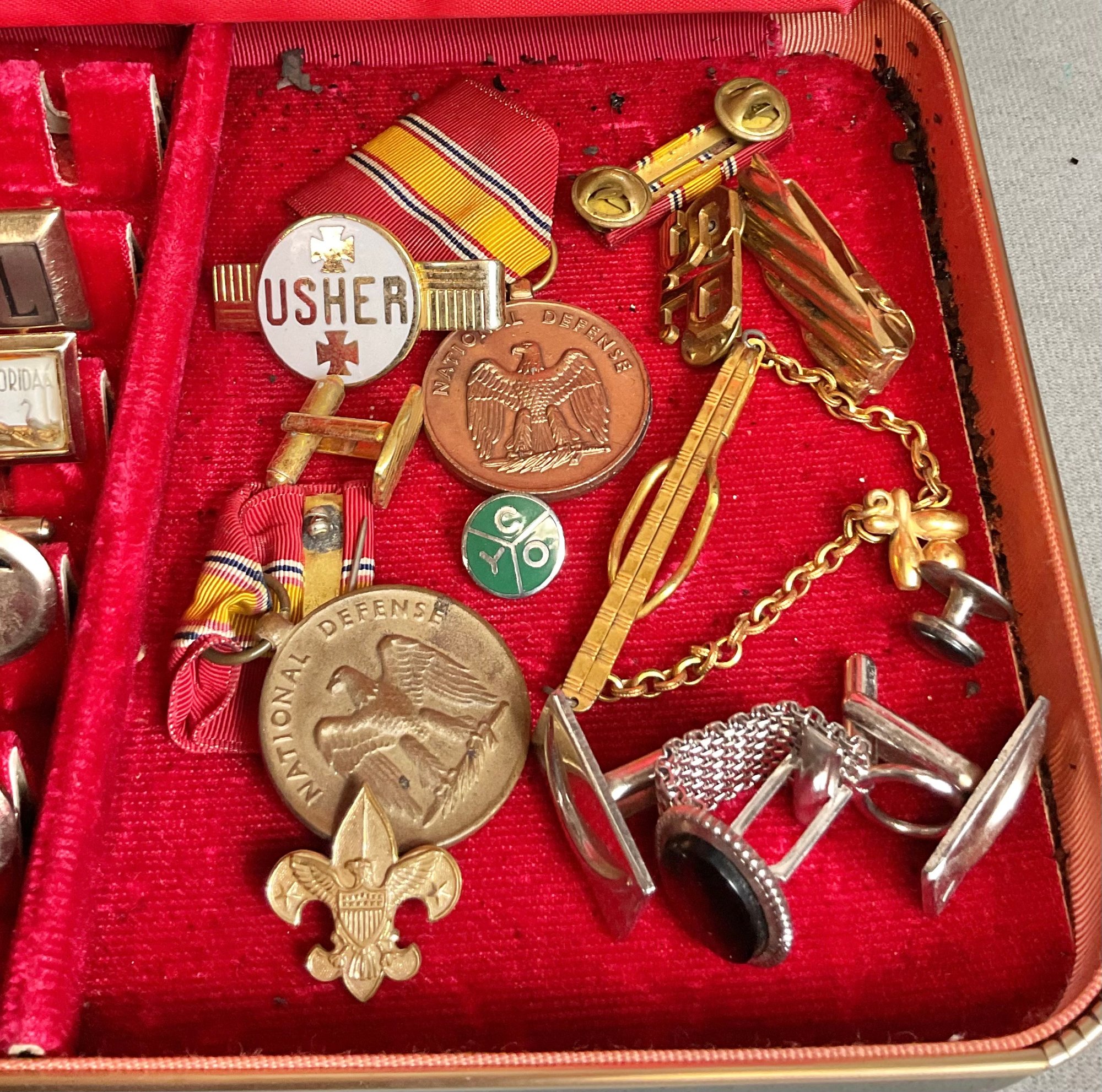 Mens Dresser Box - Cufflinks/ Tie Bars/ Defense Medals - assorted pairs - good used condition