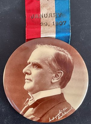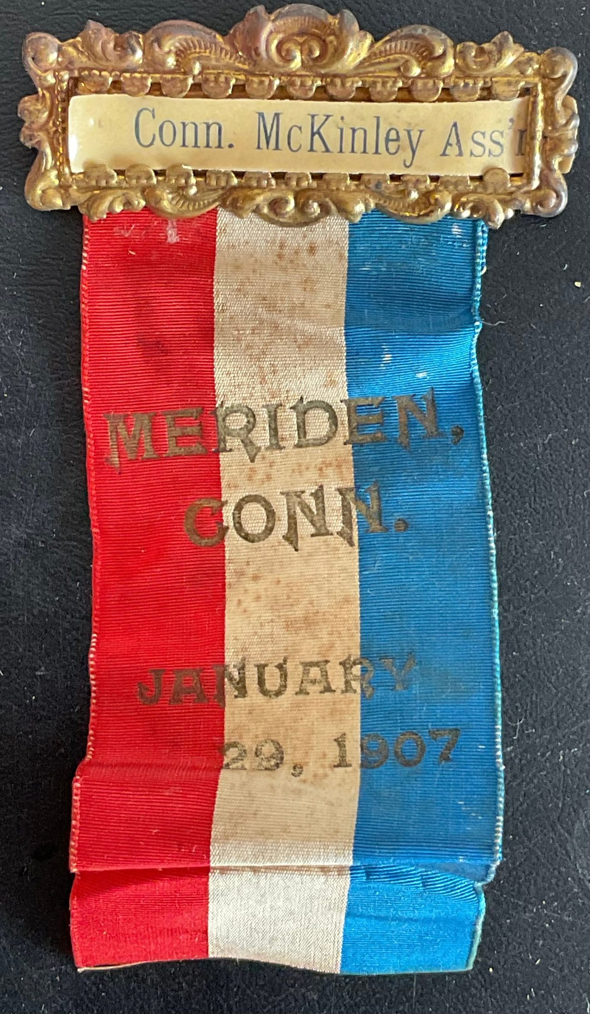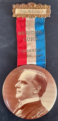 Meriden 1907 William McKinley Memorial Ribbon & Large Photo Button - button 3.5” - ribbon 5” - good used condition