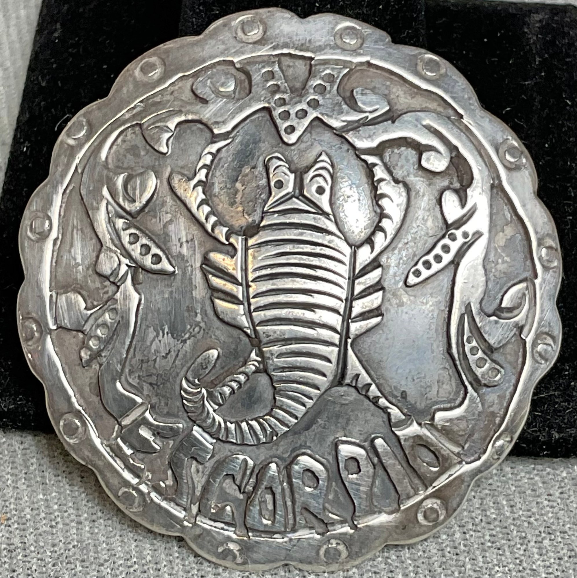 Mexico Sterling Scorpio Zodiac Brooch/ Pendant - 1.75” round - weighs 12.7 grams - good used condition