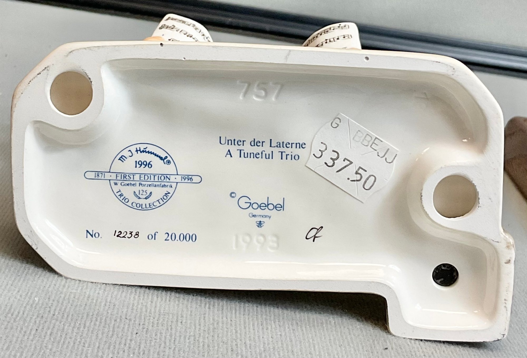 Goebel Hummel 1996 First Edition - A Tuneful Trio - with wooden base - limited edition 12238/20000 - no chips - 6 5/8” tall (not including base) - 4.75” long - 3.75” wide -good used condition