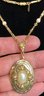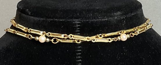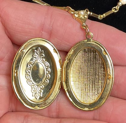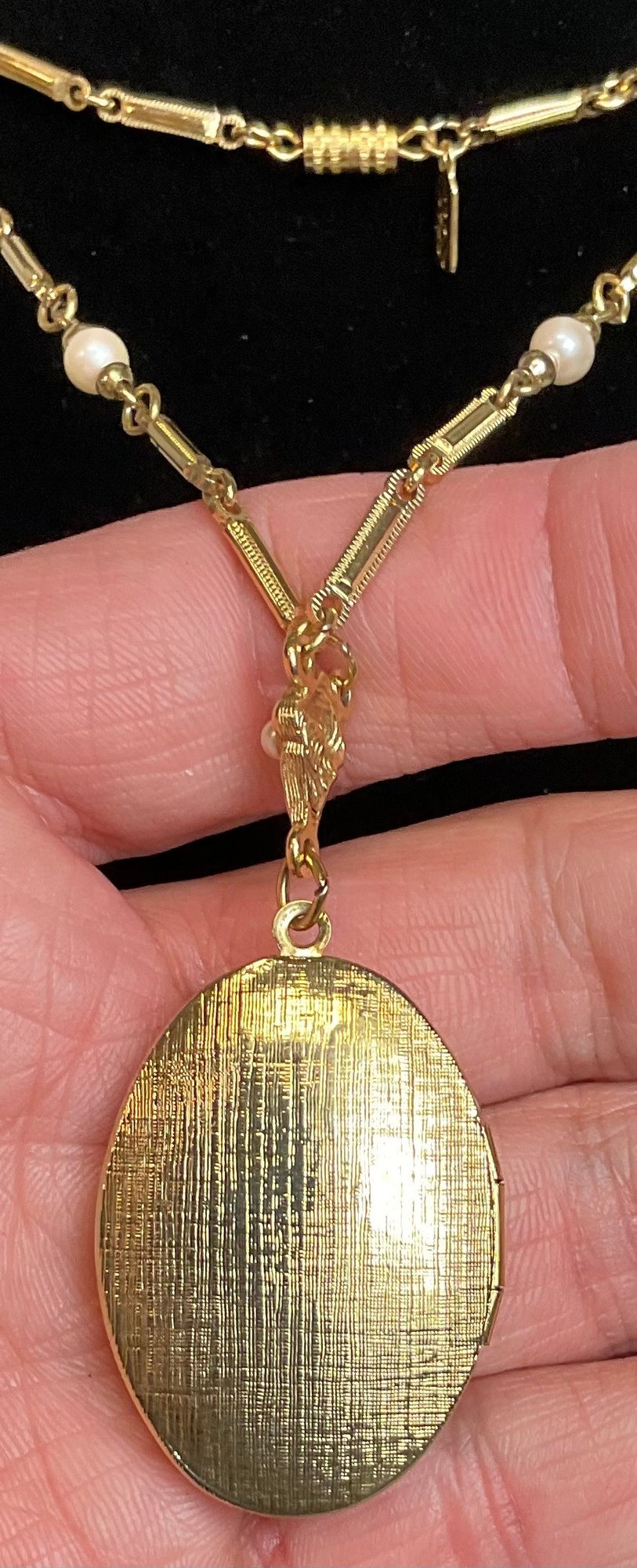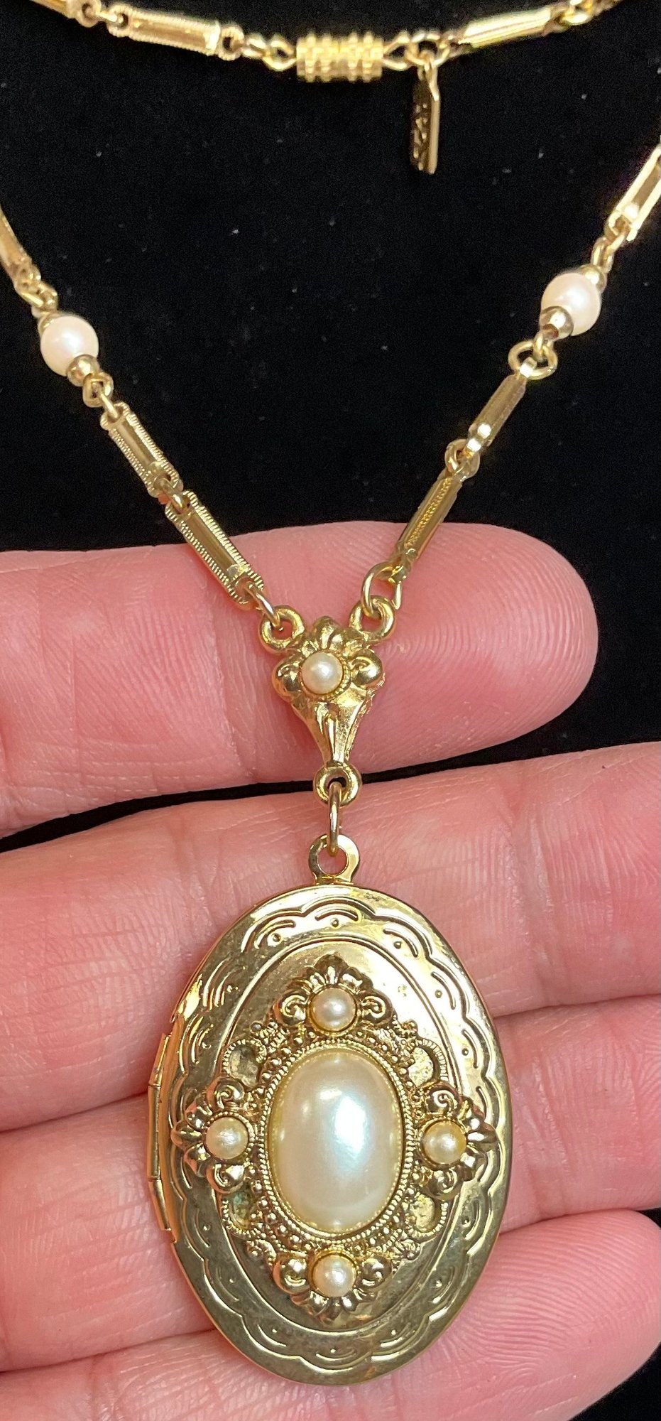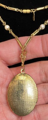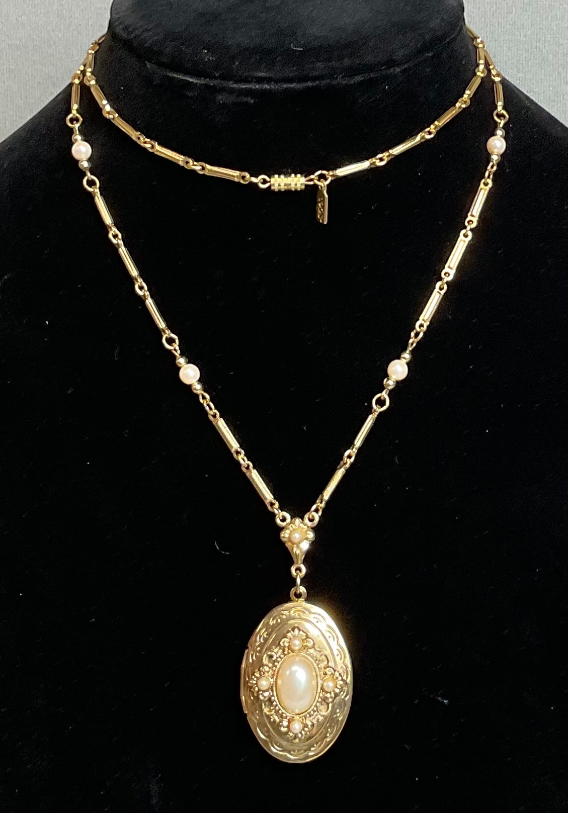 Gold Tone Faux Pearl Locket Necklace - 1928 - 30” long - locket 1.5” x 1” - good used condition