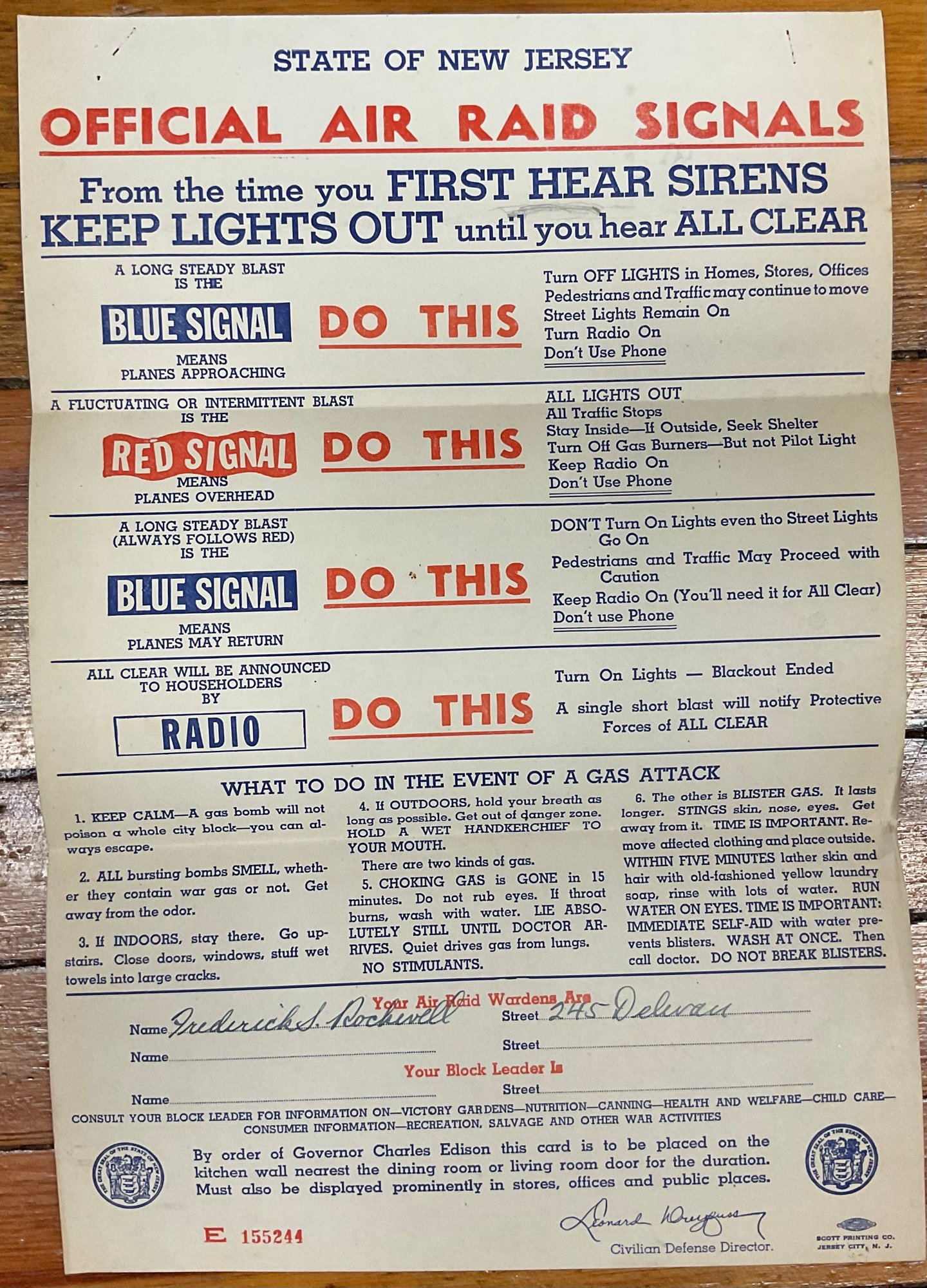 Original WW2 - New Jersey Official Air Raid Signals - Poster - folded up for 80 years - 15.5” x 10.5” - great condition