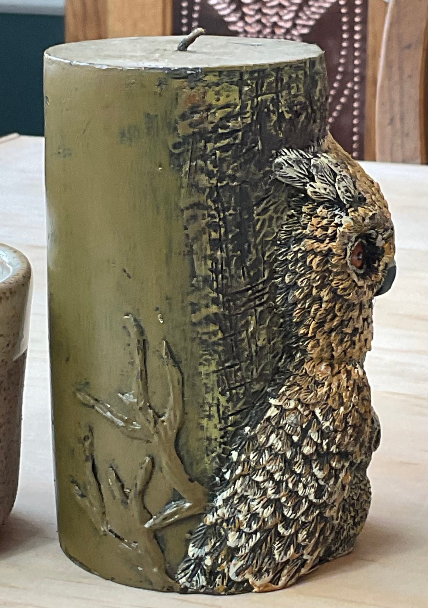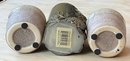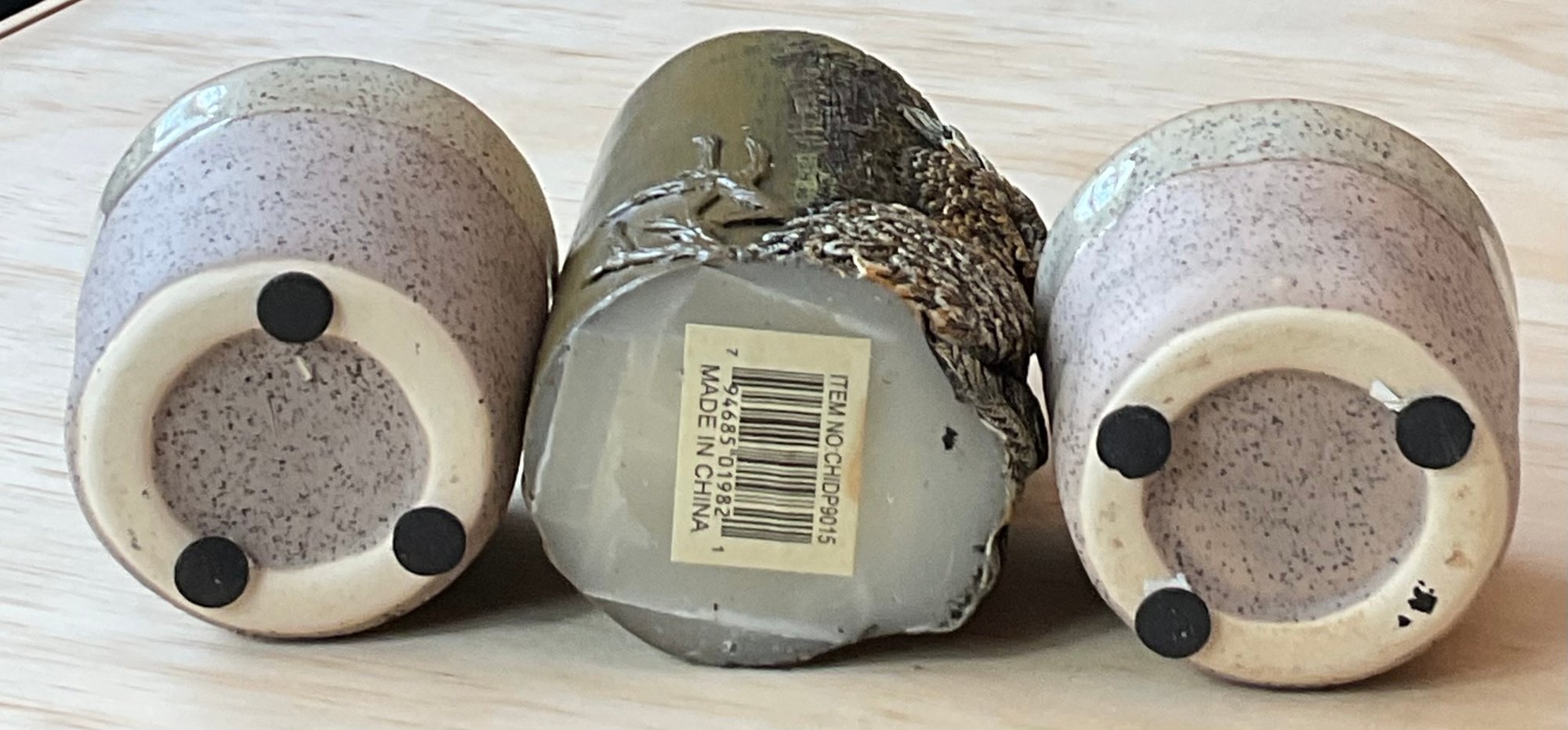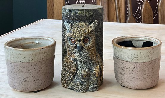 Owl Candle - 4 3/8” tall & 2 Stoneware Candle Holders - 2 3/8” tall - good used condition