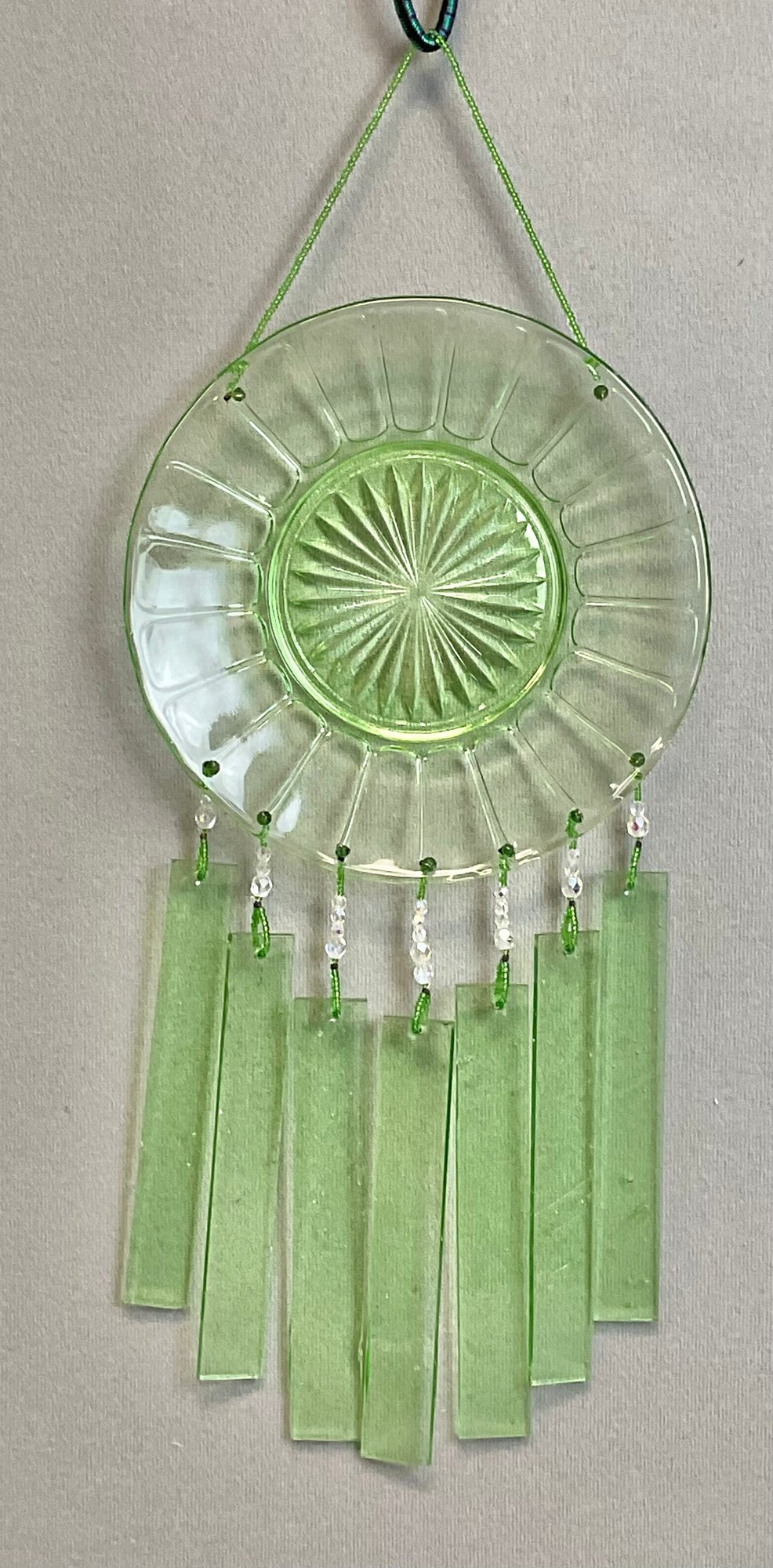 Green Depression Glass Saucer Wind Chime - saucer 6.25” (glows under black light) - chimes have 1 chip as seen in picture - measures 12.5” long - good used condition