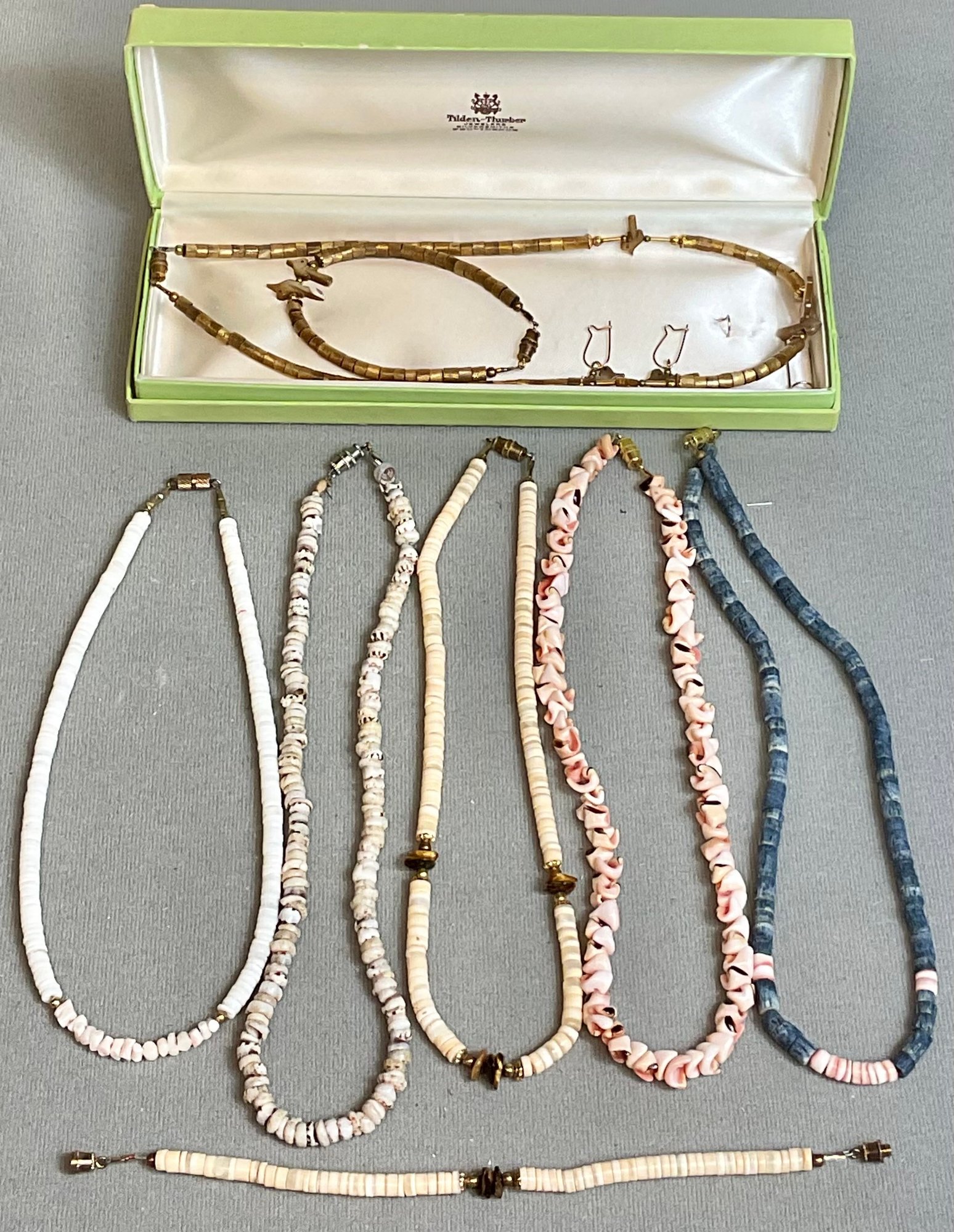 Shell Necklaces & Blue Coral Necklace - two bracelets & pair earrings - 7” to 17” long - good used condition