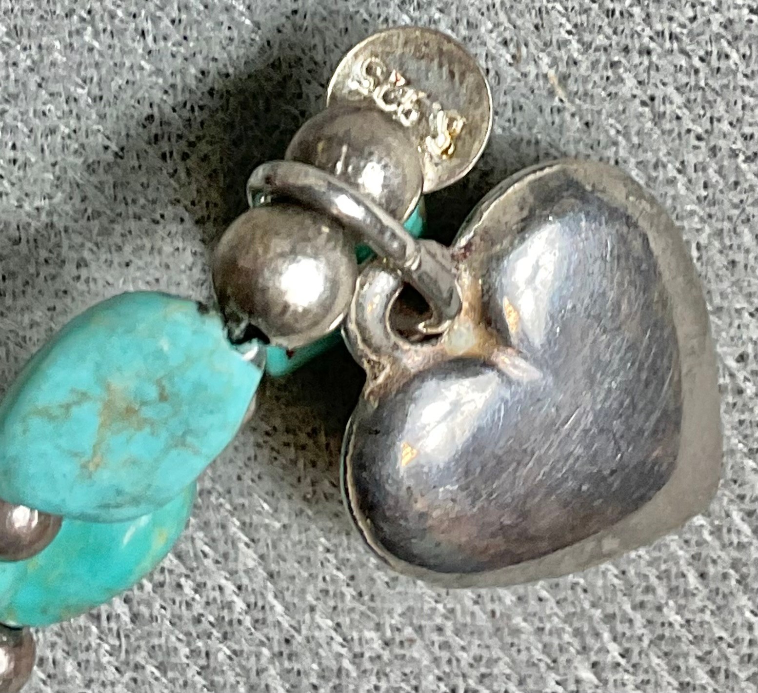 Shube Sterling & Turquoise Stretch Bracelet W/ Heart Charm - 2.25” wide - good used condition