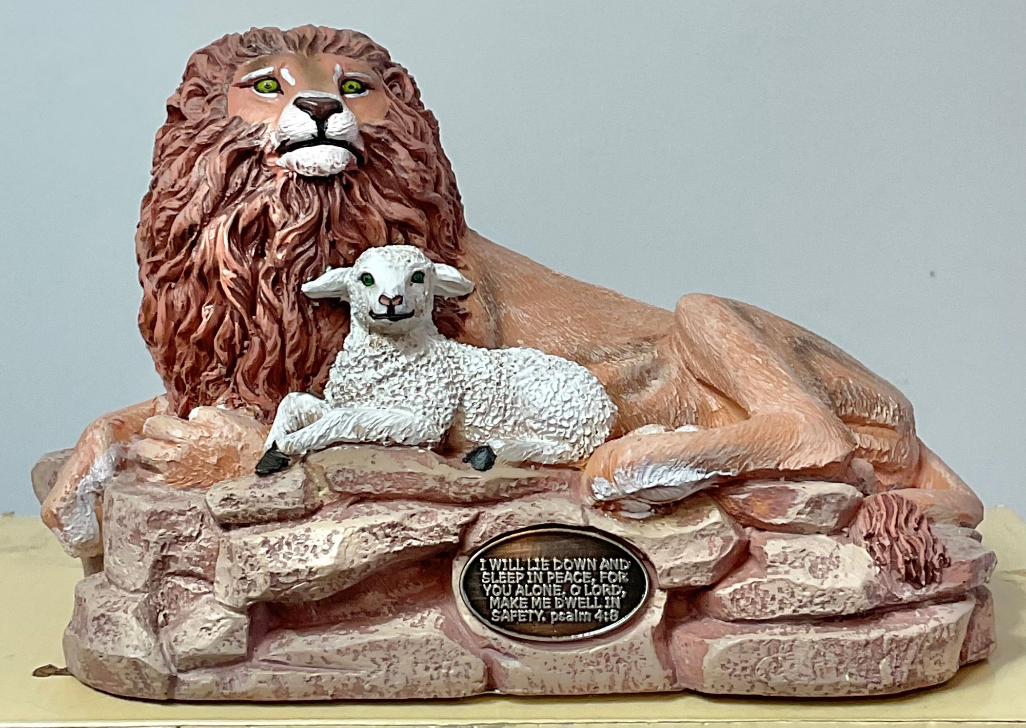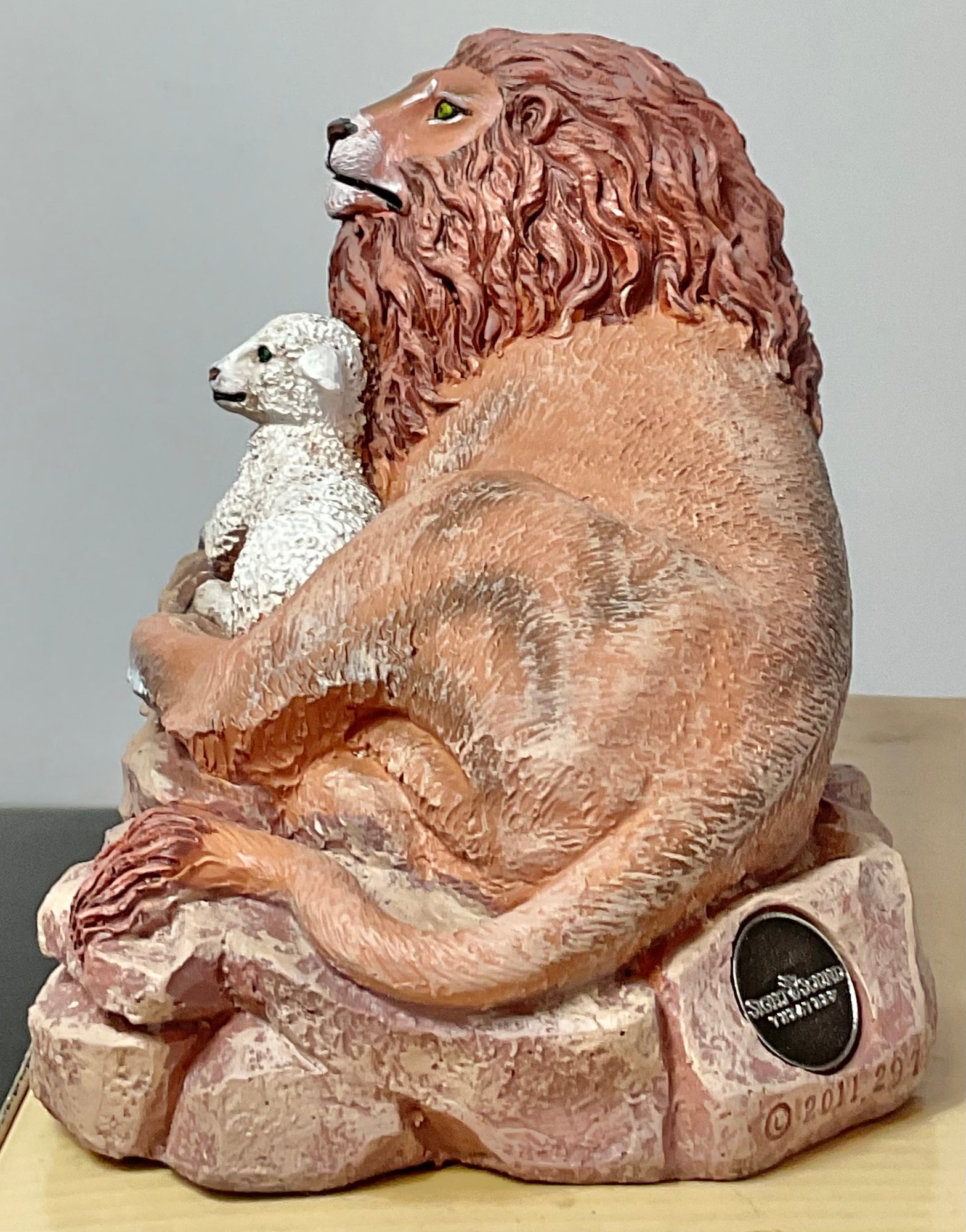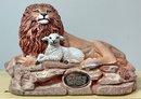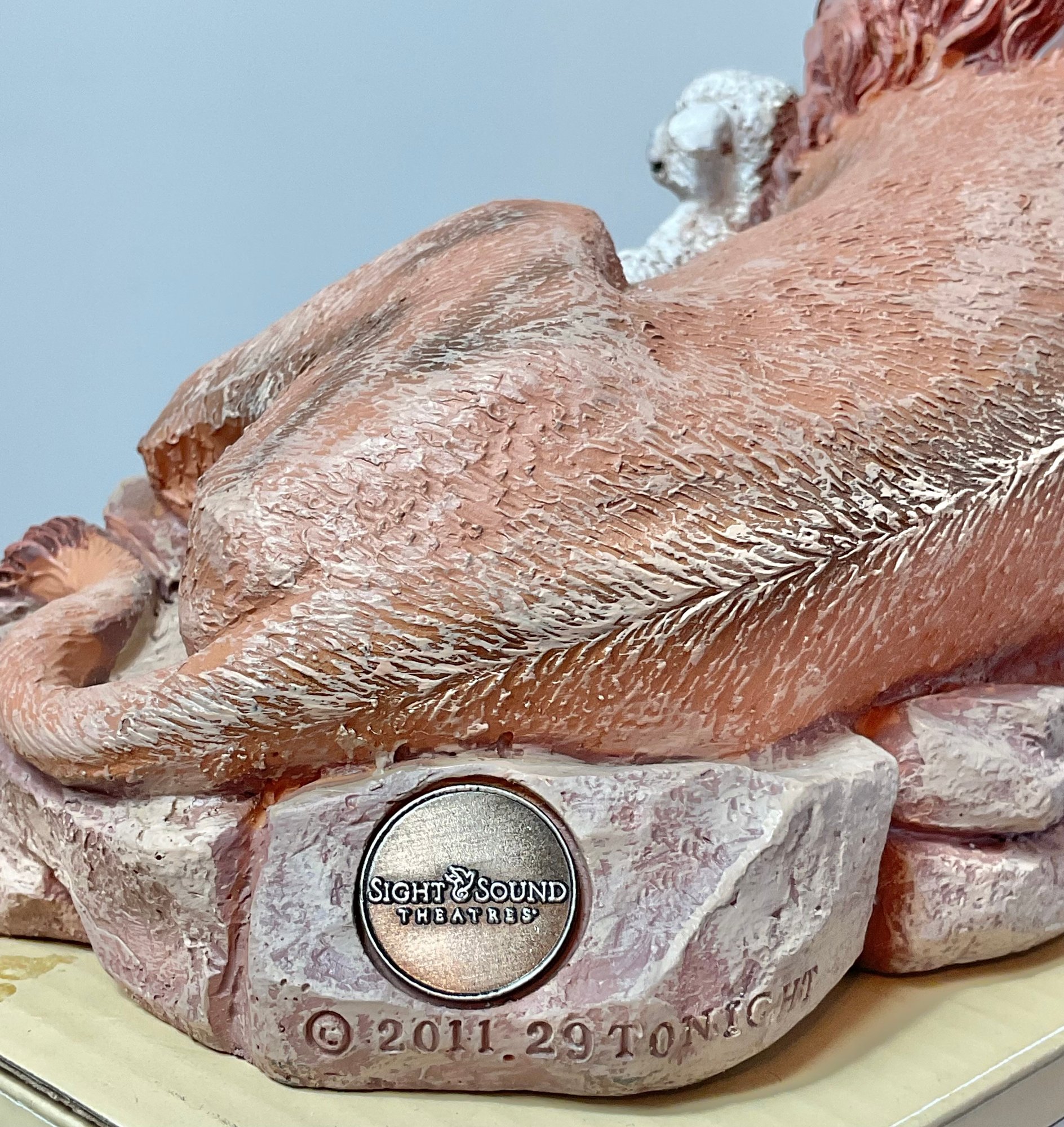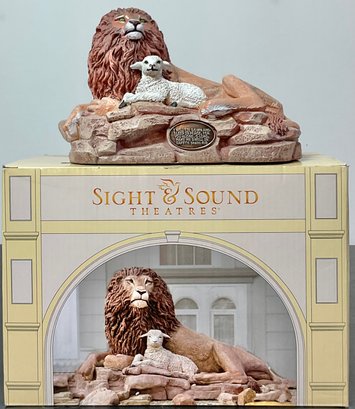 Sight & Sound Theaters Resin Lion W/ Lamb Figurine - 4.5” tall x 7” long x 3.5” wide - original box - good used condition