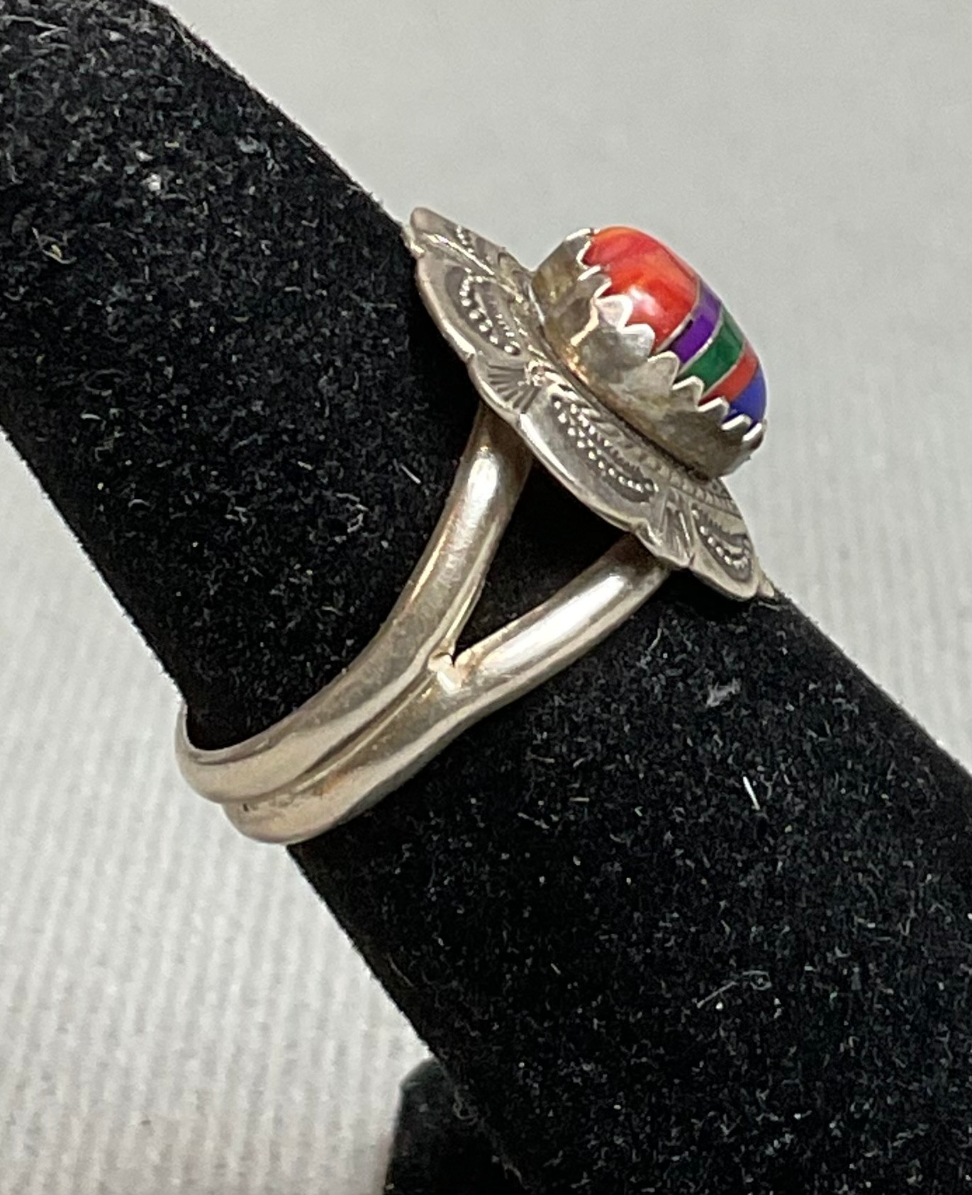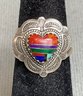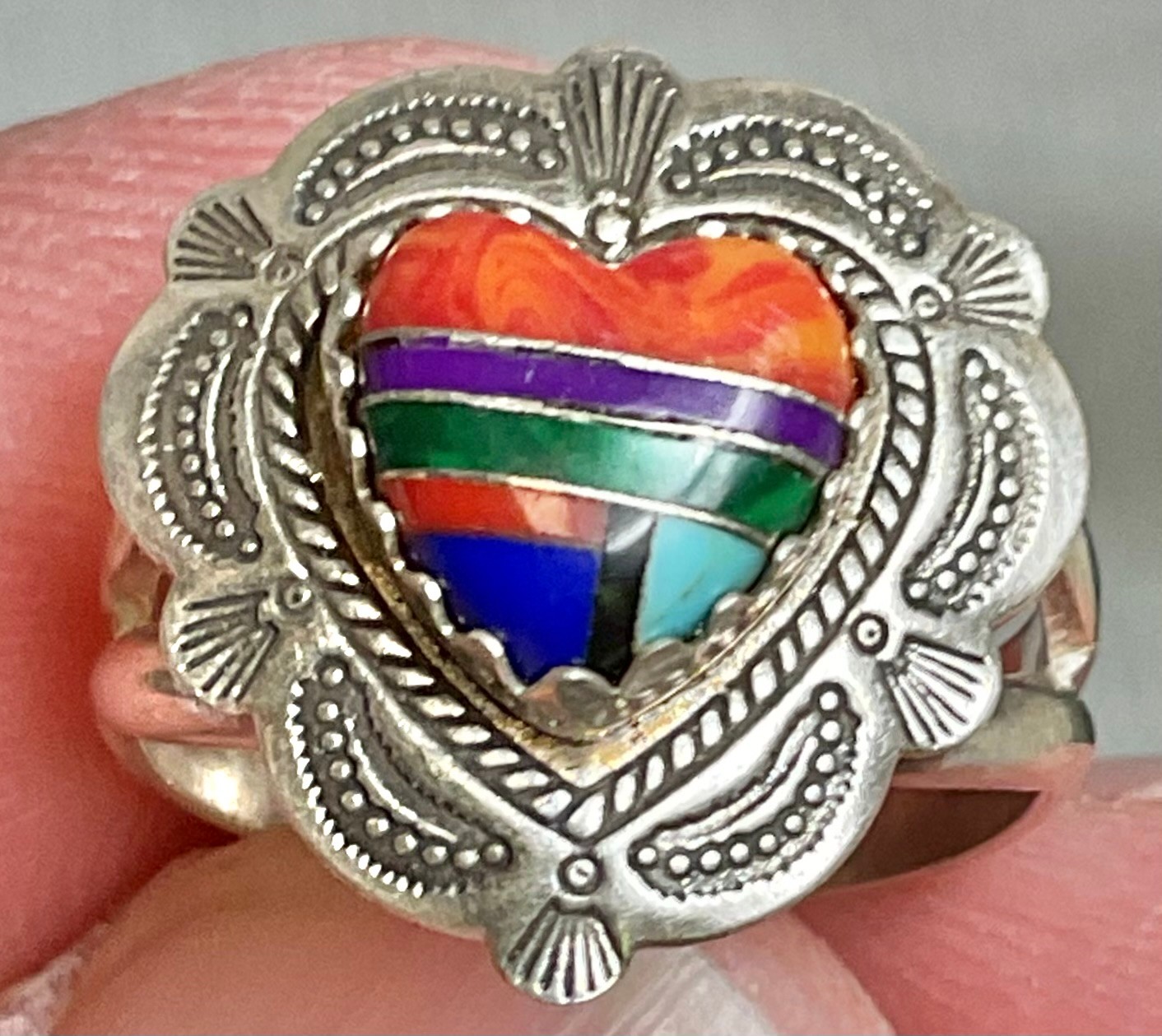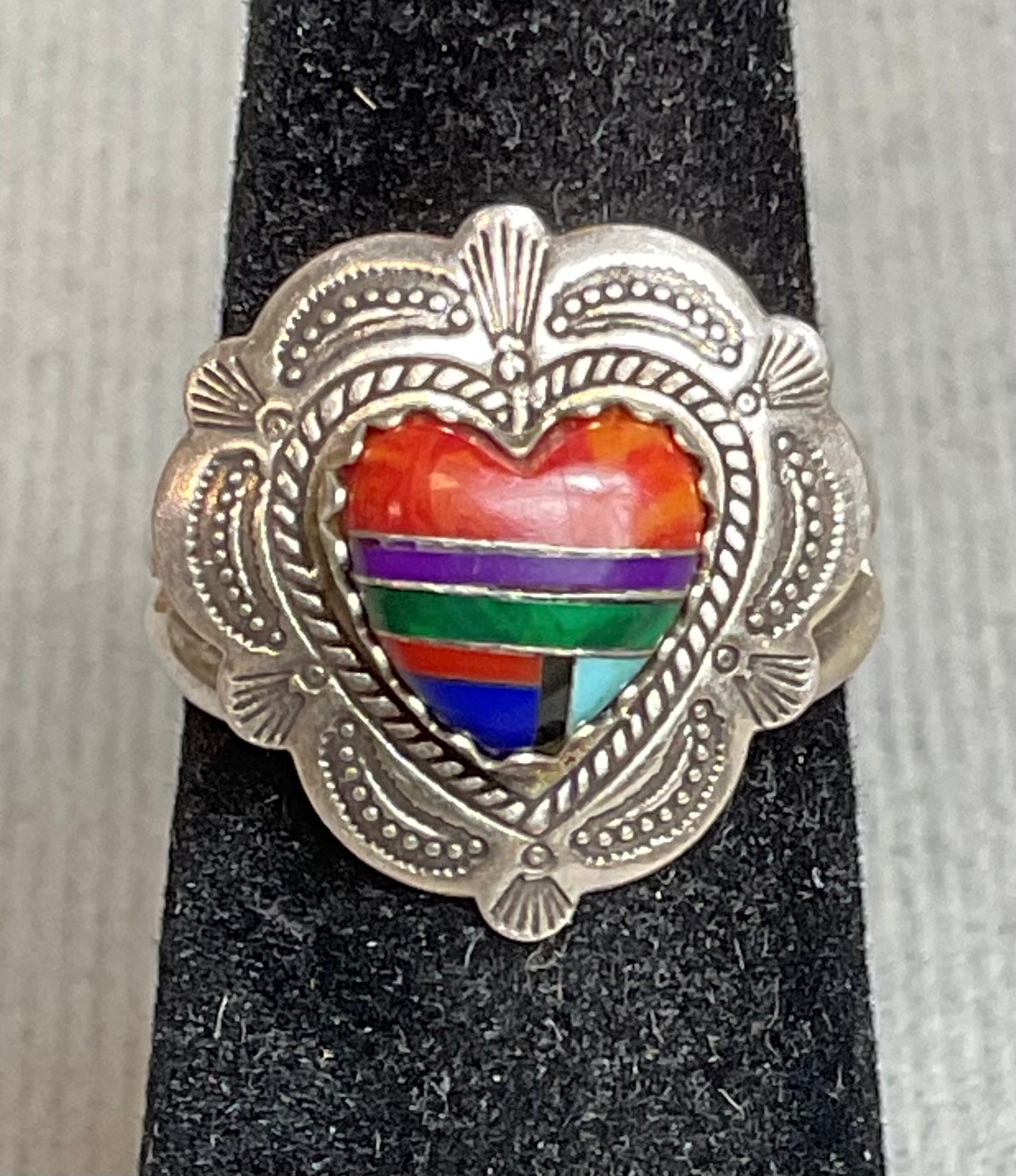 Signed Navajo Sterling & Multi Stone Inlay Heart Ring - signed RB - size 6 - weighs 3.2 grams - pretty ring - good used condition