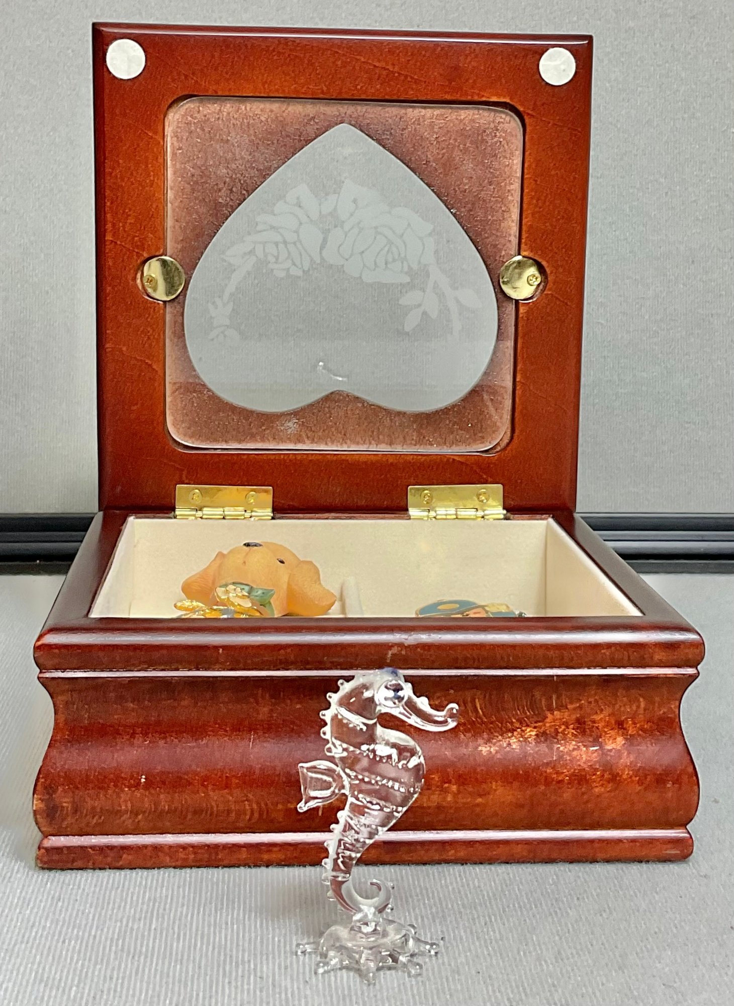Small Jewelry Box with contents 2.5” tall x 5.5” long x 5.5” wide & Hand Blown Glass Seahorse 2” tall - good used condition