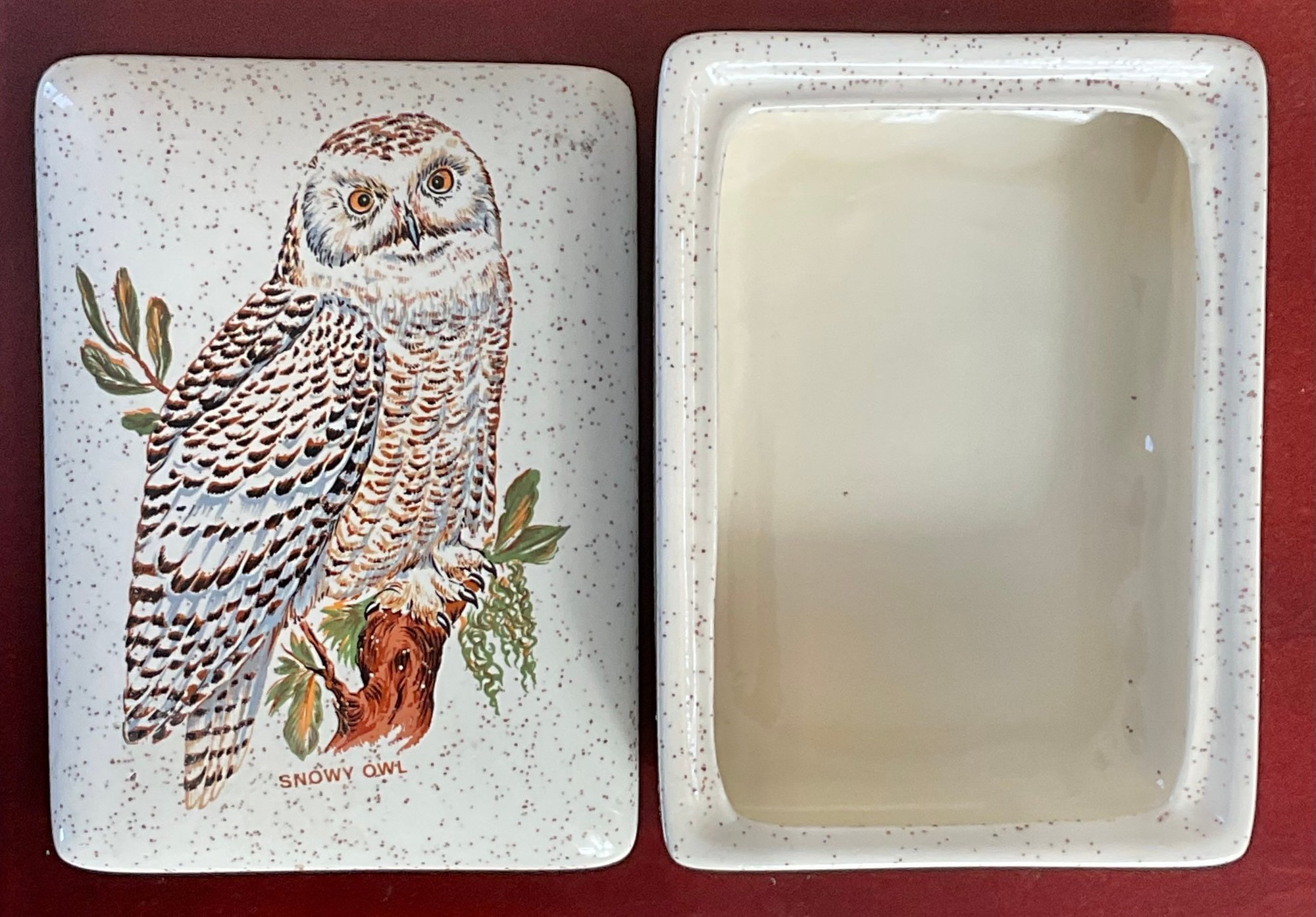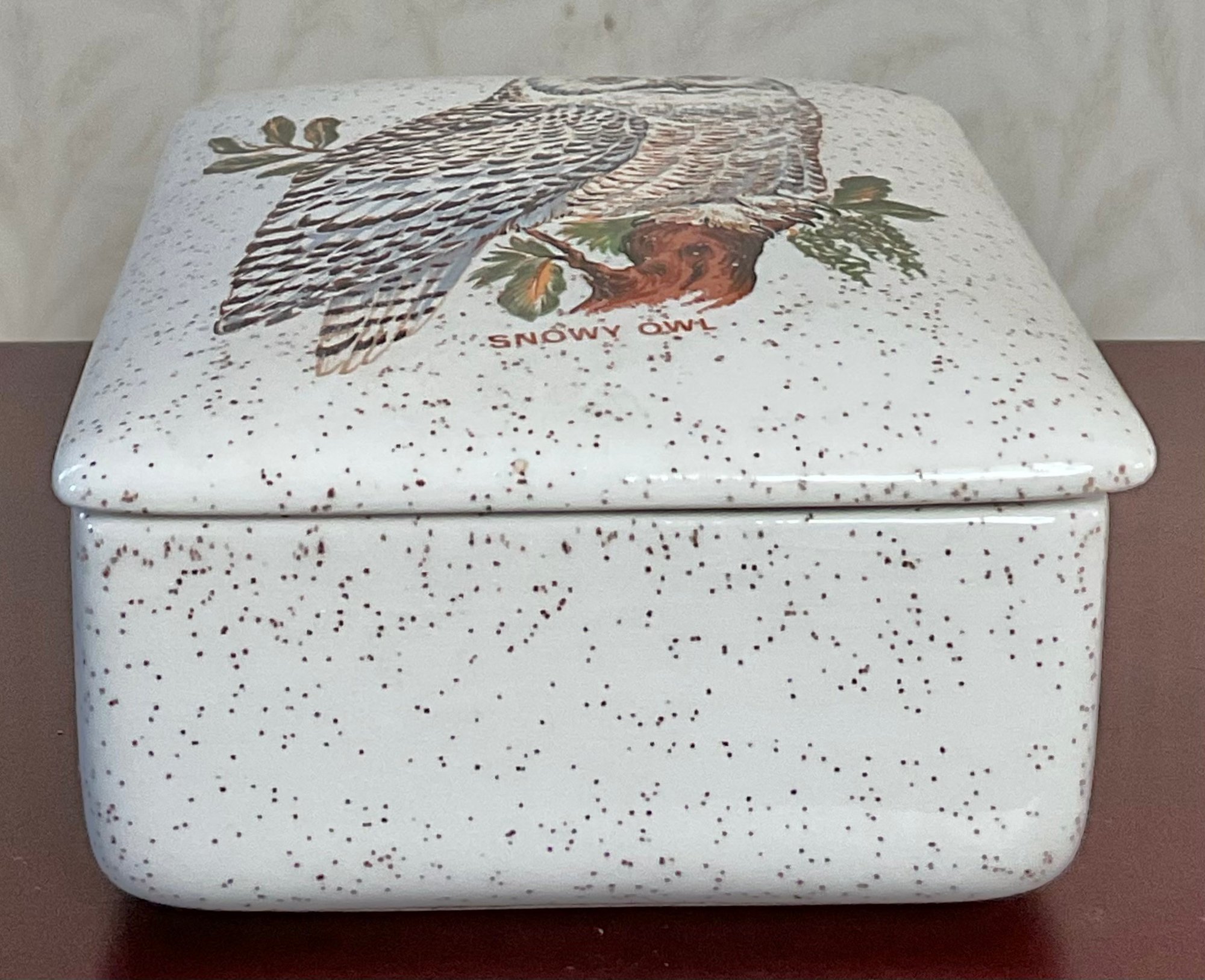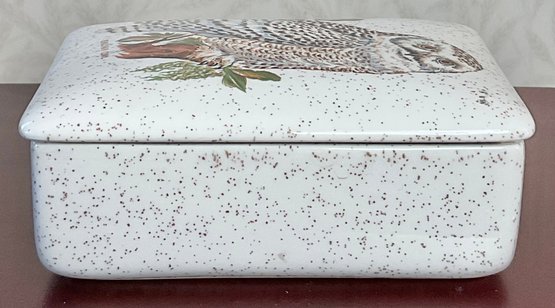 Snowy Owl Covered Ceramic Box - no chips - 2.25” tall x 5.5” long x 4” wide - good used condition