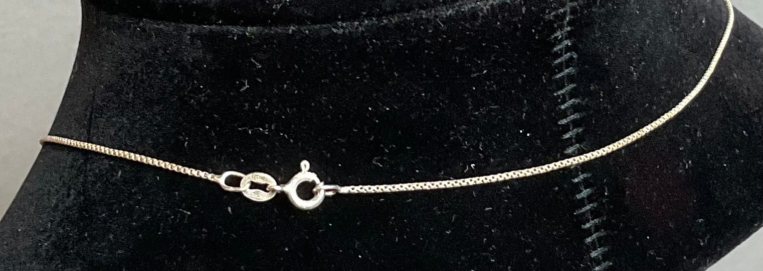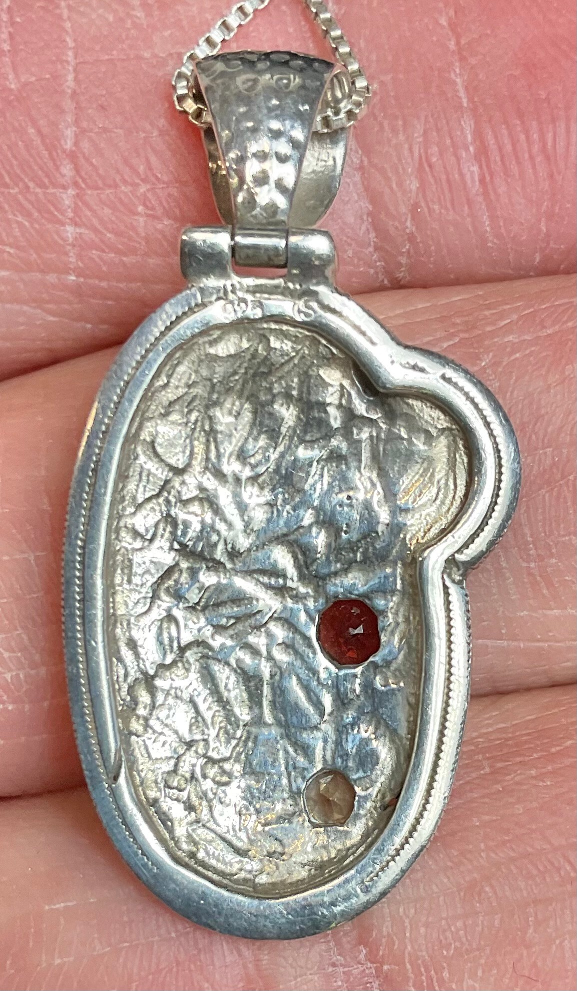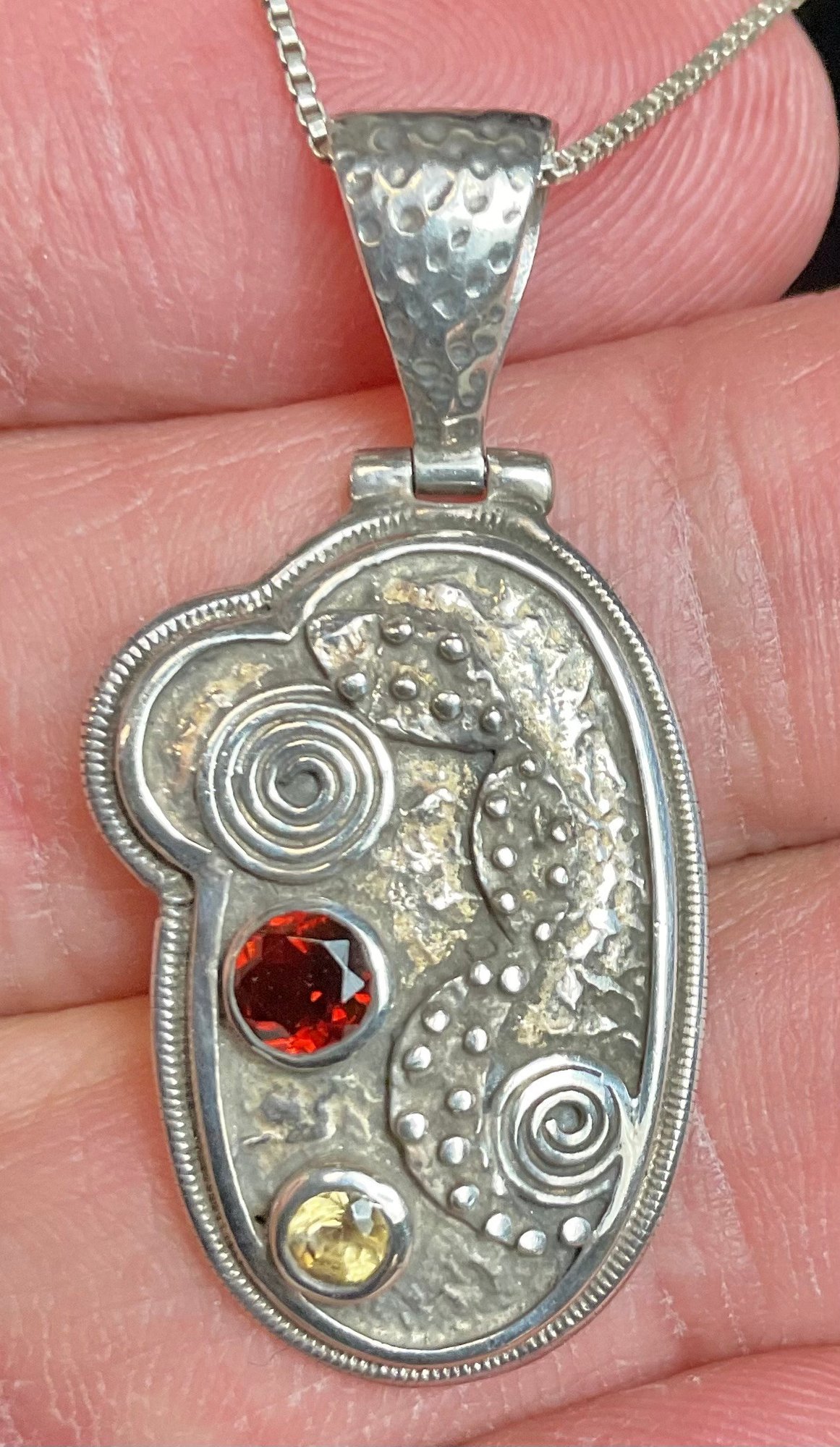 Sterling Chain W/ Handcrafted Sterling Garnet & Citrine Pendant - chain 19” - pendant 1.5” x .75” - weighs 7 grams - unusual piece - good used condition