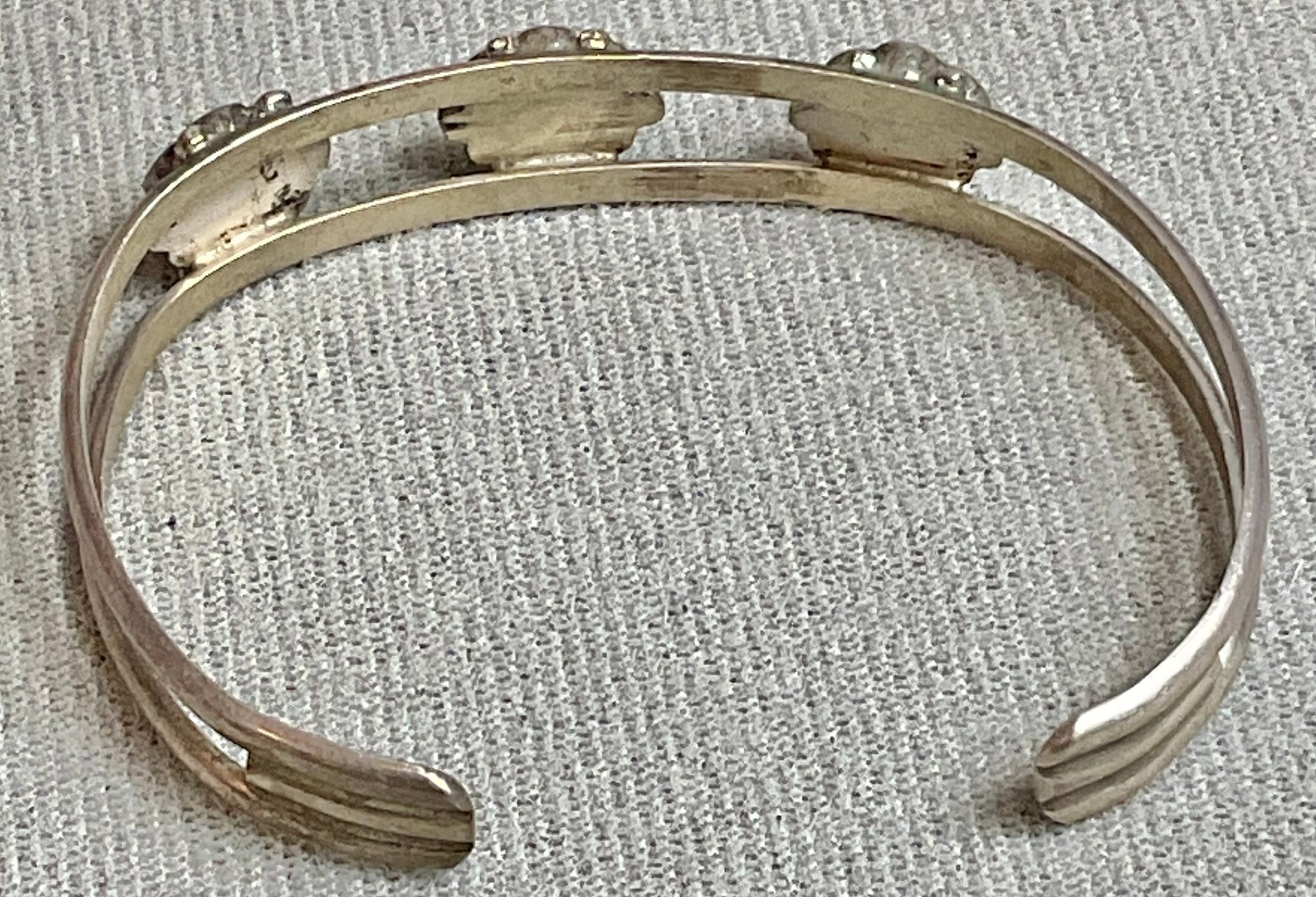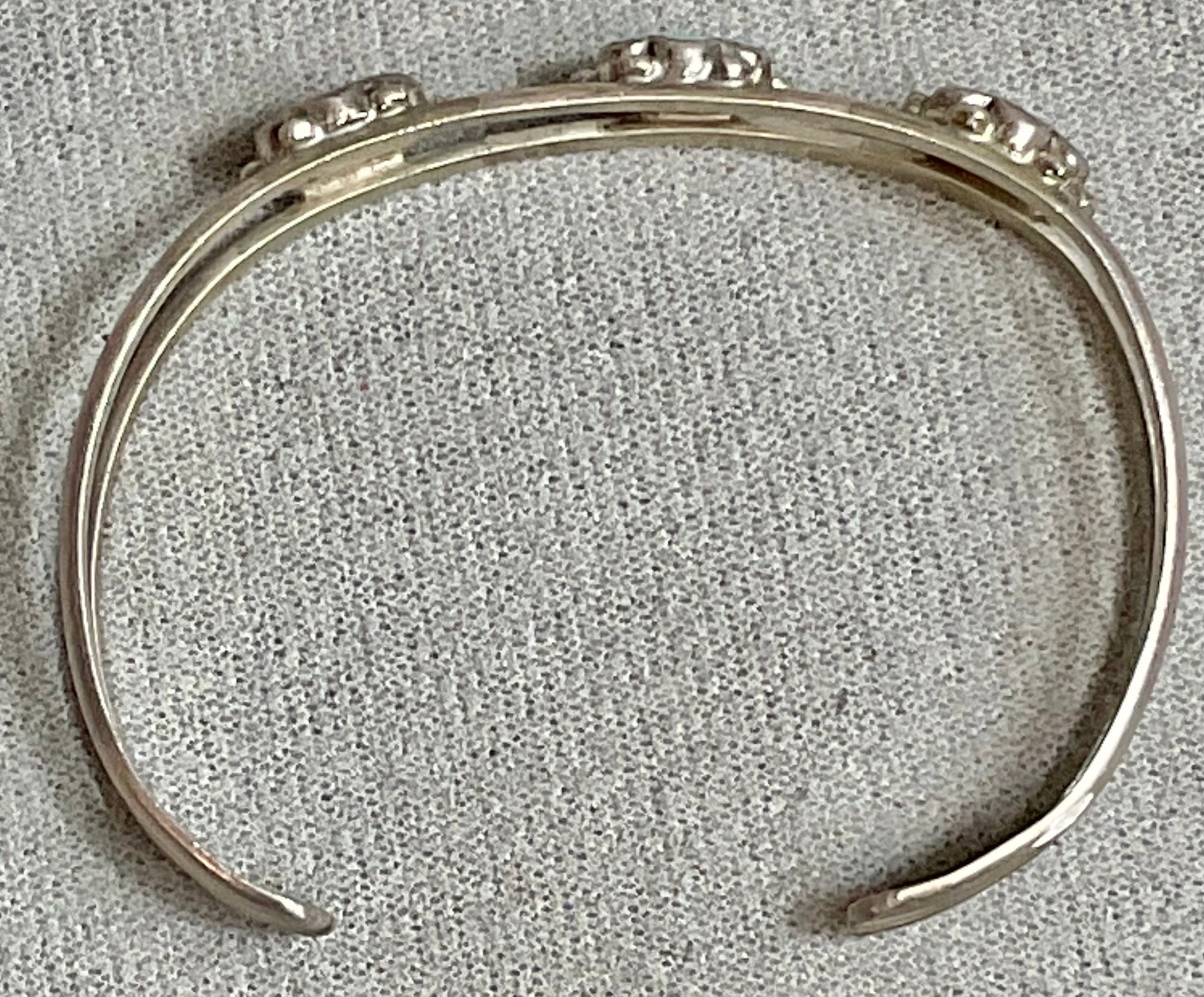 Sterling Cuff Bracelet W/ 3 Florets - Onyx/Turquoise/Coral - unmarked and unsigned - XRF tested sterling - 2.25” wide - weighs 10.7 grams - good used condition