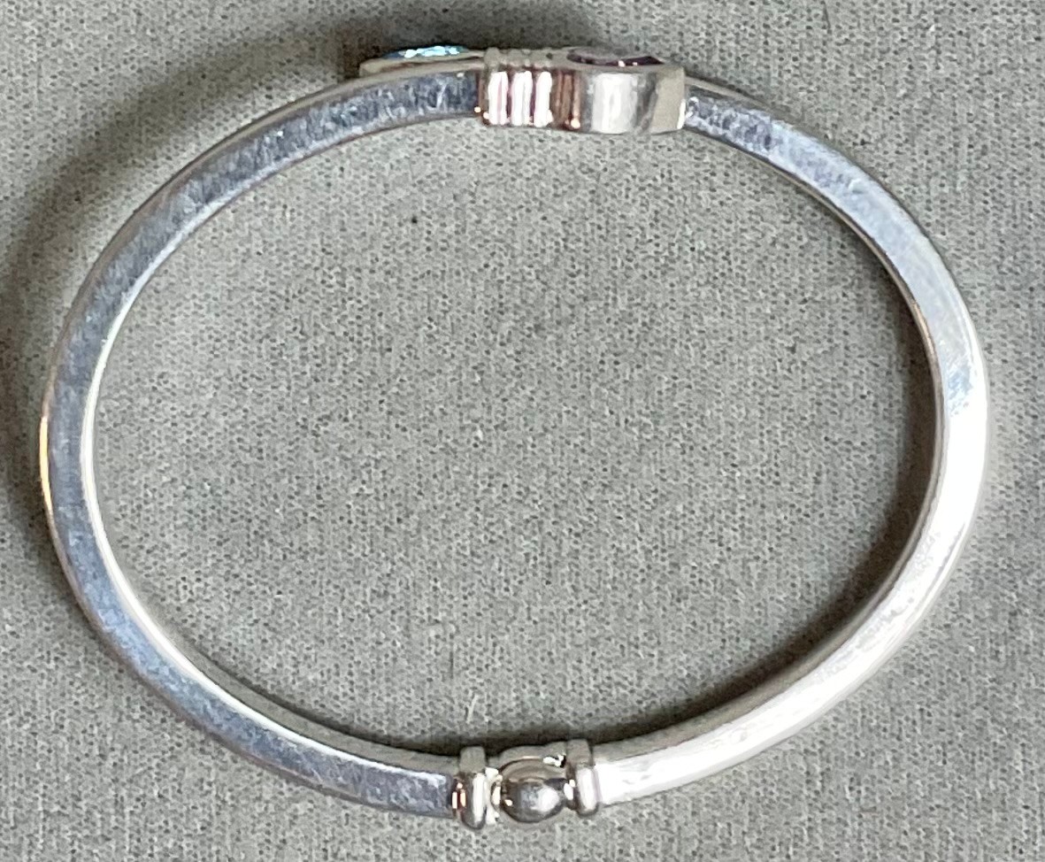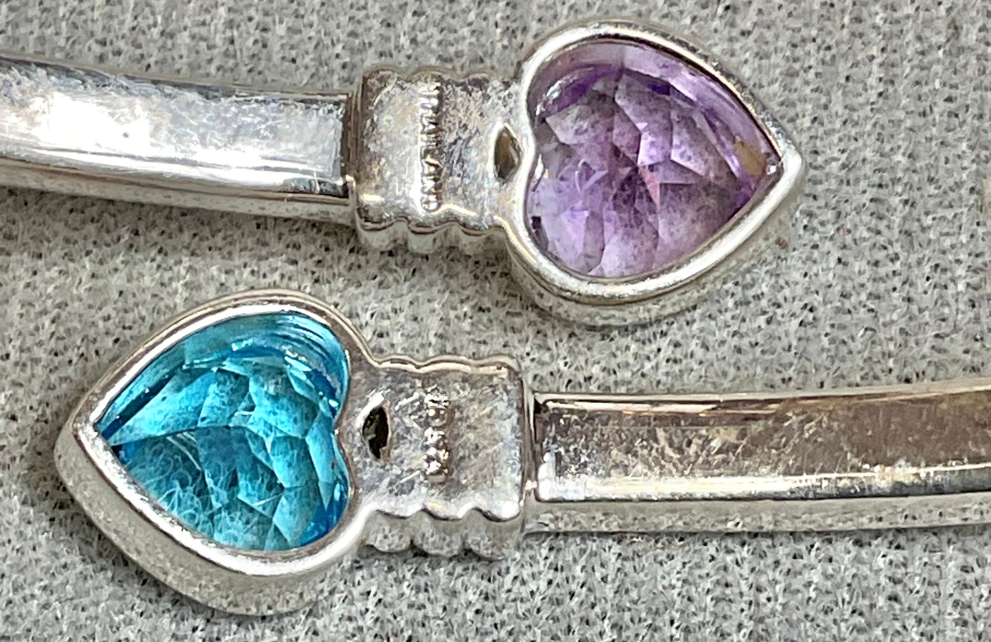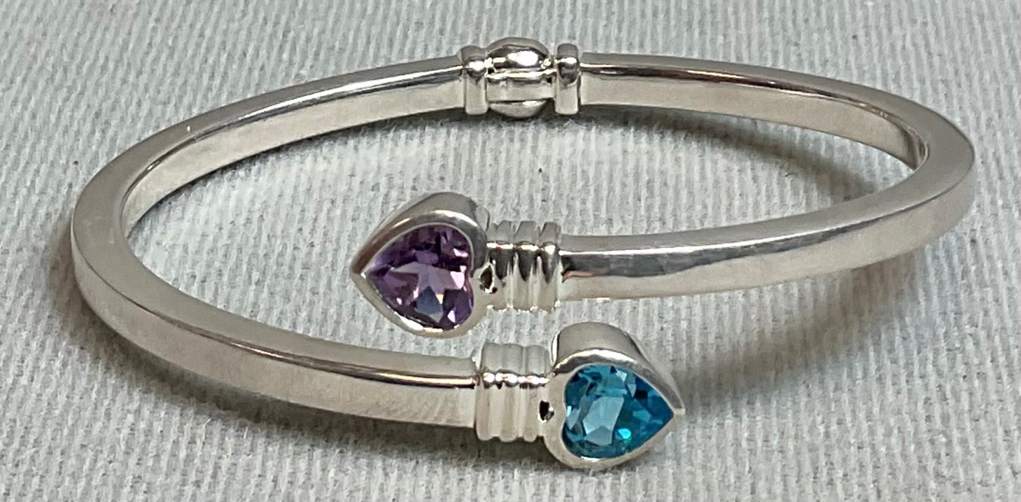 Sterling Hinged Bangle Bracelet W/ Heart Shaped Amethyst & Blue Topaz - Thailand - 2.5” wide - weighs 14.5 grams - good used condition