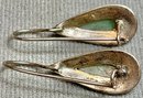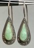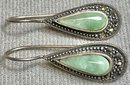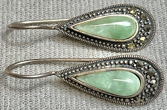 Sterling Nephrite Jade & Marcasite Drop Earrings - missing 1 marcasite - 1” long - weighs 4 grams - good used condition