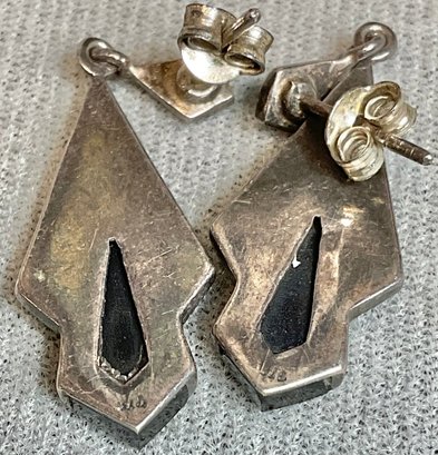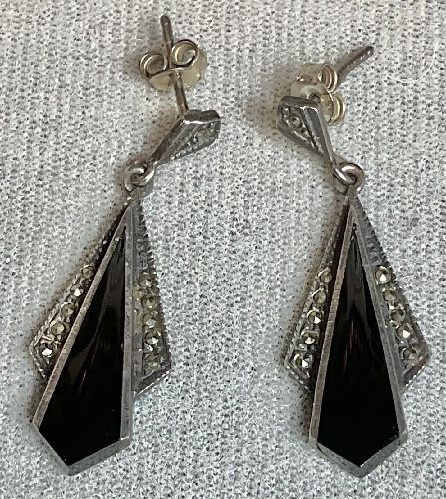 Sterling Onyx & Marcasite Dangle Earrings - 1 3/8” x 1/2” - weighs 4.5 grams - good used condition
