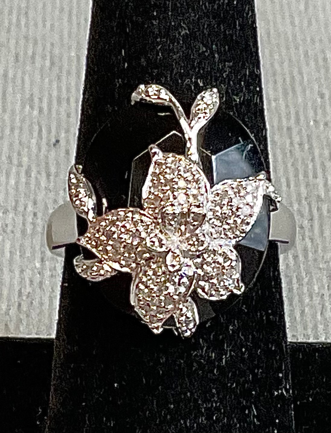 Sterling - Onyx & Marcasite Flower Ring - size 9 - weighs 7.9 grams - good used condition