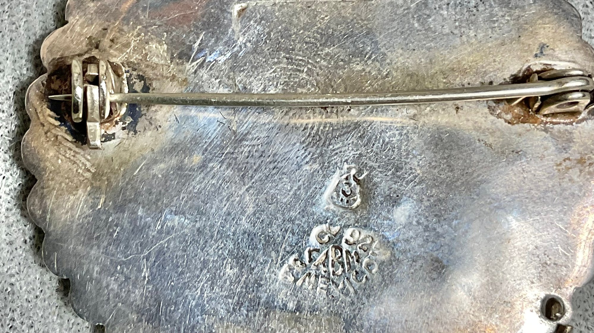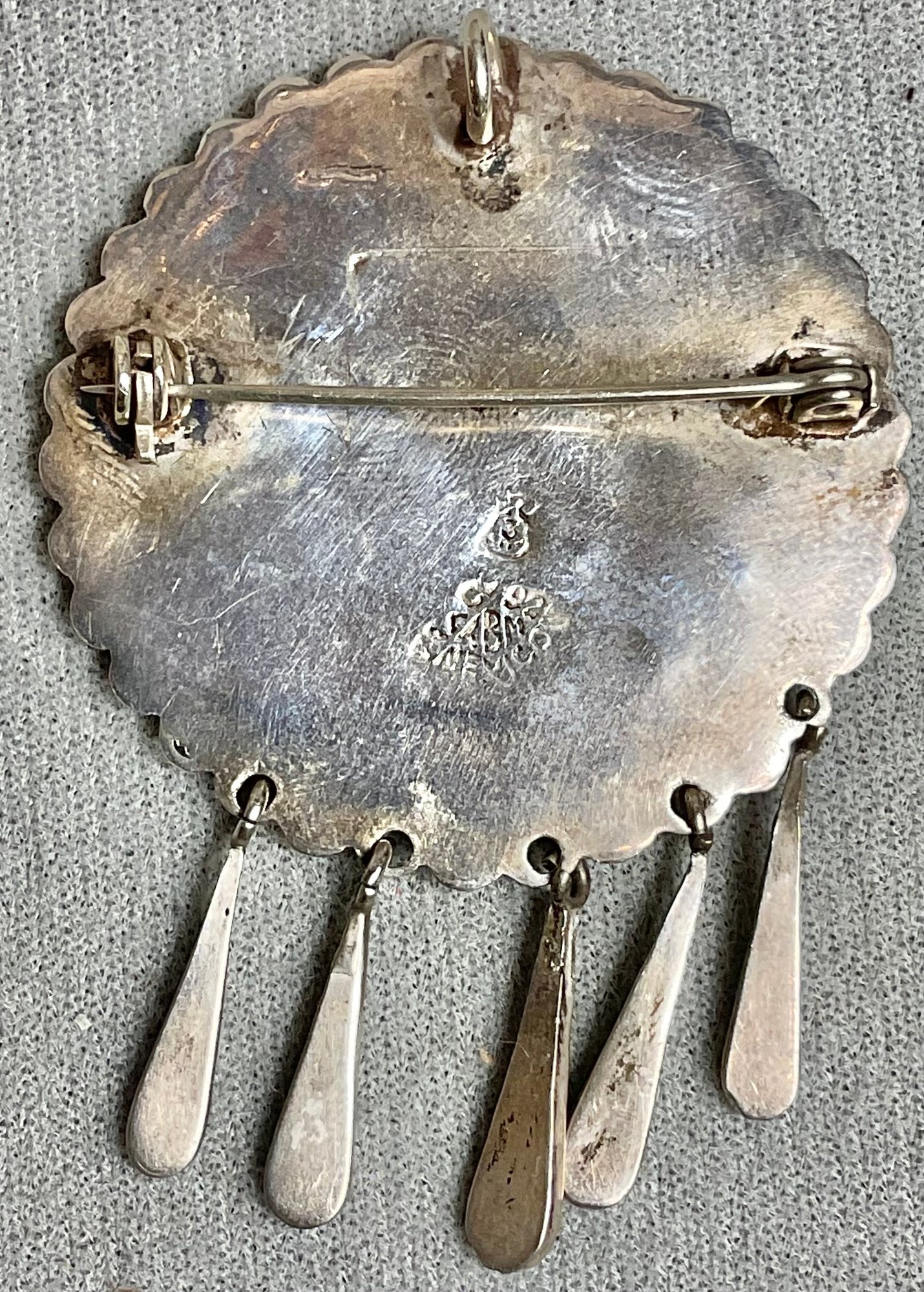 Sterling Silver Turquoise Multi Stone Inlay Warrior Shield Brooch/Pendant - Taxco Mexico - 1.75” x 2.25” - weighs 11.9 grams - good used condition
