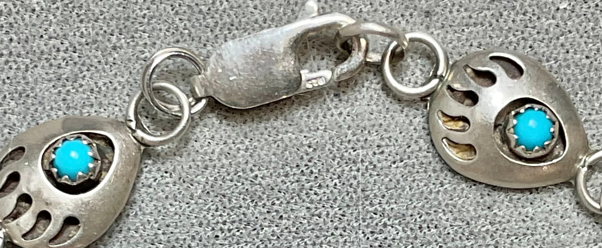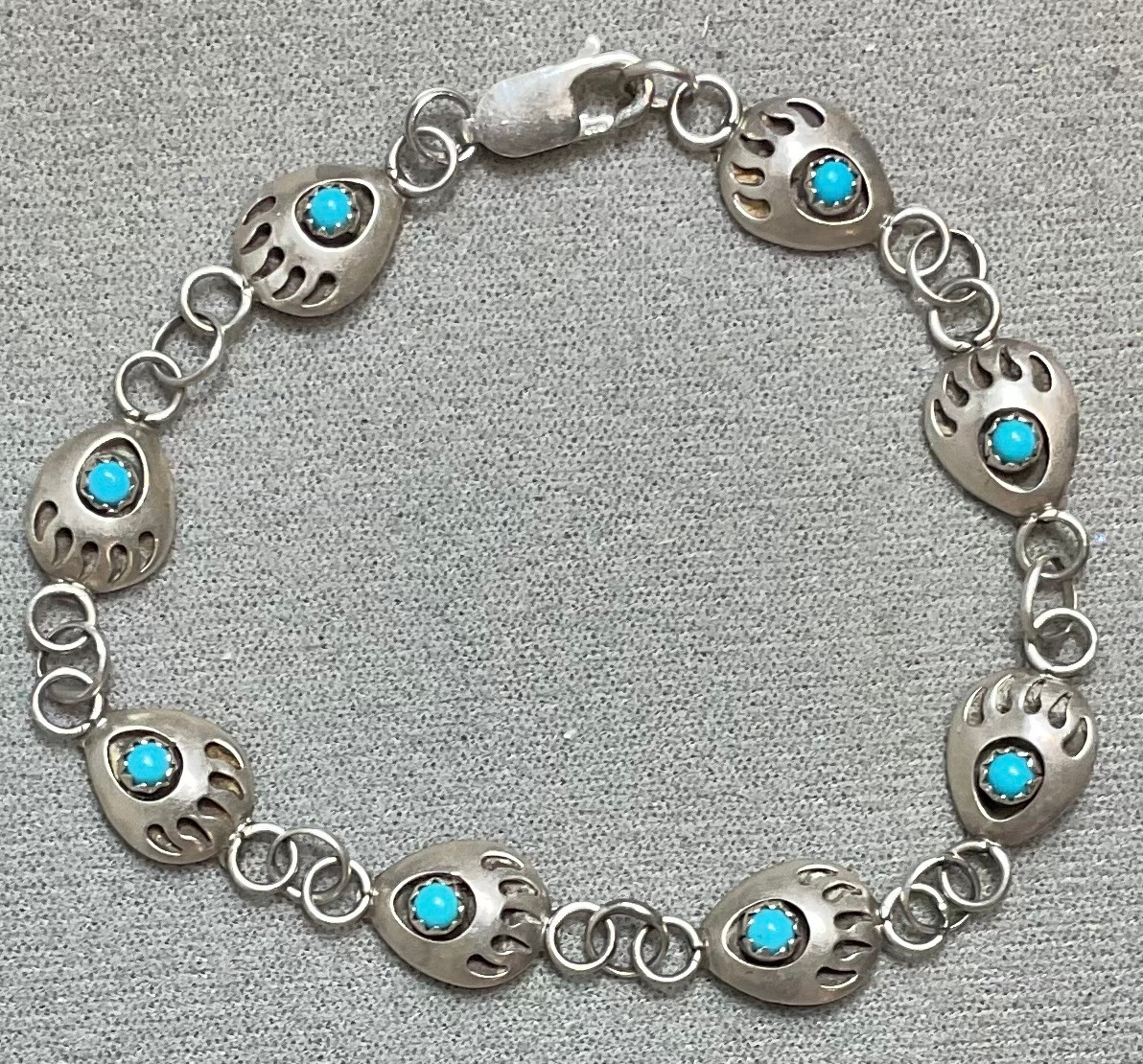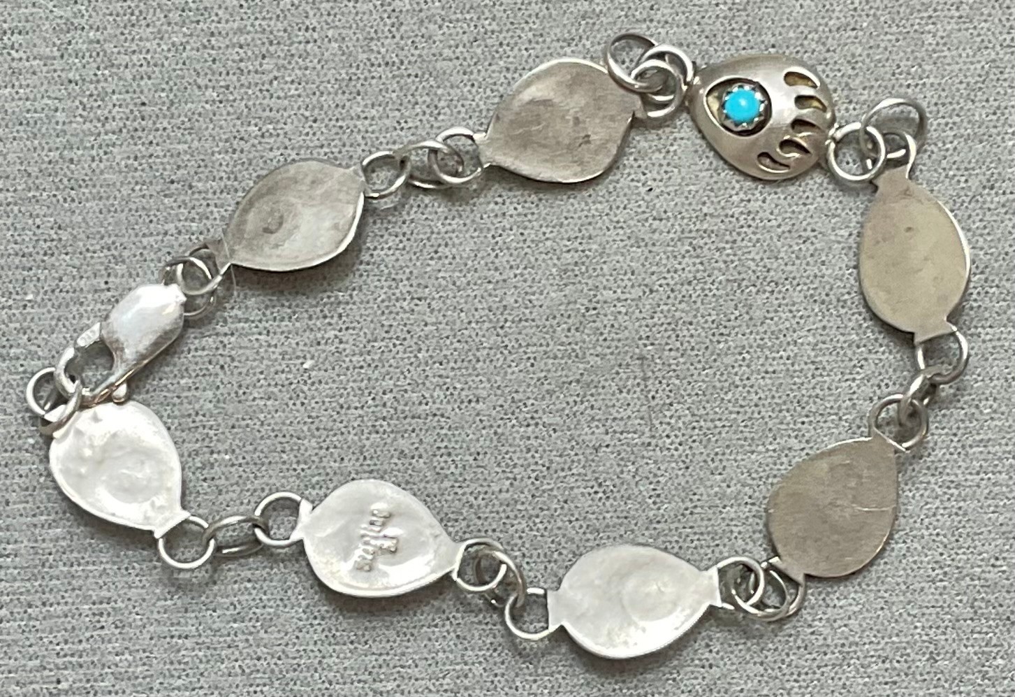 Sterling Sleeping Beauty Turquoise Bear Paw Bracelet - signed SJ - 8.5” - weighs 6.5 grams - good used condition