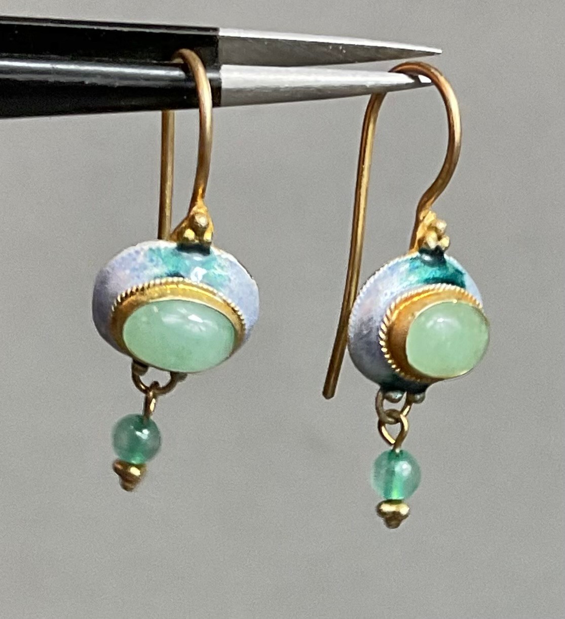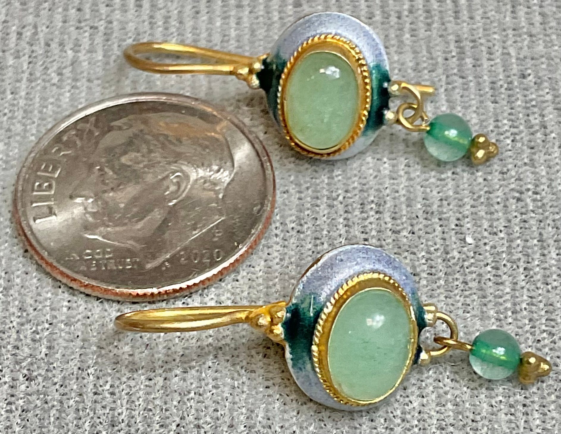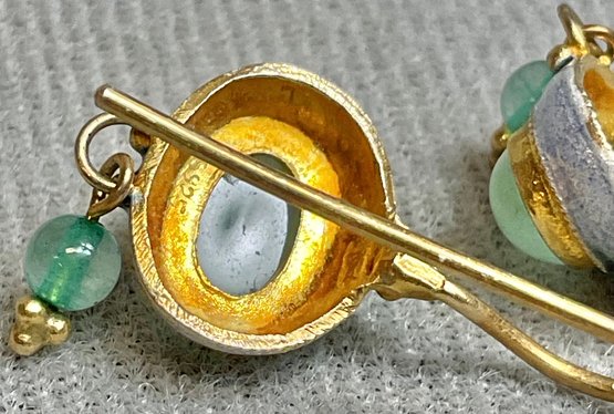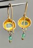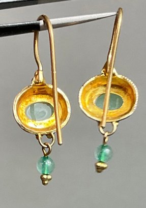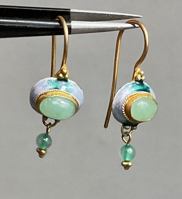 Sterling W/ Gold Wash Enamel & Green Stone Drop Earrings - good used condition