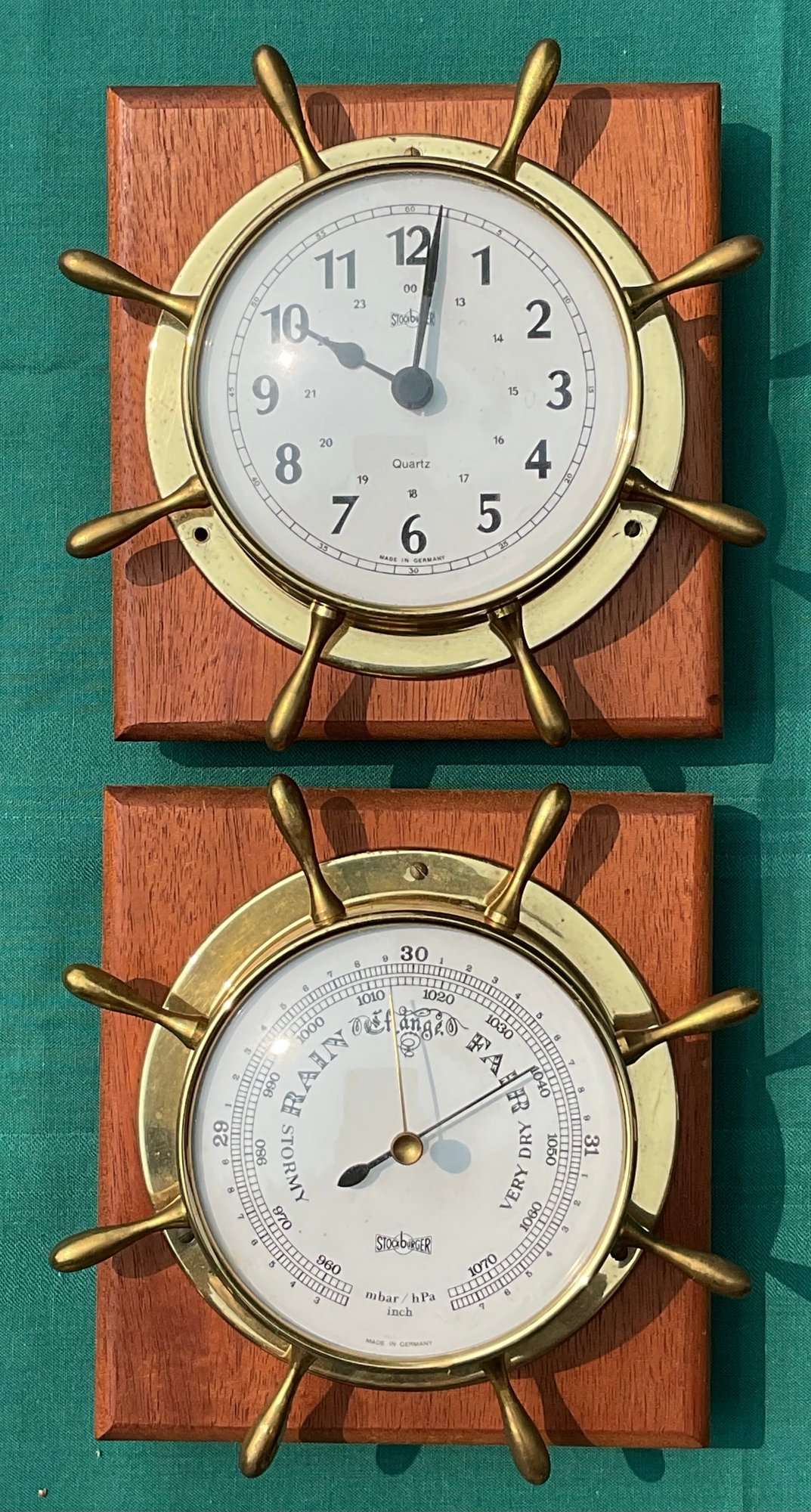 Stock Burger German Clock & Barometer - Ships Wheel Design - clock is quartz and needs battery - 7” wide - good used condition