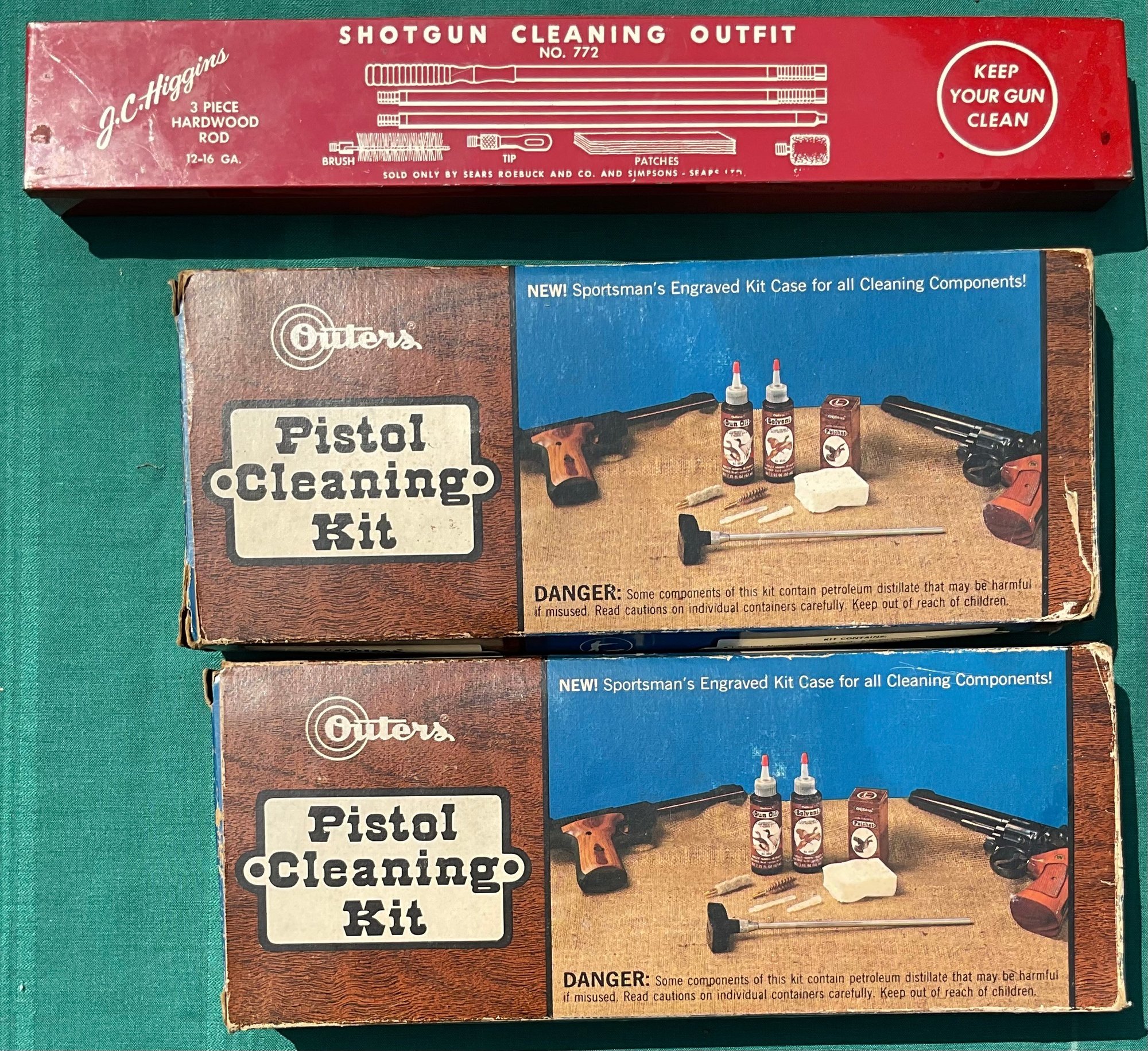 Pistol & Shotgun Cleaning Kits - 2 Outers pistol kits - 1 JC Higgins hardwood shotgun kit - good used condition