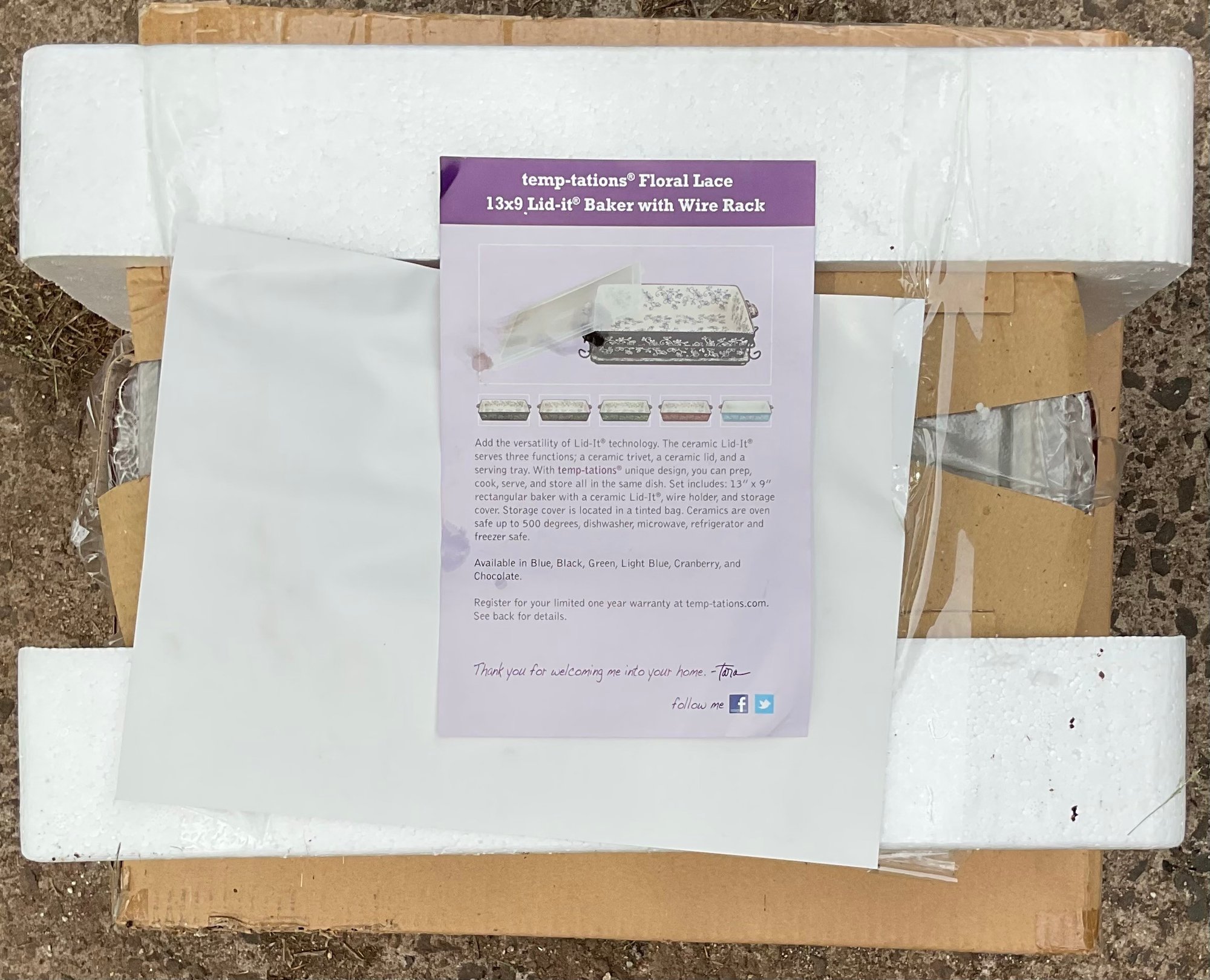 Temptations Floral Lace Baker W/ Wire Rack - New - 13” x 9” - chocolate color - new in box