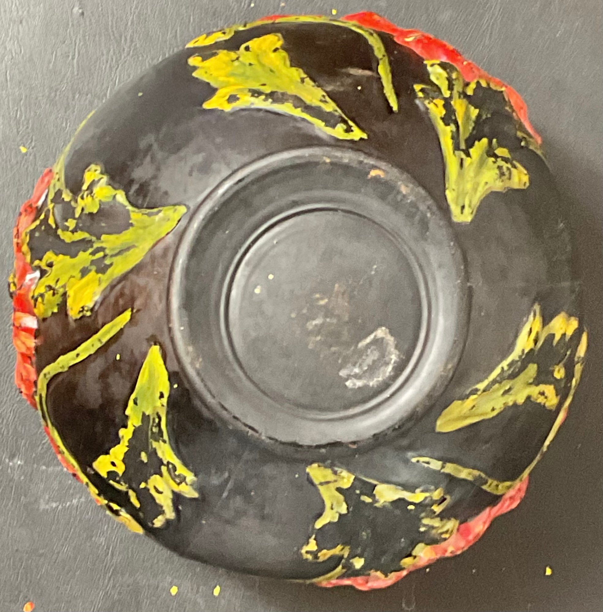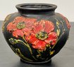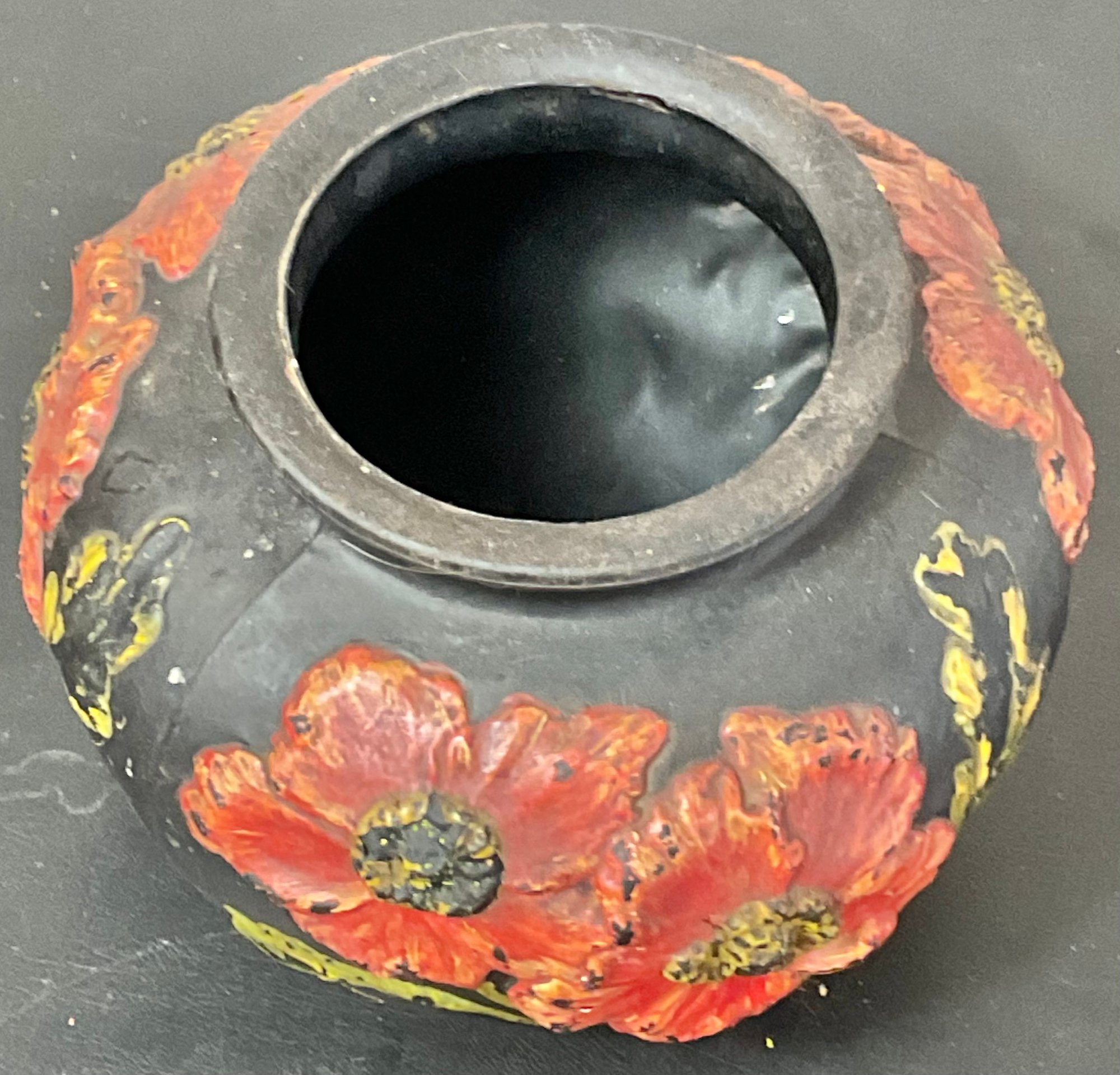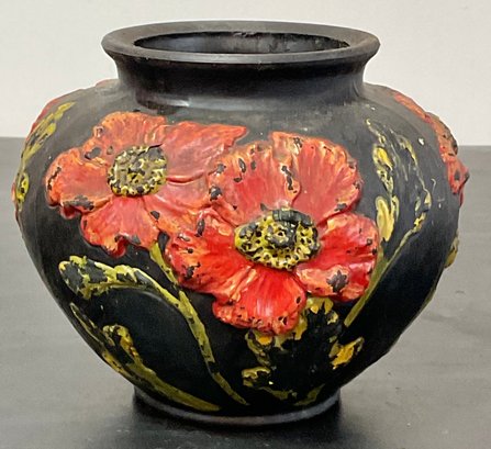 Tiffin Black Satin Glass Coralene Poppy Vase - no chips - some paint flakes - 5.5” tall x 6.5” wide - good used condition