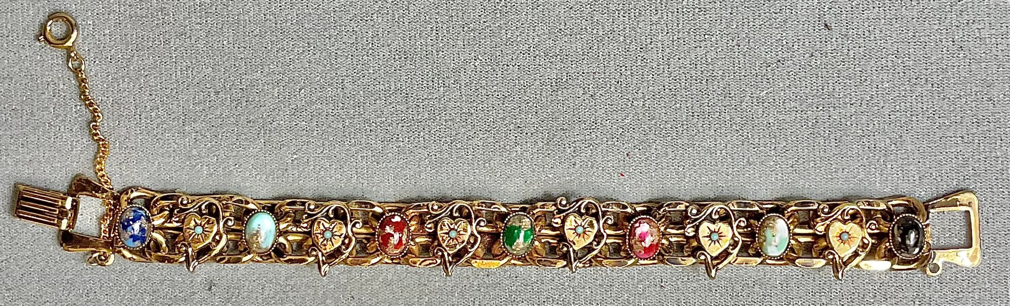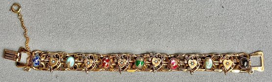 Victorian Revival Slide Link Bracelet W/ Hearts & Art Glass Stones - 7” long x .5” wide - has rust spot on back that can be cleaned - good used condition