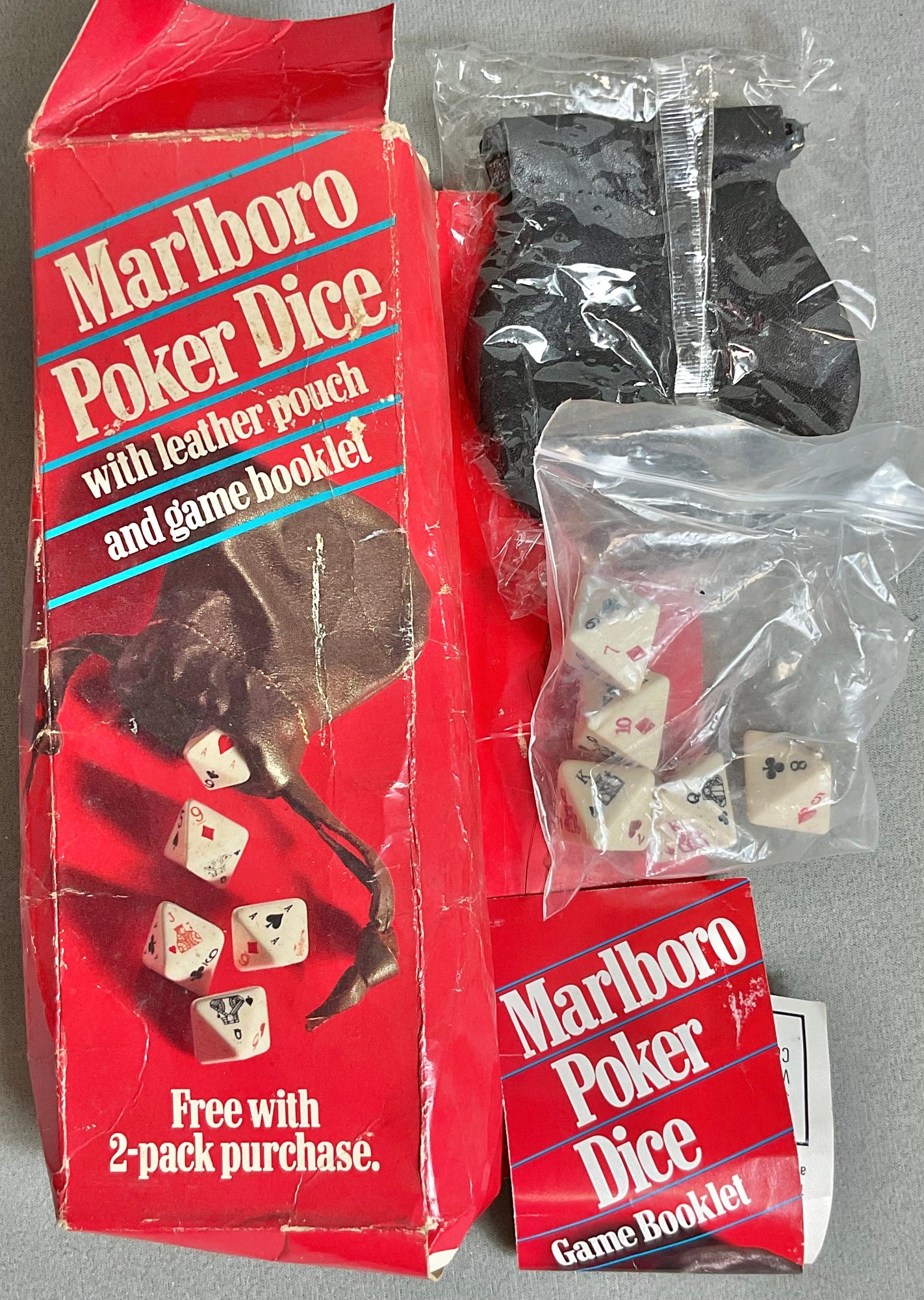 Vintage 1990 Marlboro Poker Dice & Leather Pouch - looks unused - box rough - good condition