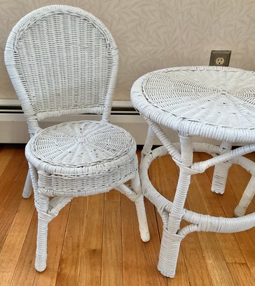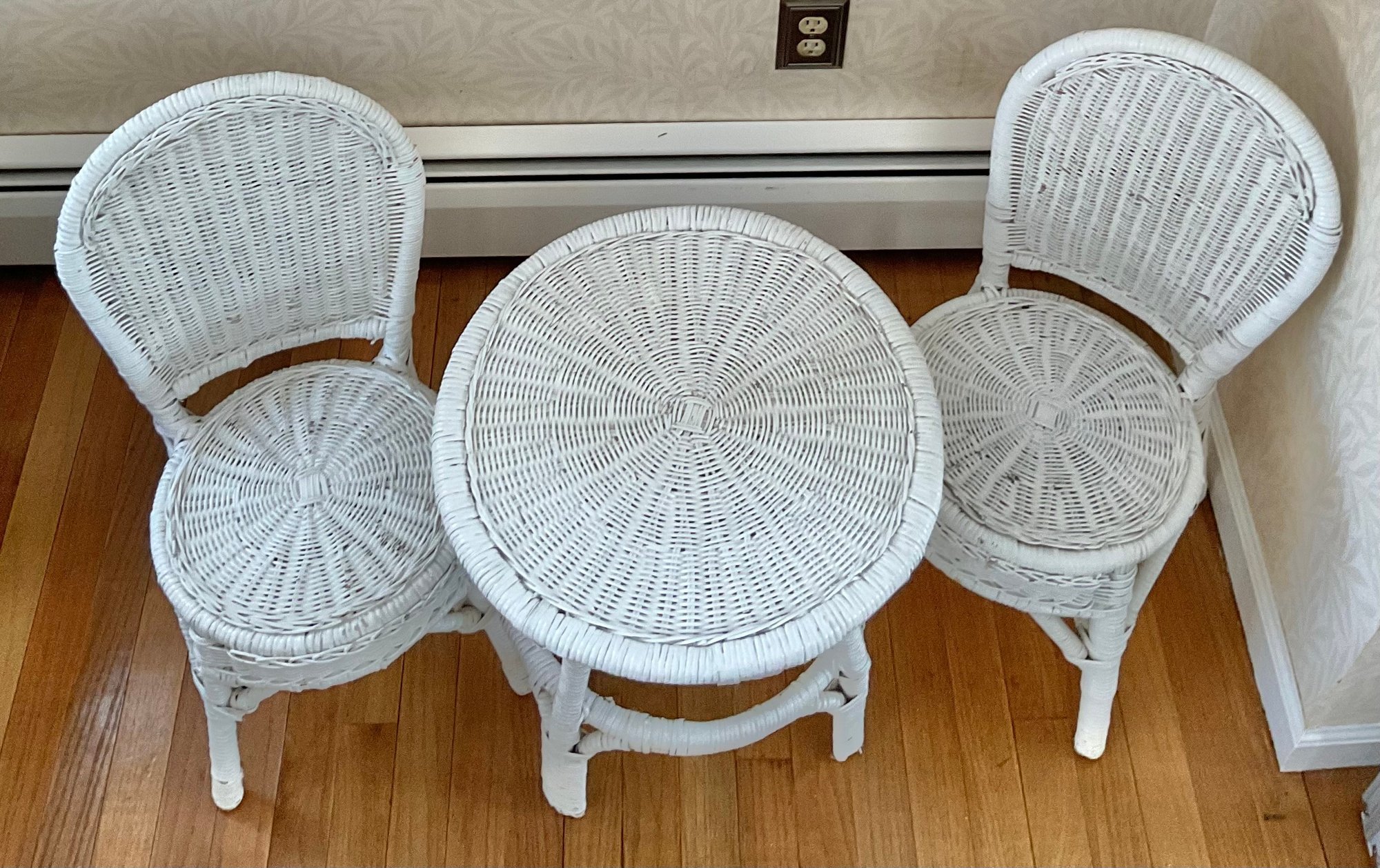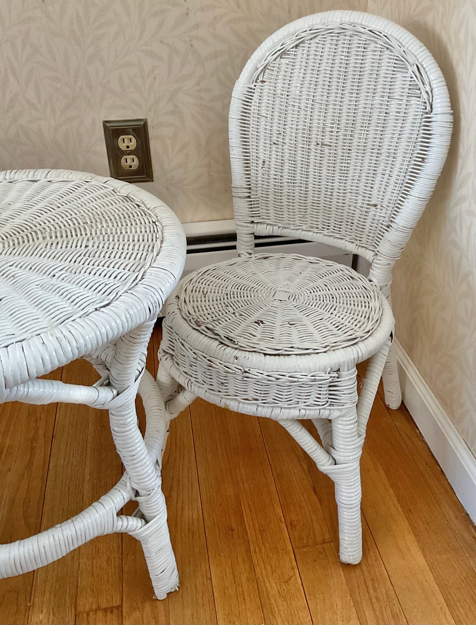 Vintage 3pc Childs Wicker Table & Chairs Set - table 18” tall x 17.75” round - good used condition