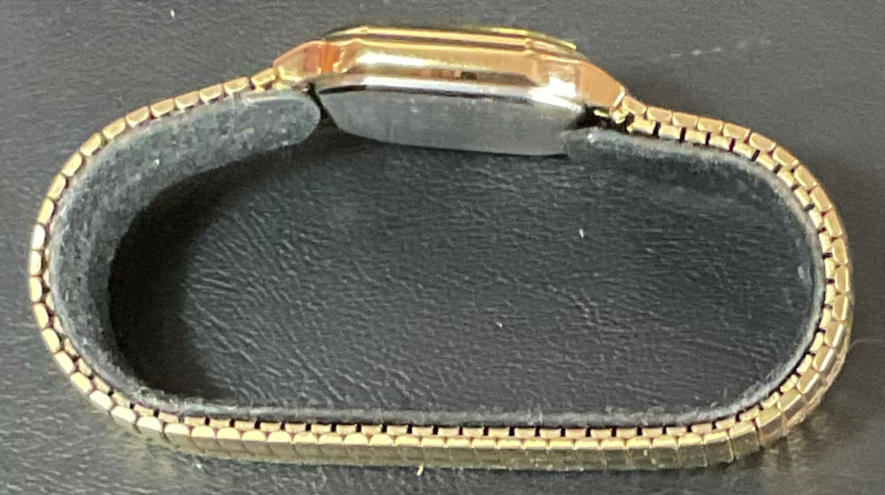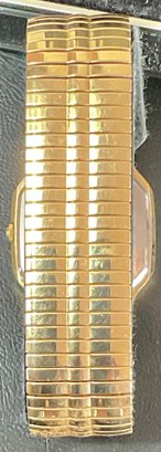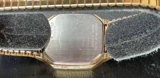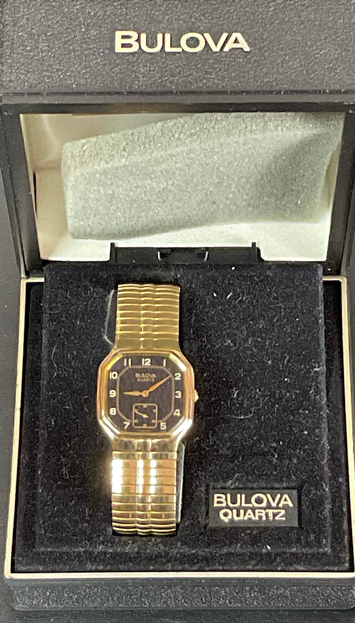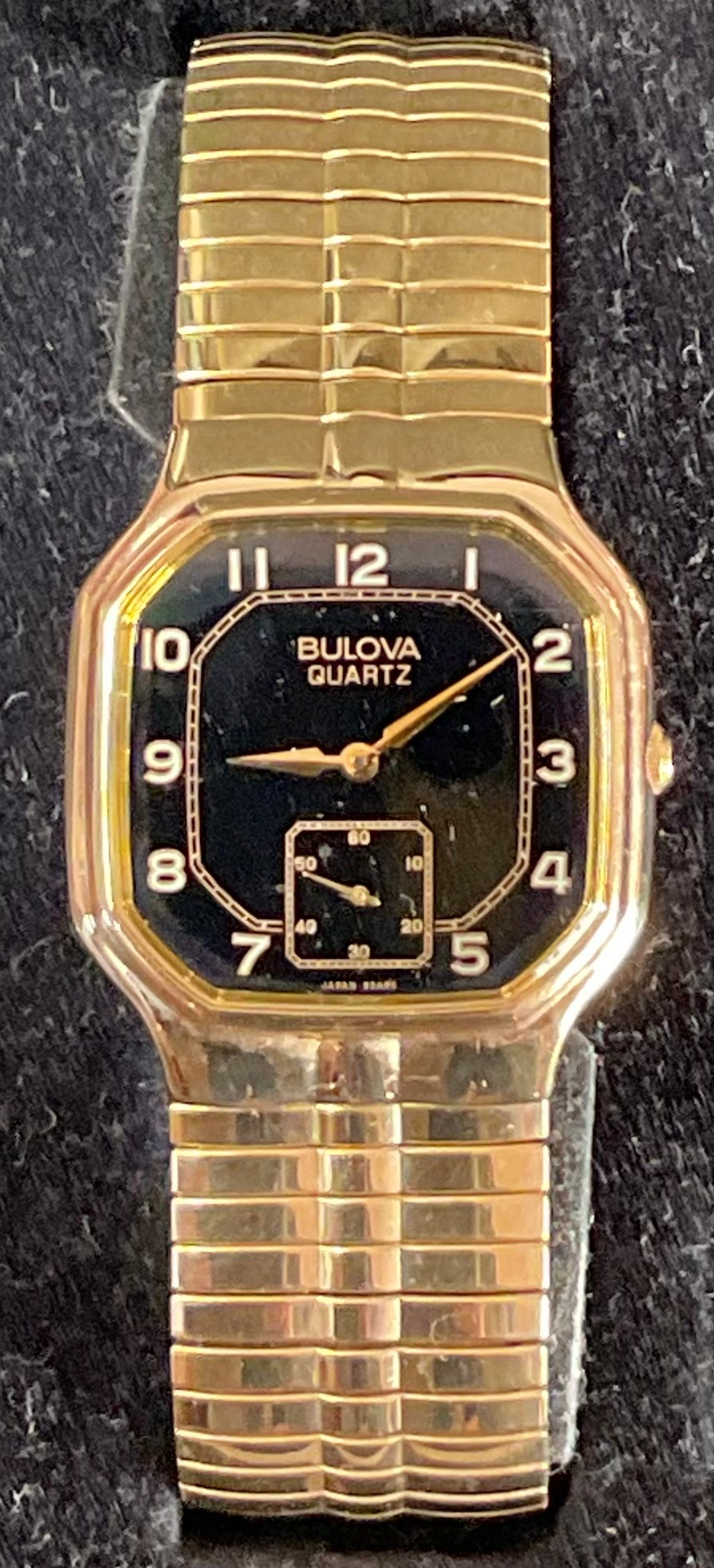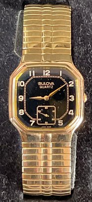 Vintage Bulova Octagon Face Gold Tone Watch - needs battery - stretch band - good used condition