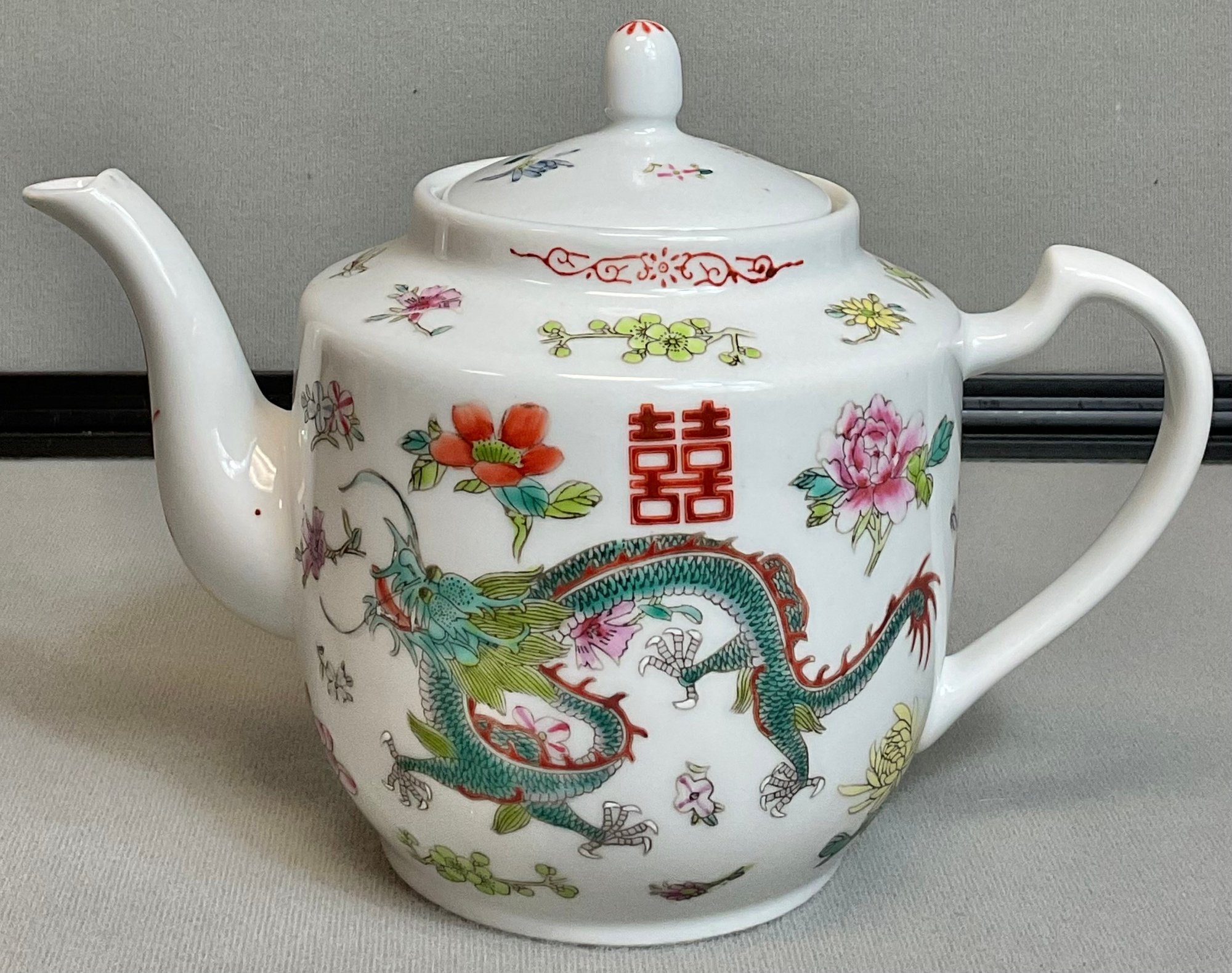 Vintage Chinese Famille Rose Dragon Teapot - 6.75” tall x 8.75” long x 4.75” wide - no chips - good used condition