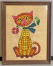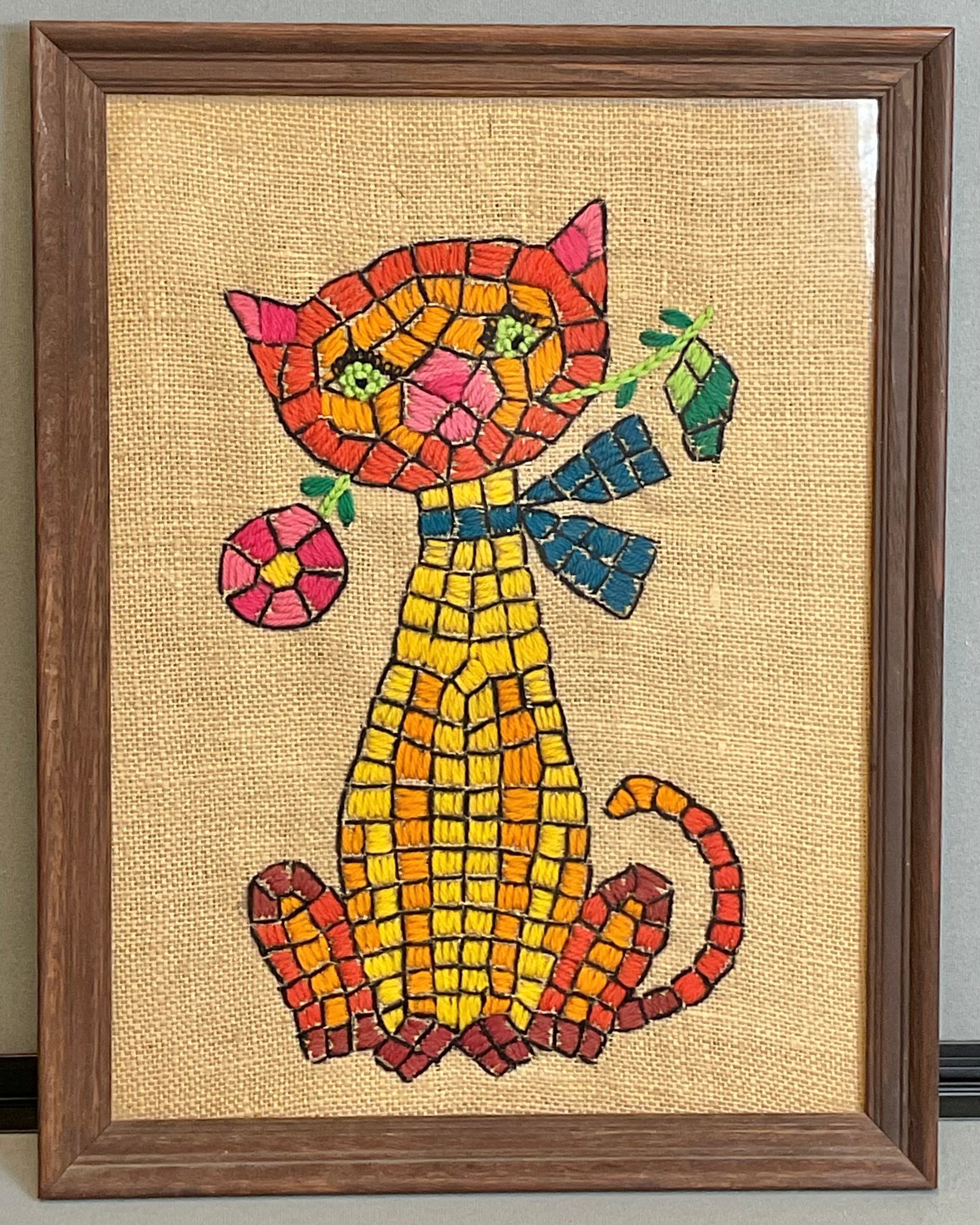 Vintage Crewel Embroidered Cat Art - 17.75” x 13.75” - good used condition