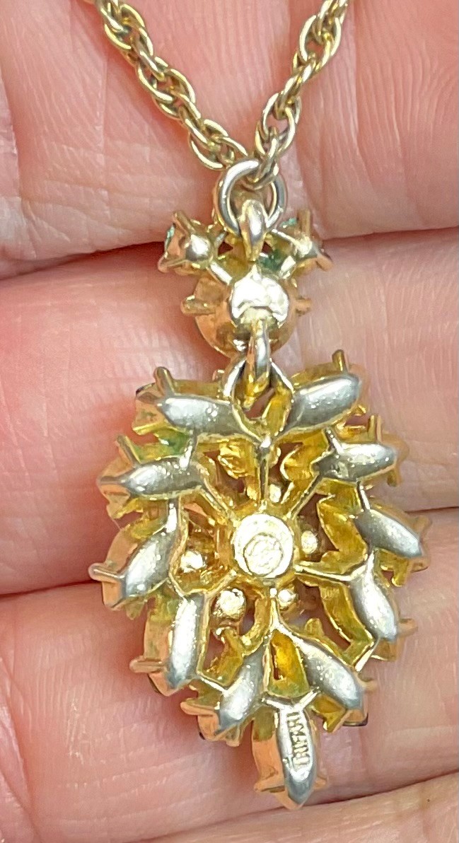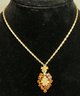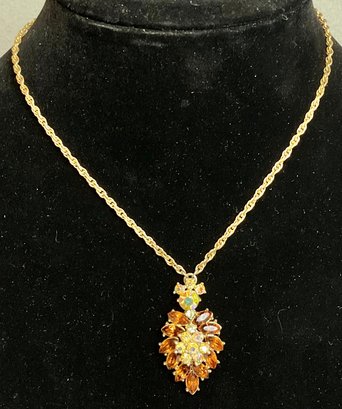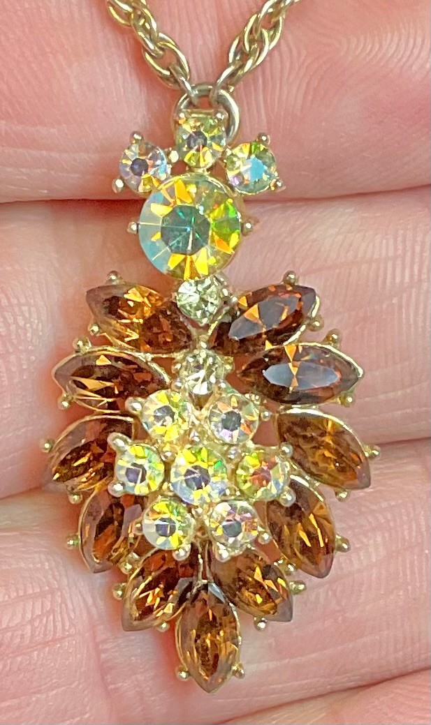 Vintage Crown Trifari Amber Crystal Pendant Necklace - 16” long - pendant 1.5” x 1” - good used condition