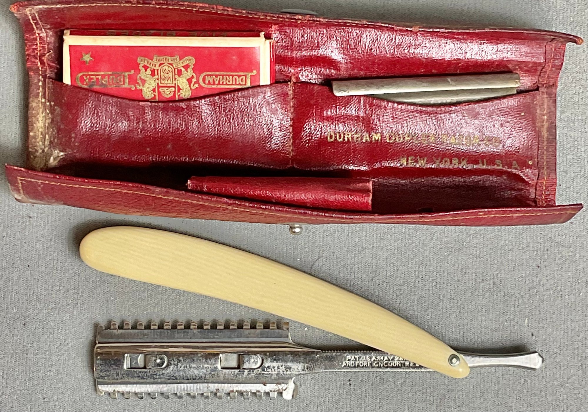 Vintage Durham Duplex Straight Razor/ Hair Shaper - original pouch with extra blades - celluloid handle - good used condition