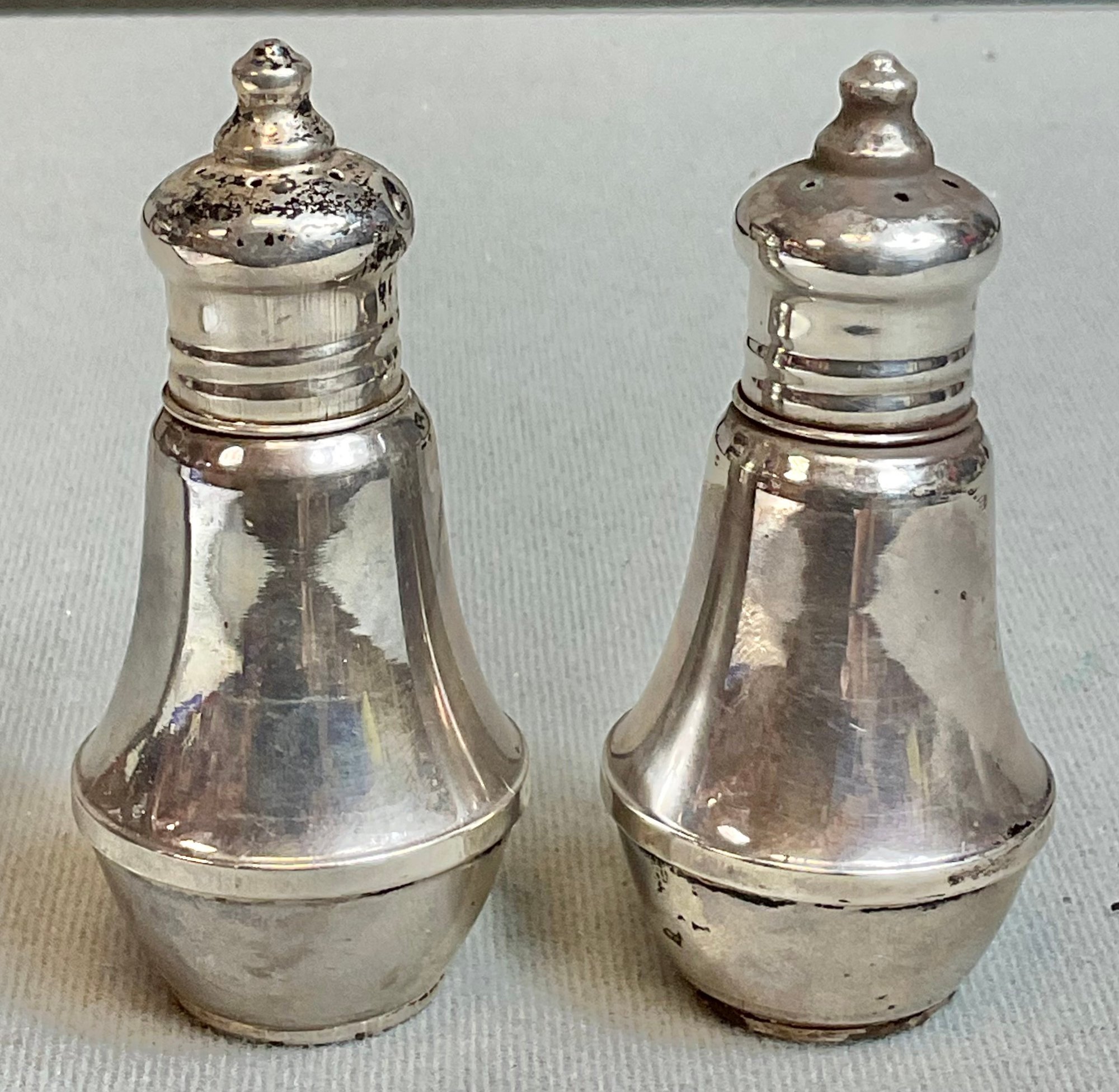 Vintage Glass Lined Sterling Salt & Pepper Shakers - 3.5” tall - good used condition