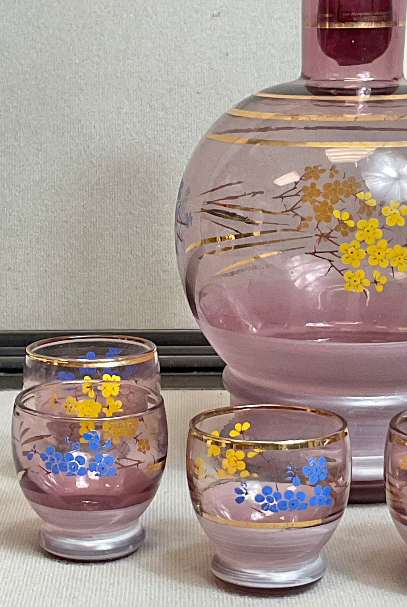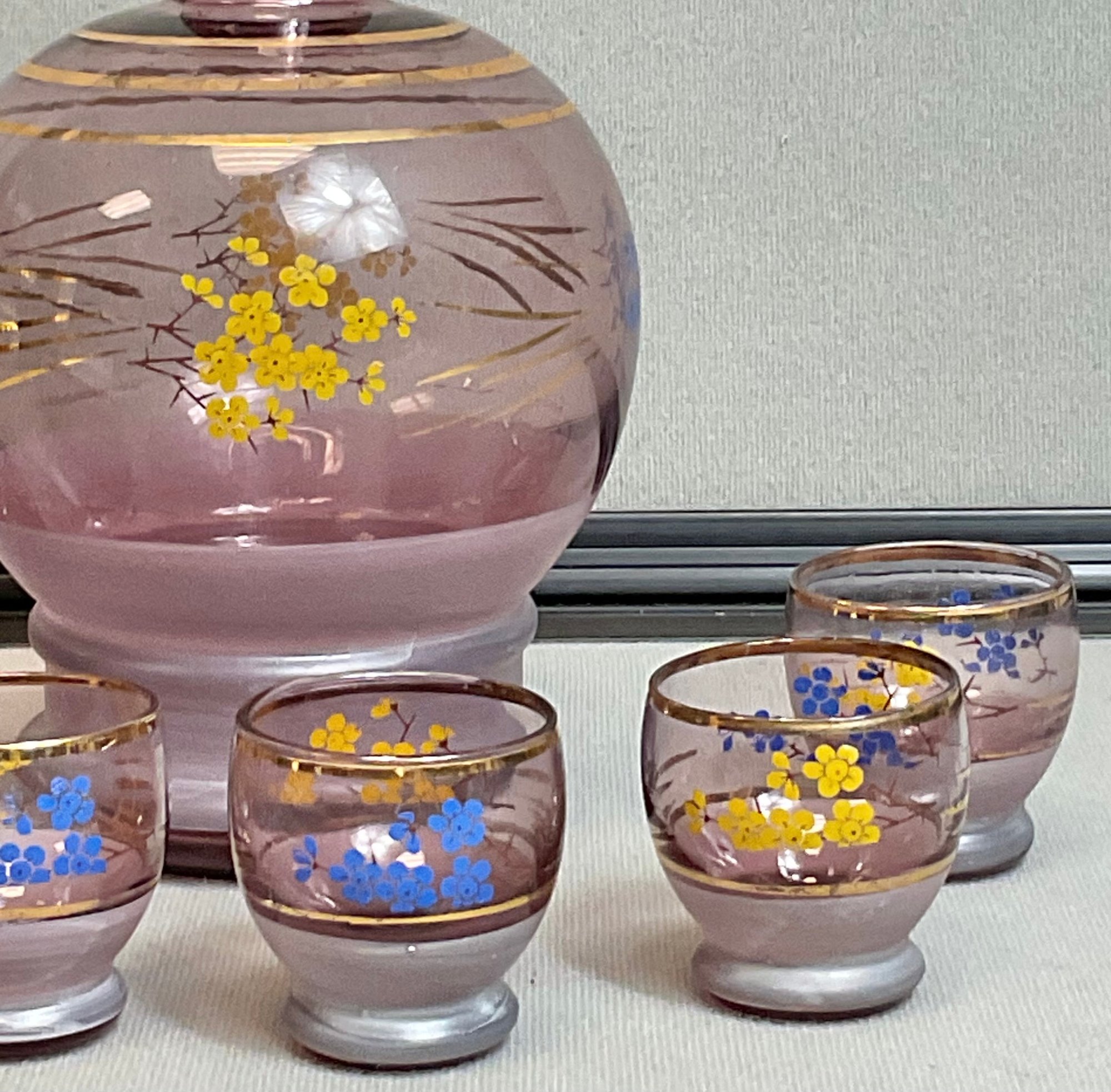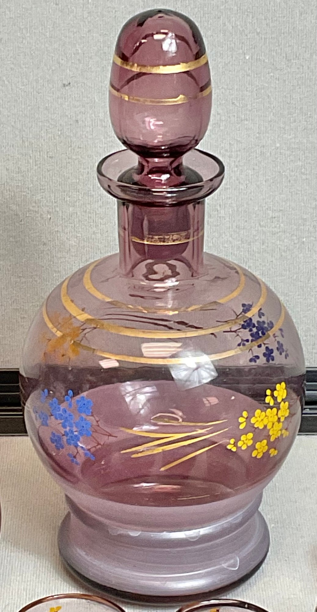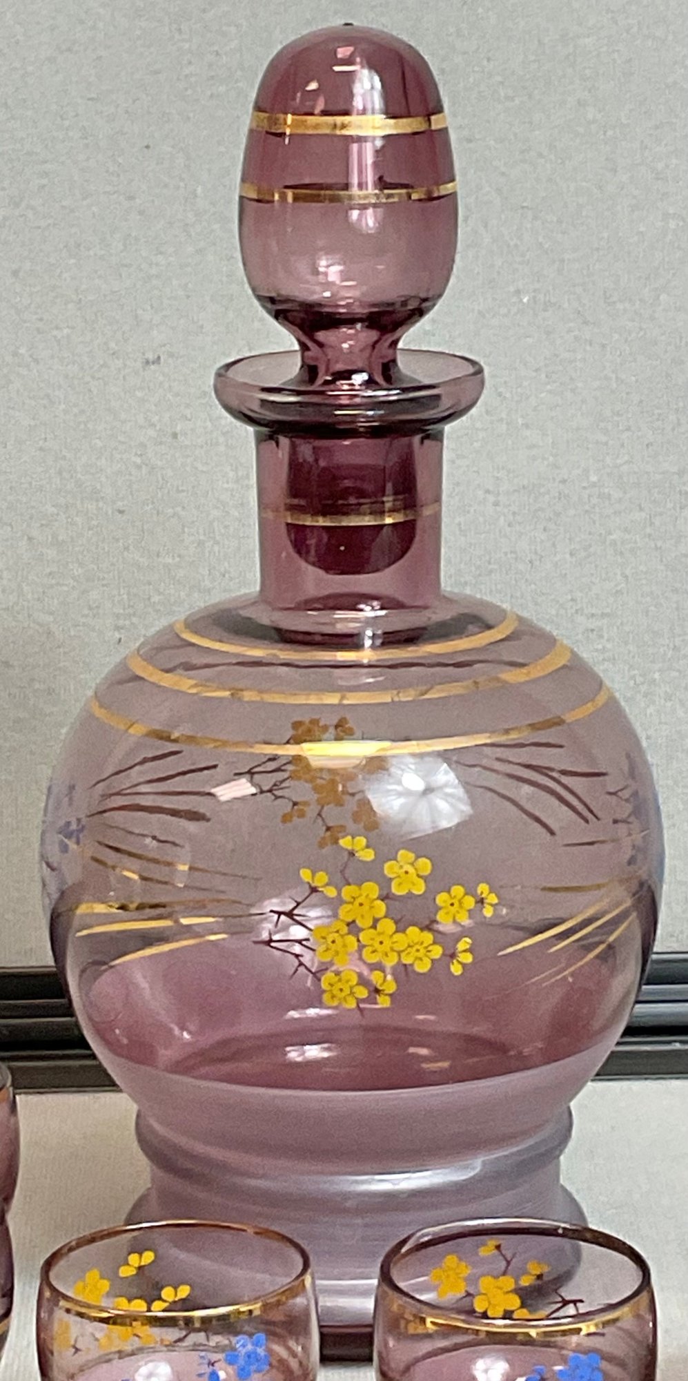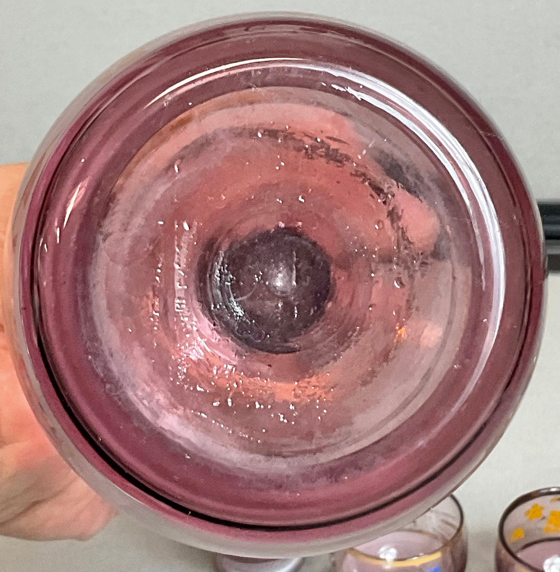 Vintage Hand Blown Purple Amethyst Glass Decanter Set W/ 6 Shot Glasses - decanter 9” tall - shot glasses 1.75” tall - no chips - good used condition
