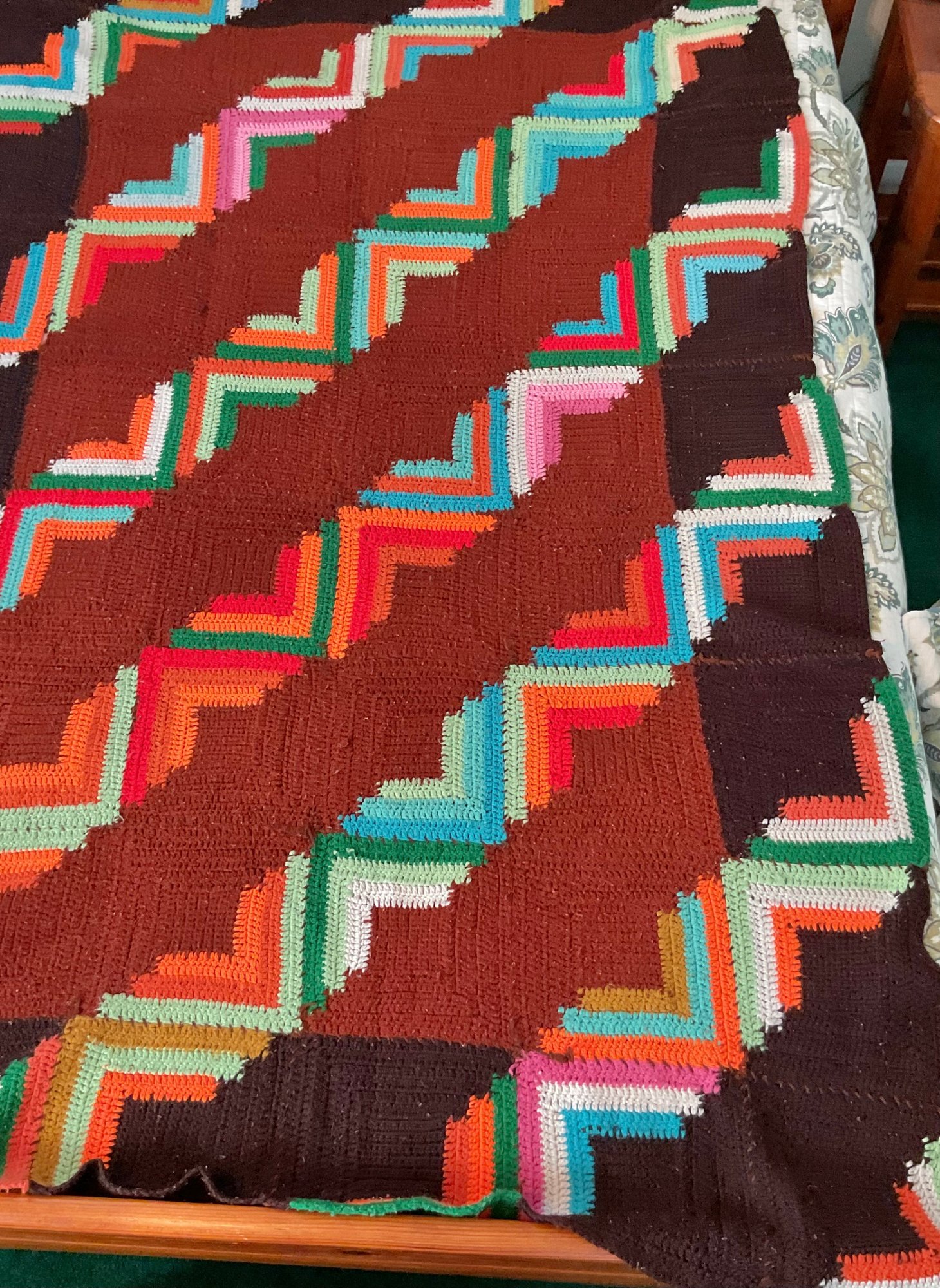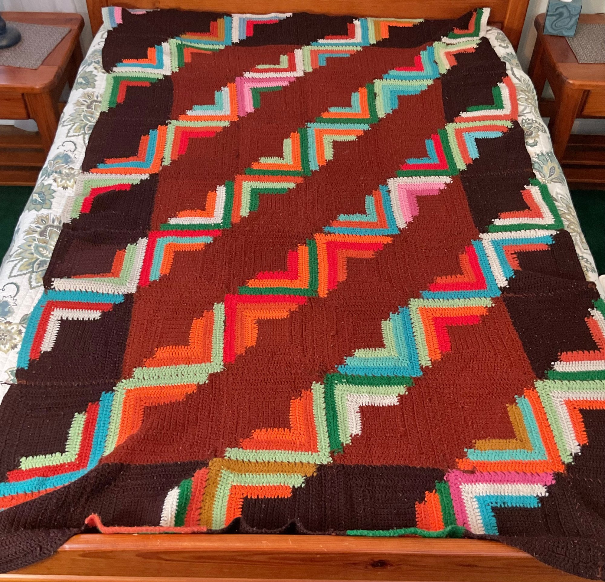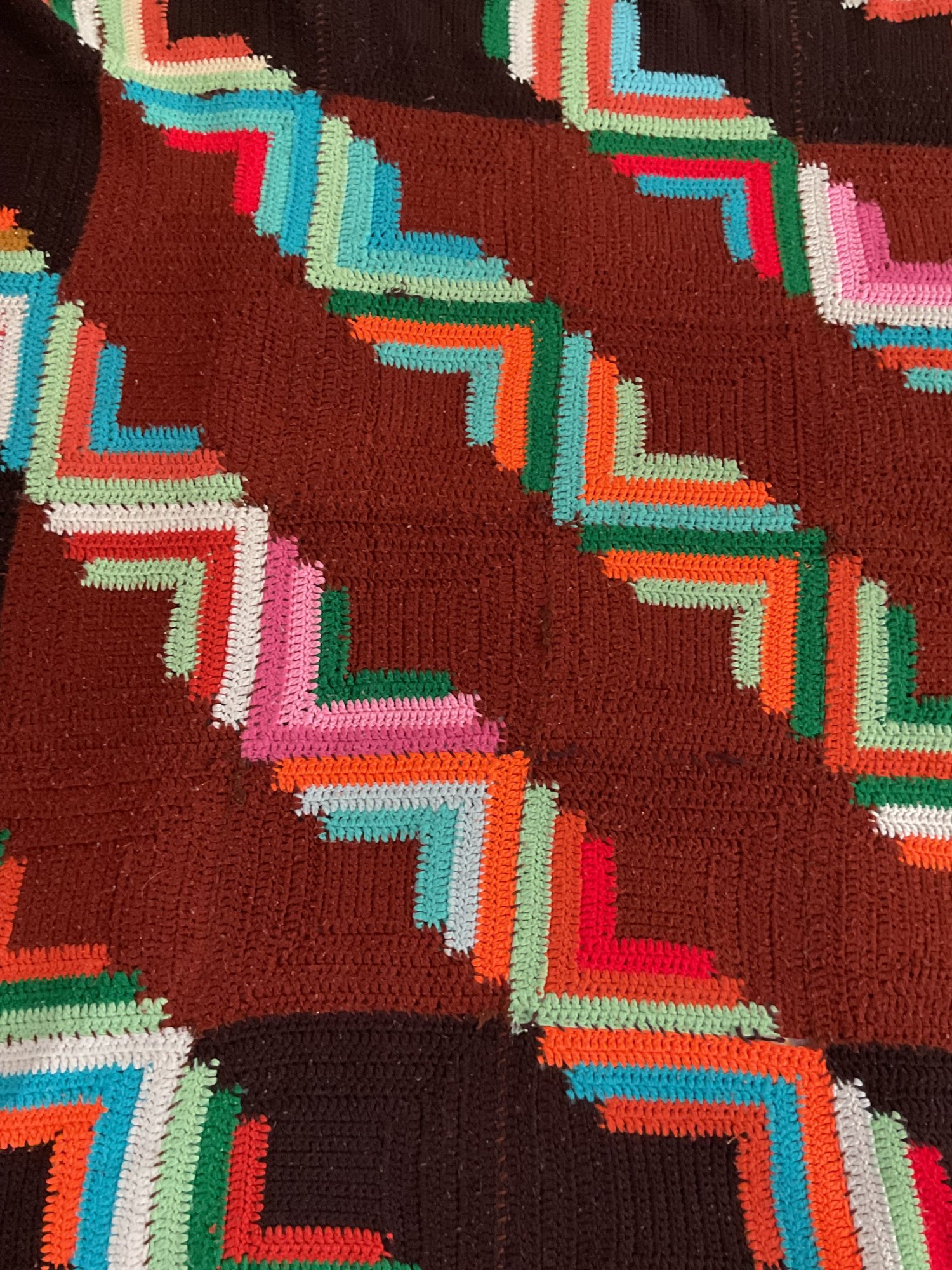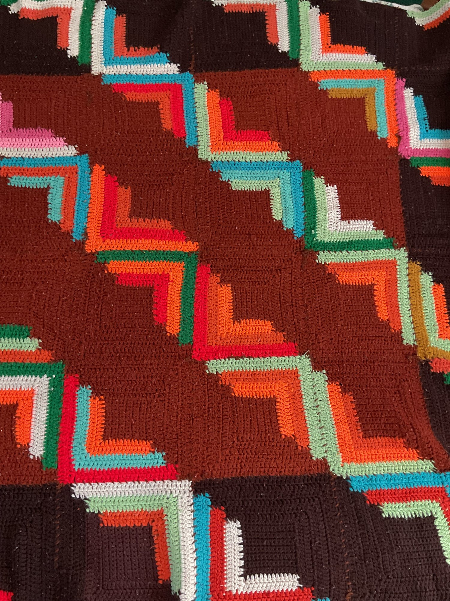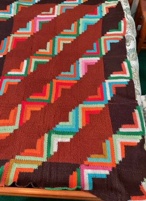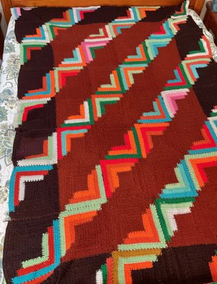 Vintage Hand Made Crochet Geometric Blanket - 1 hole - 85” x 52” - good used condition