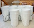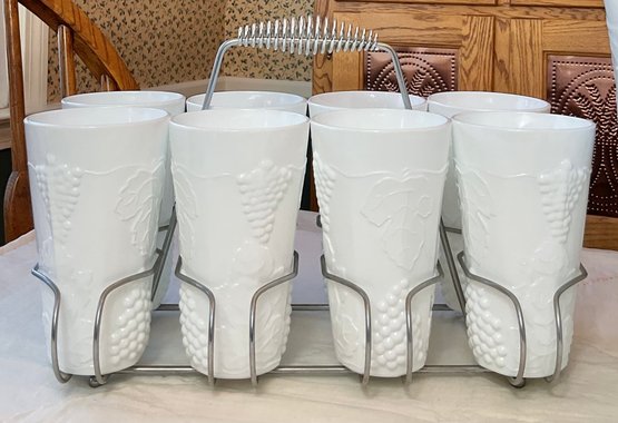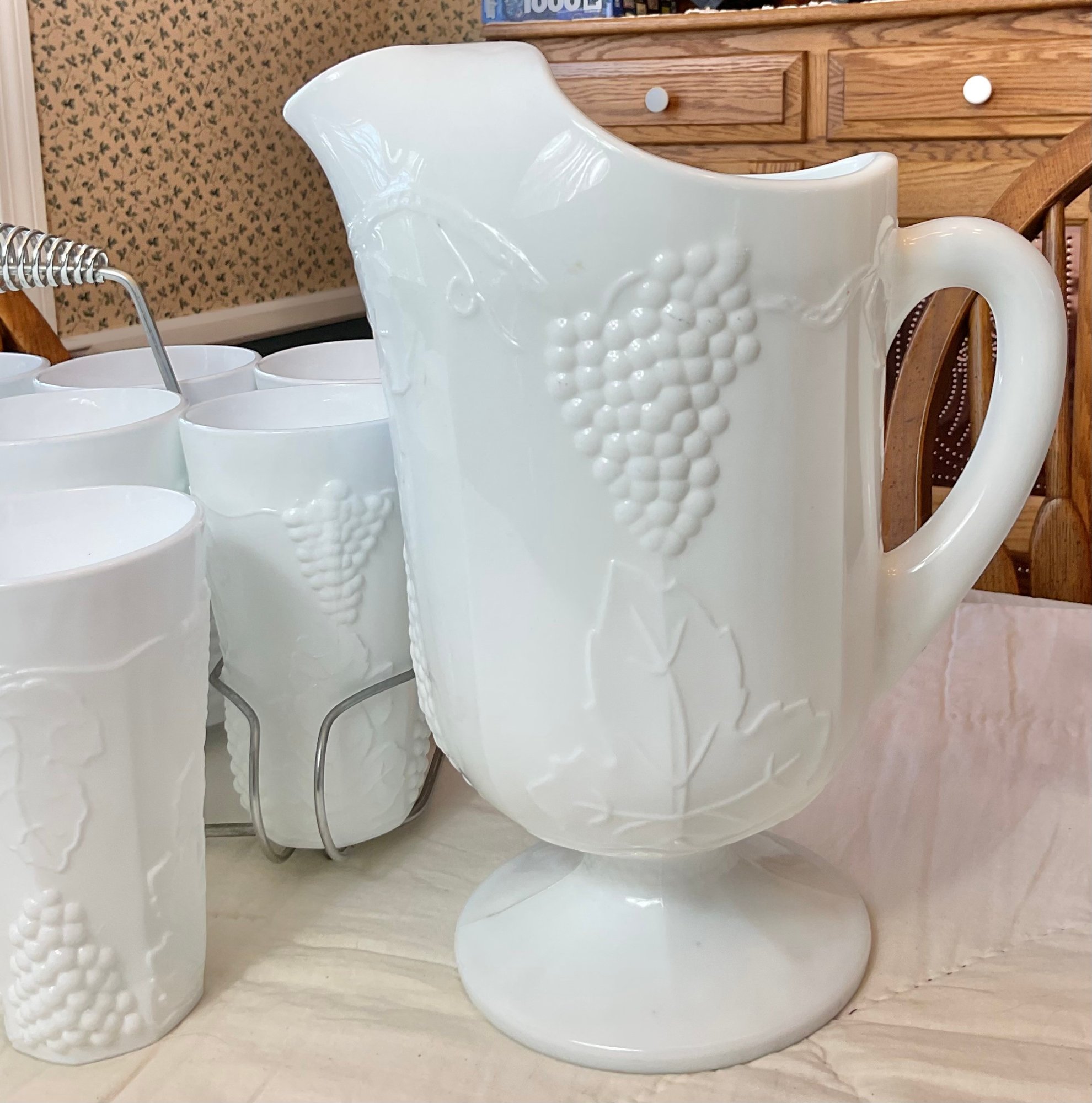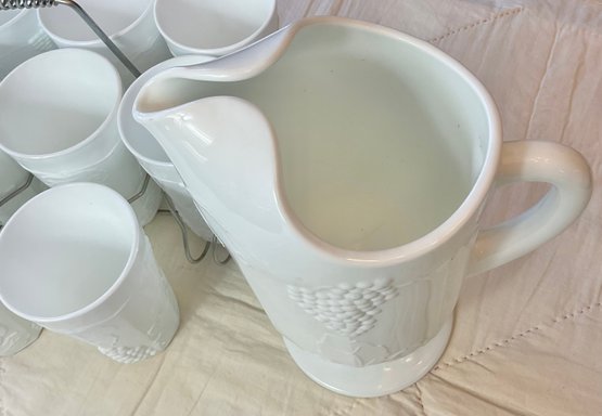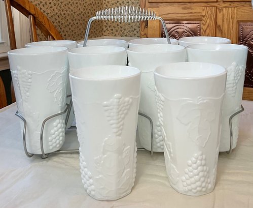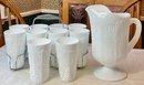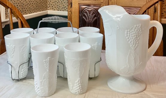 Vintage Indiana Colony Milk Glass Harvest White Pitcher & 10 Glasses with carrier - no chips - pitcher 11” tall - glasses 6” tall - good used condition