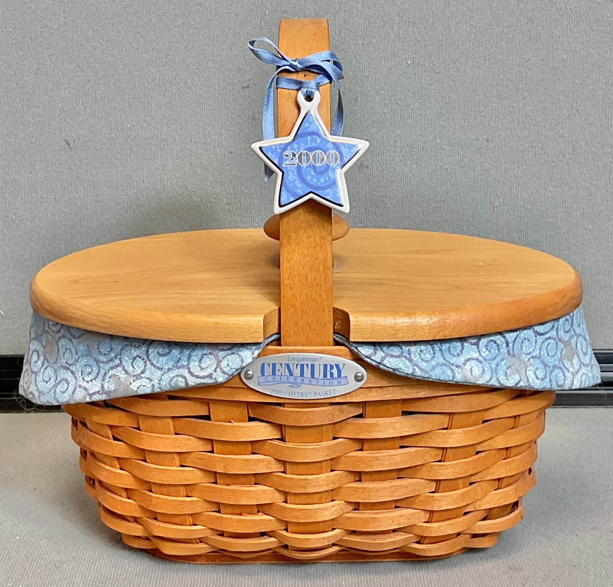 Vintage Longaberger Century Celebration 2000 Cheers Basket - with wood top, fabric & plastic liner - 4” tall (not including handle) x 8” x 4.5” - good used condition