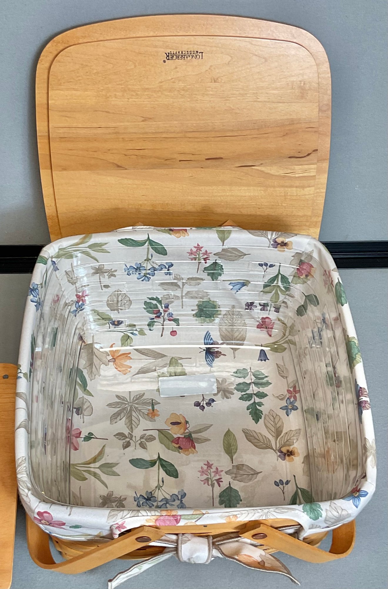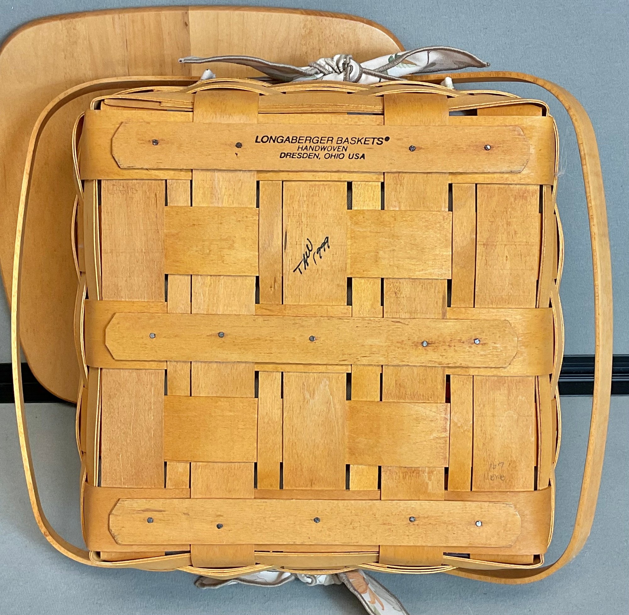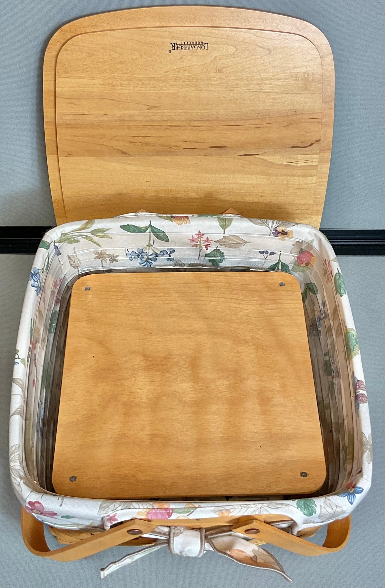 Vintage Longaberger Pie Basket - with wood lid and riser - has fabric and plastic liner - 6.75” tall (not including handle) x 12.75” x 12.5”. - good used condition