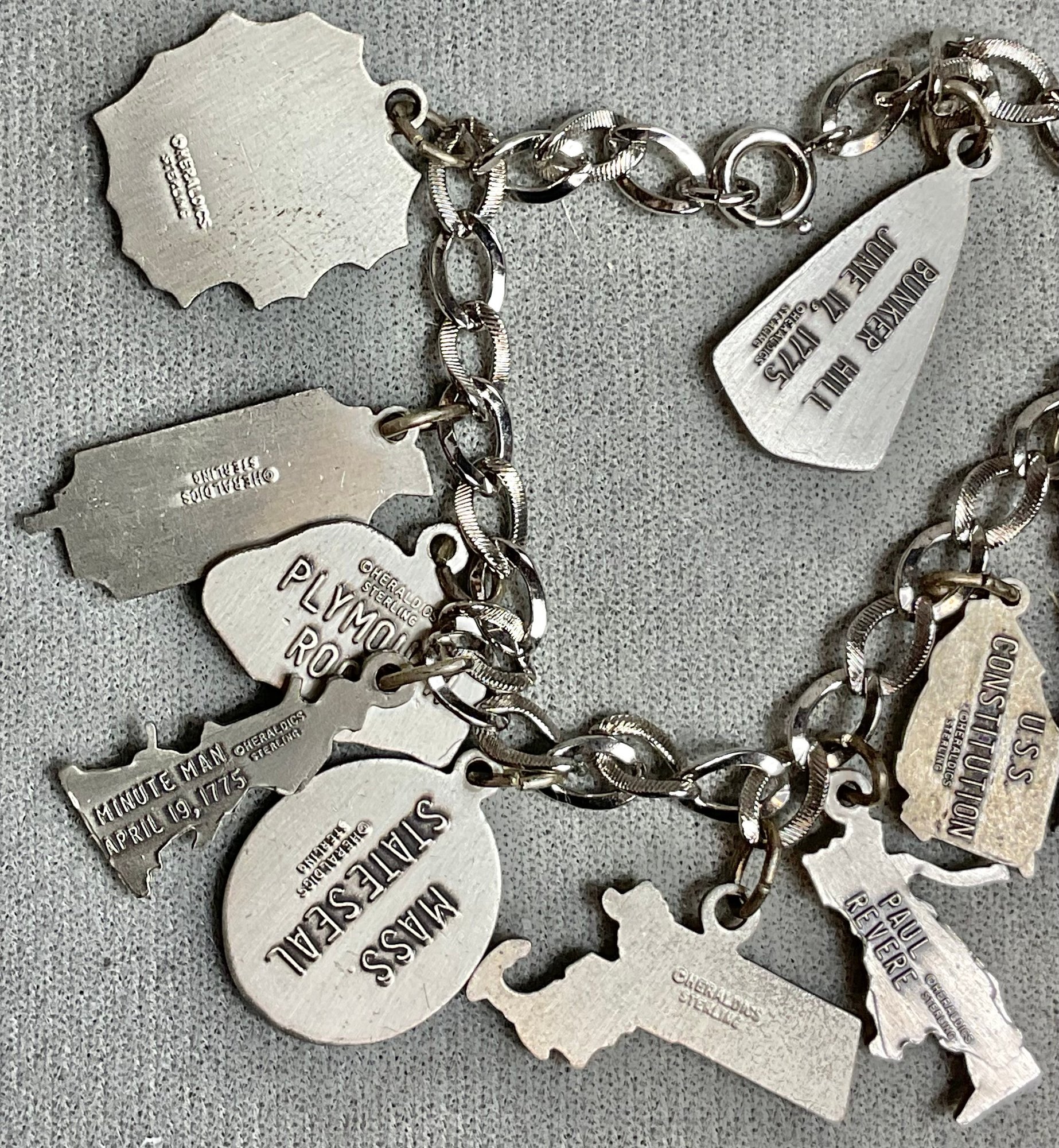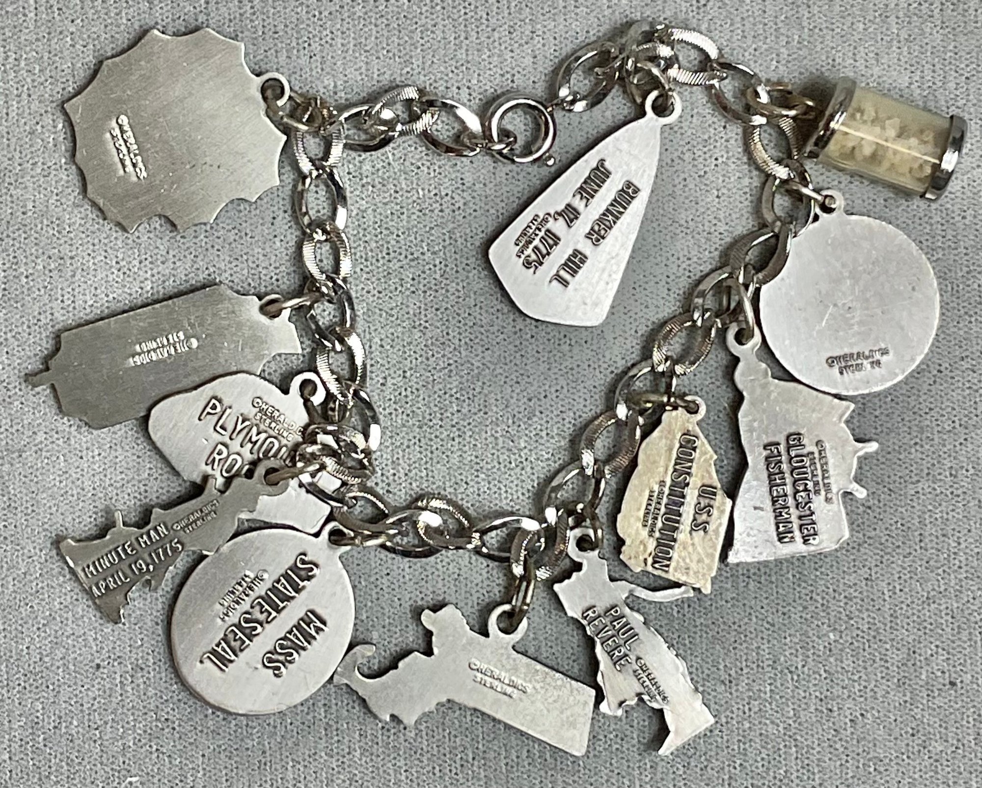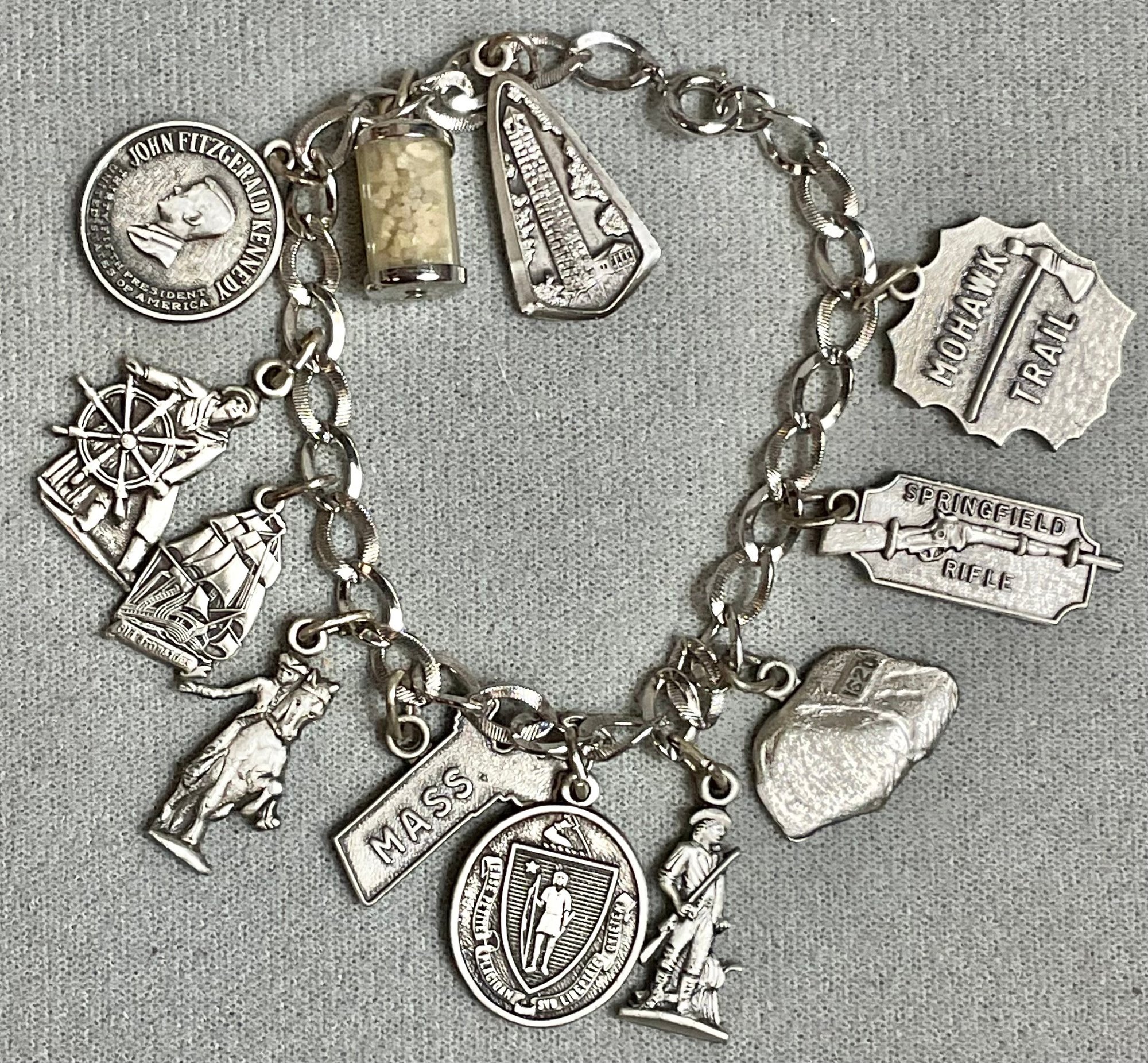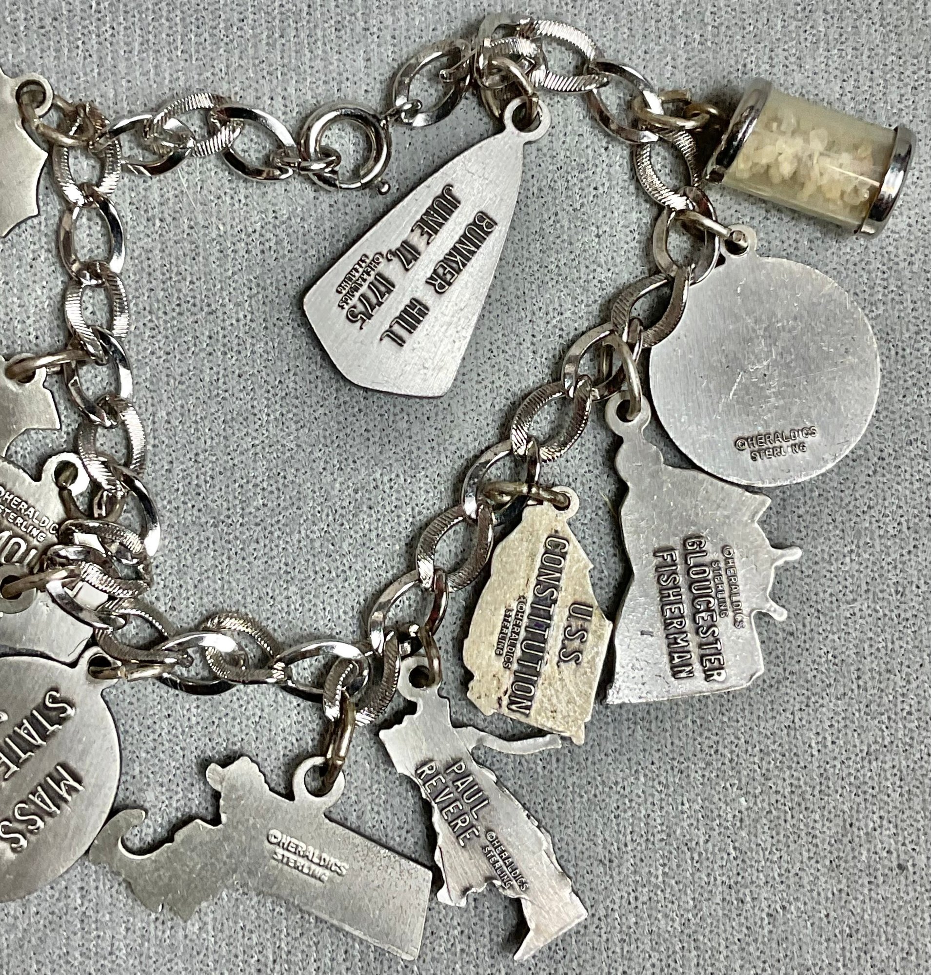 Vintage Massachusetts Theme Sterling Charm Bracelet - 7” long - weighs 37.5 grams - good used condition