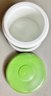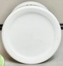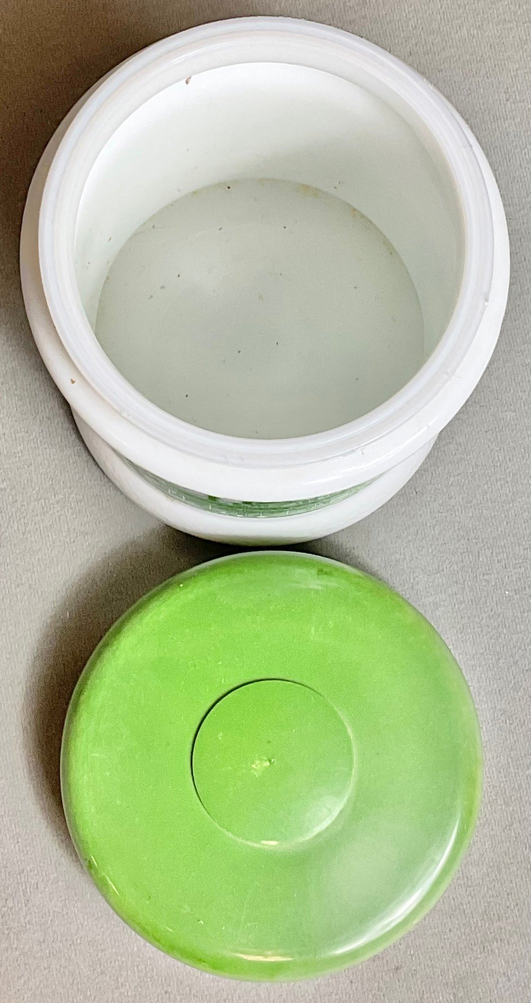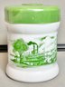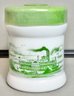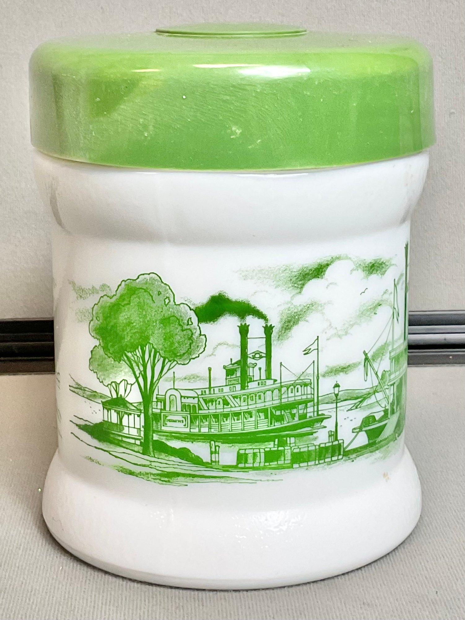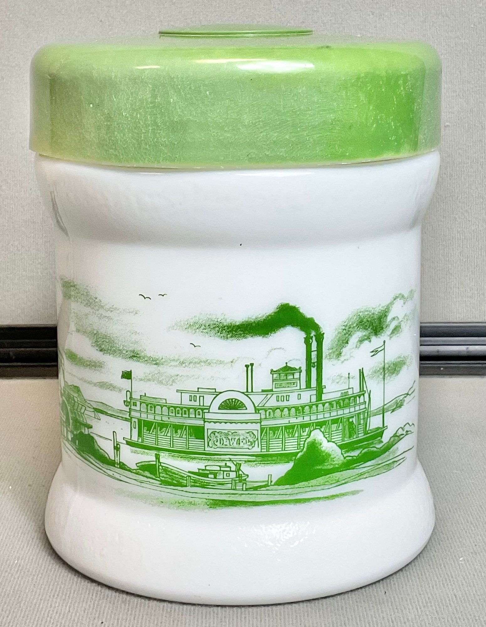 Vintage Milk Glass Canister W/ Riverboat Theme - plastic lid - 6.25” tall x 5” wide - good used condition