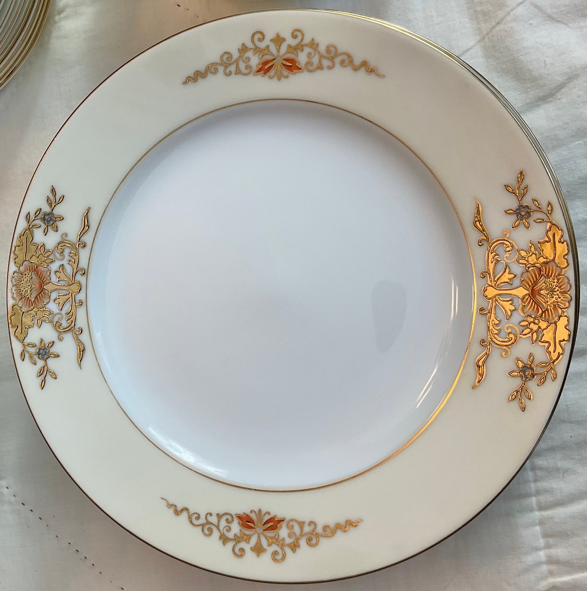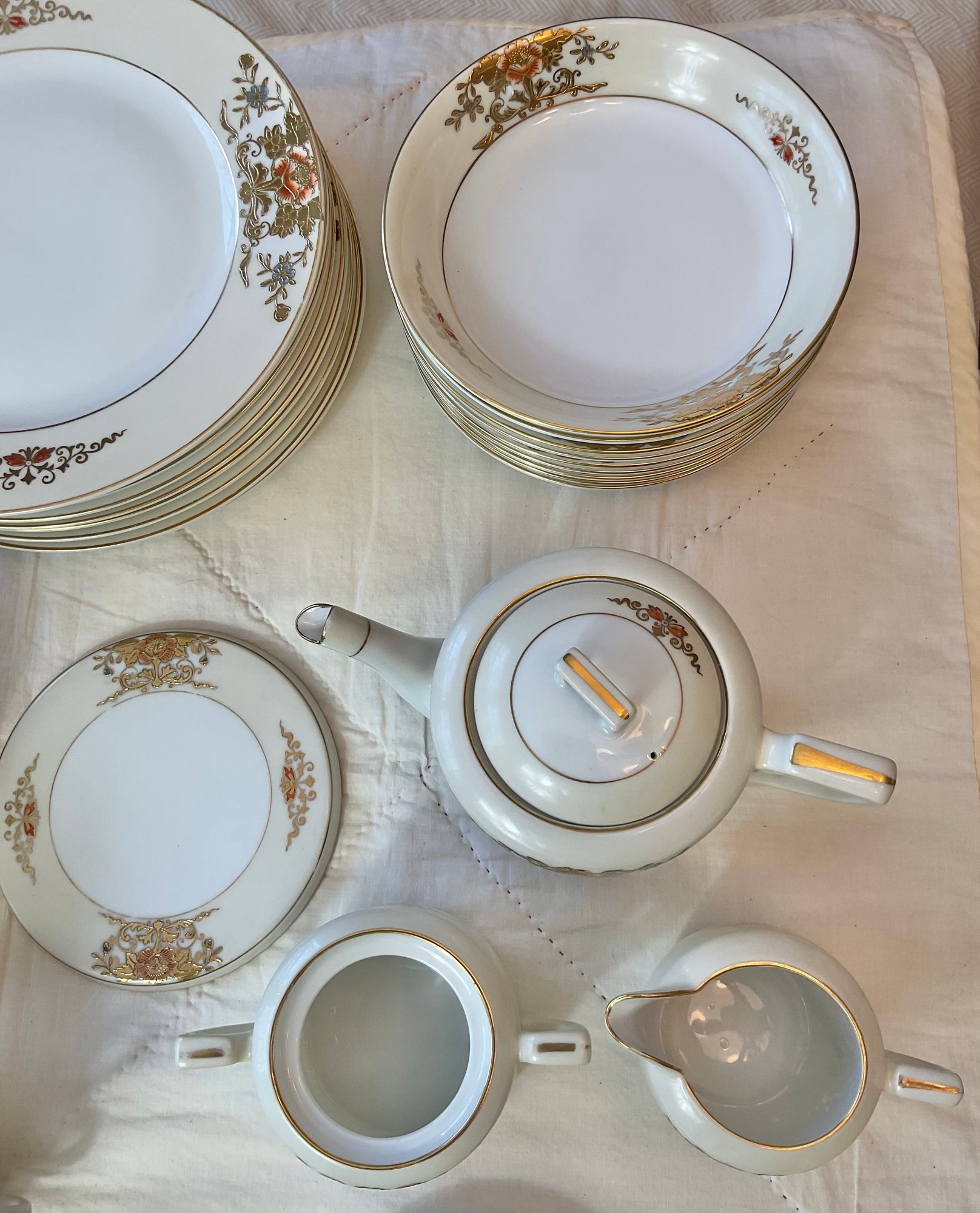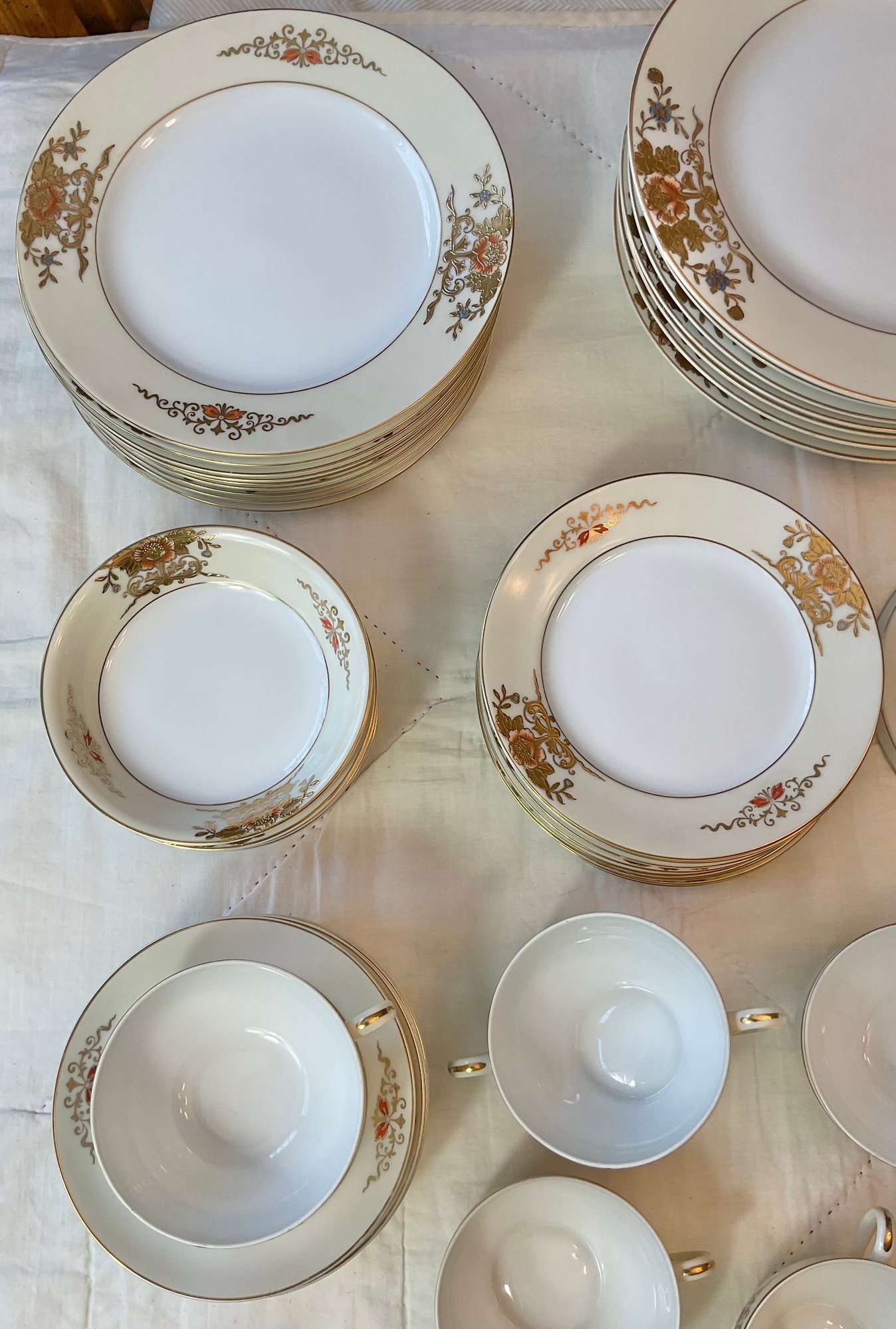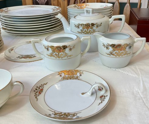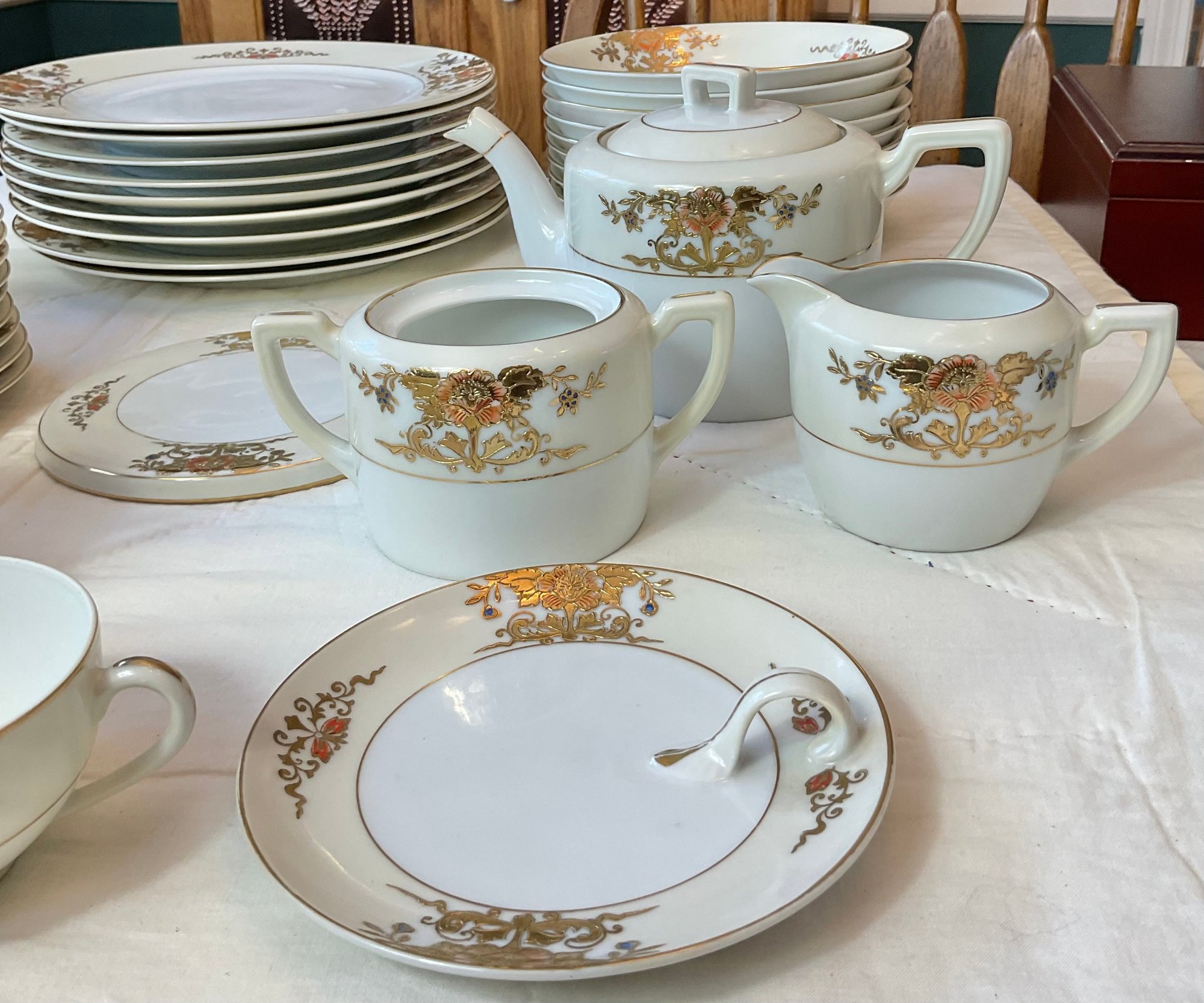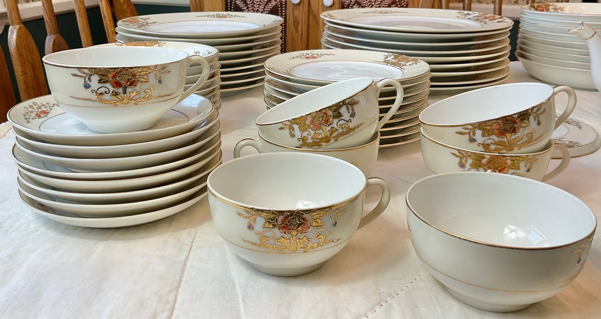 Vintage Noritake Gold Moriage China - no chips - 9 dinner plates 10” - 9 salad plates 8.5” - 9 soup bowls 7 3/8” - 9 berry bowls 5.25” - 8 cups 2” & saucers 5.5” - teapot 5” tall - sugar bowl (missing lid) 3” - creamer 3” - trivet 6” - lemon dish 5 5/8” - beautiful set - 57pc -good used condition